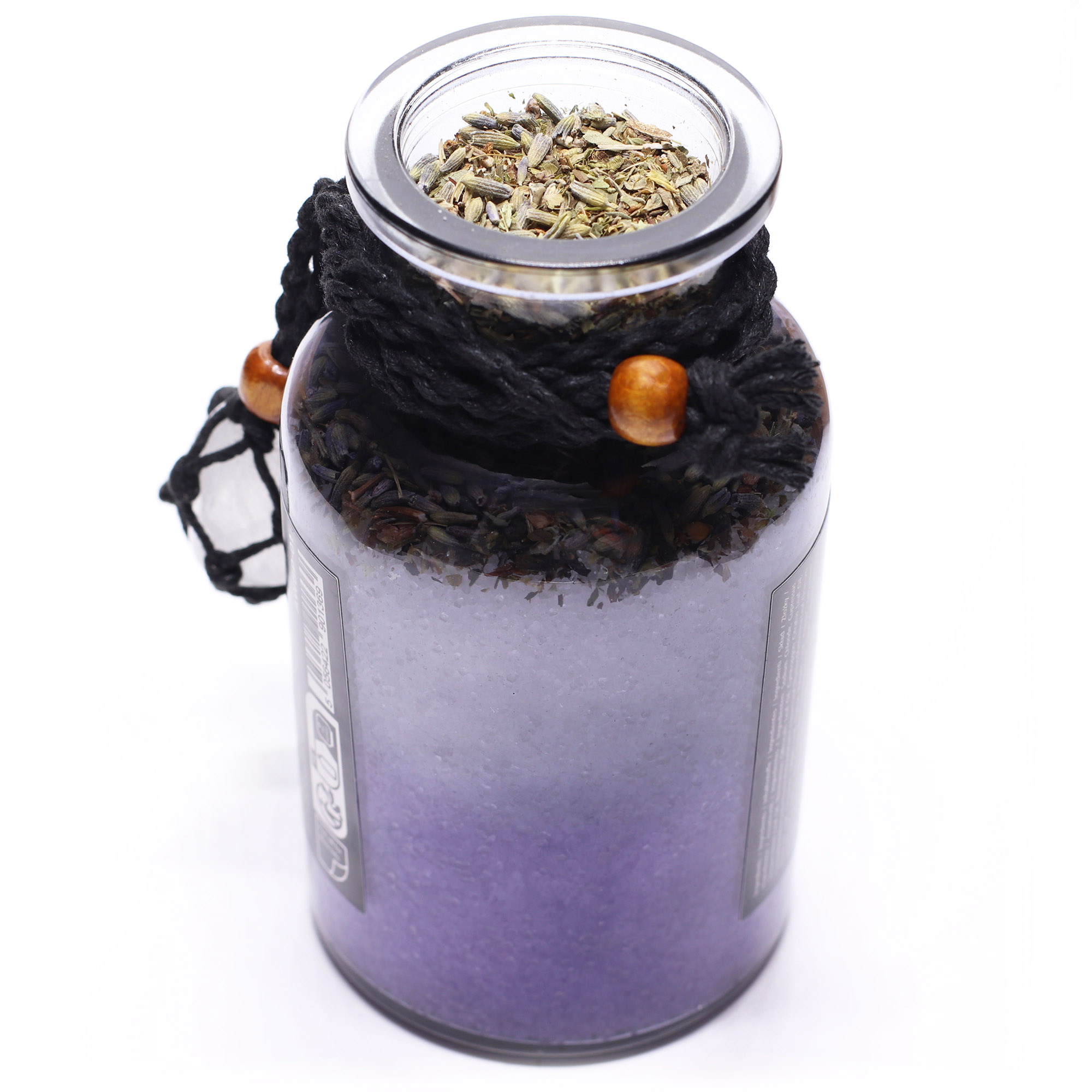 This blend of himalayan salt, lavender, and herbs is infused with cypress, rosemary, and lemongrass essential oils, all chosen for their cleansing energy and grounding aroma. Around the bottle neck hangs a Rock Quartz tumble stone necklace, linked to clarity and energetic balance.