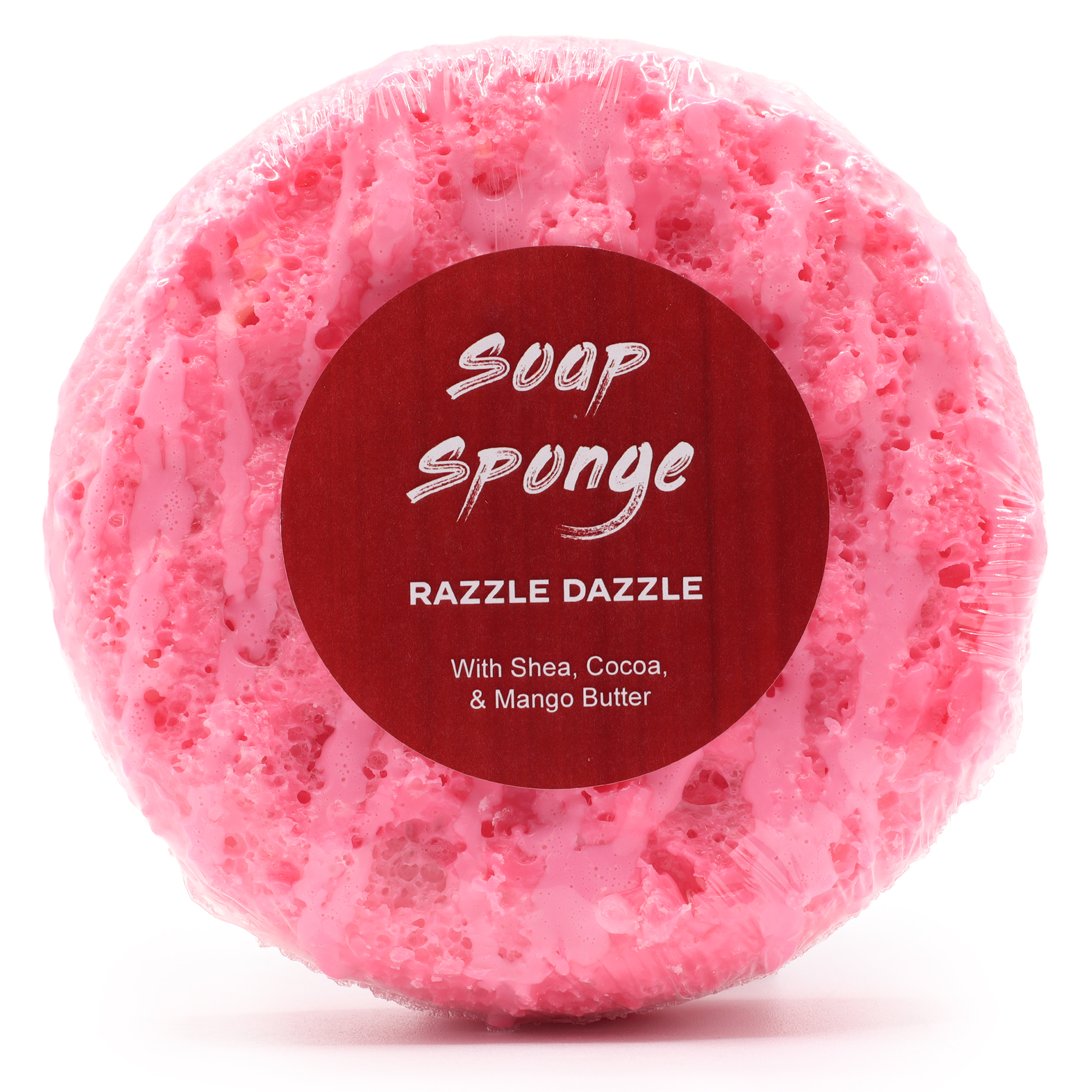 The Razzle Dazzle Butter Bubble Soap-infused Sponge features a sweet raspberry slush fragrance, combining a fruity scent with a practical exfoliating design. Each sponge contains approximately 220g of soap and is enriched with a nourishing blend of Cocoa, Shea, and Mango Seed Butters to ensure a smooth washing experience.