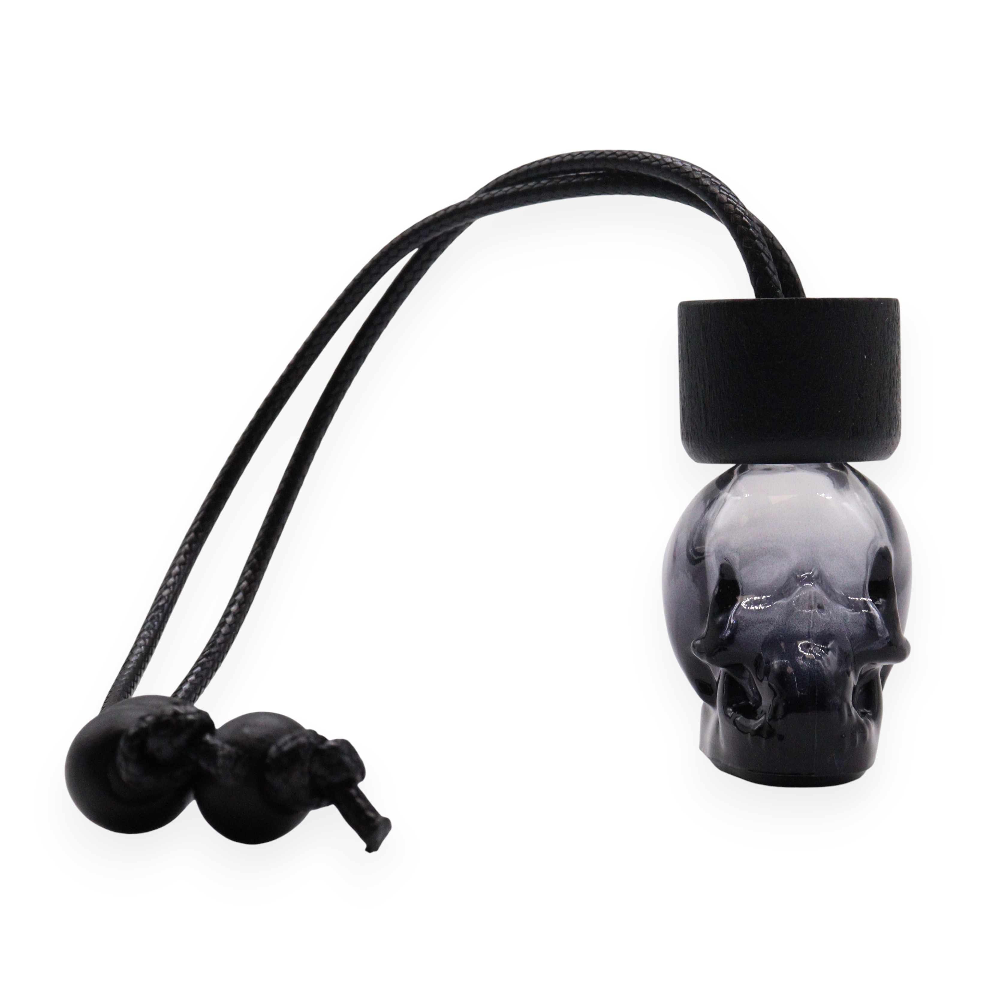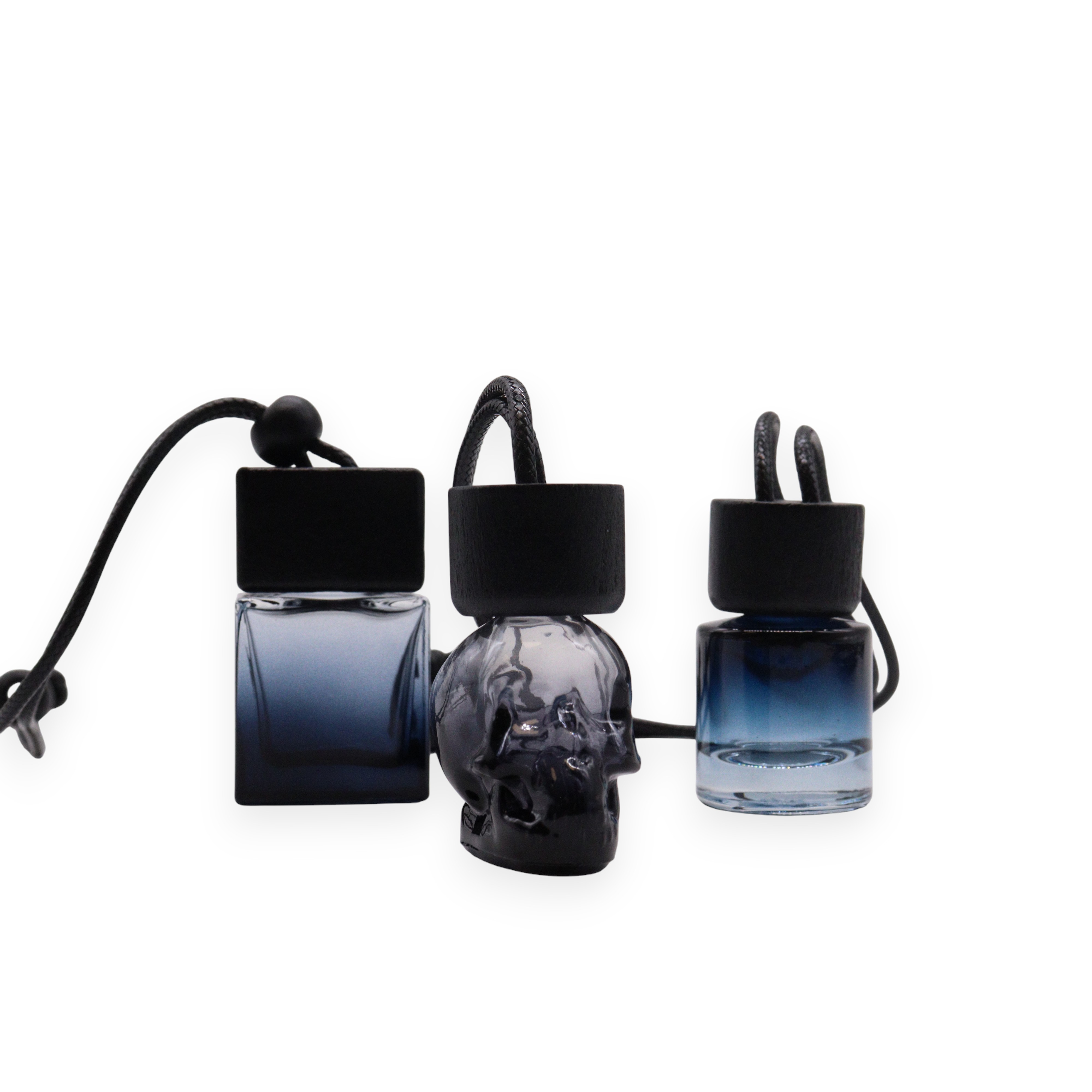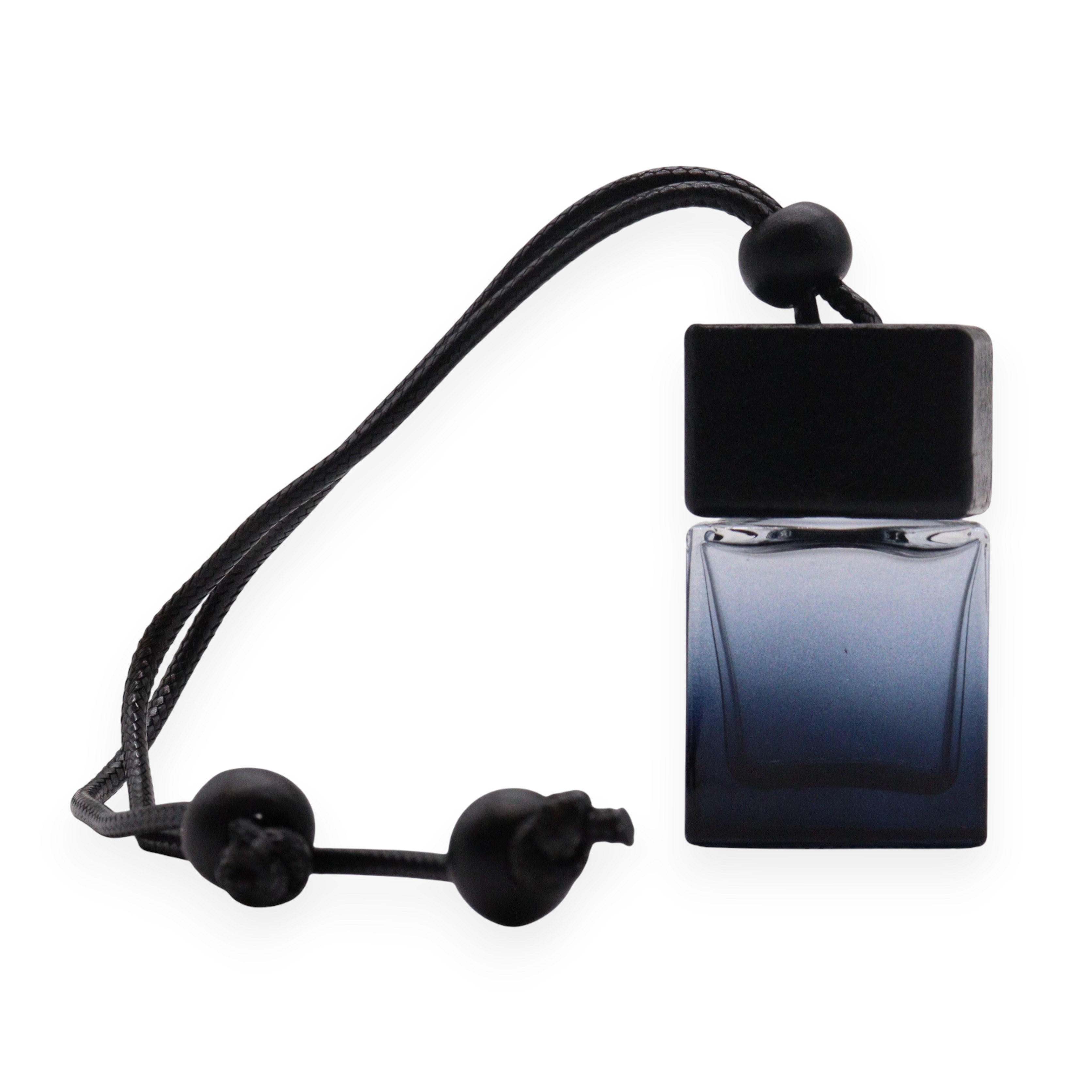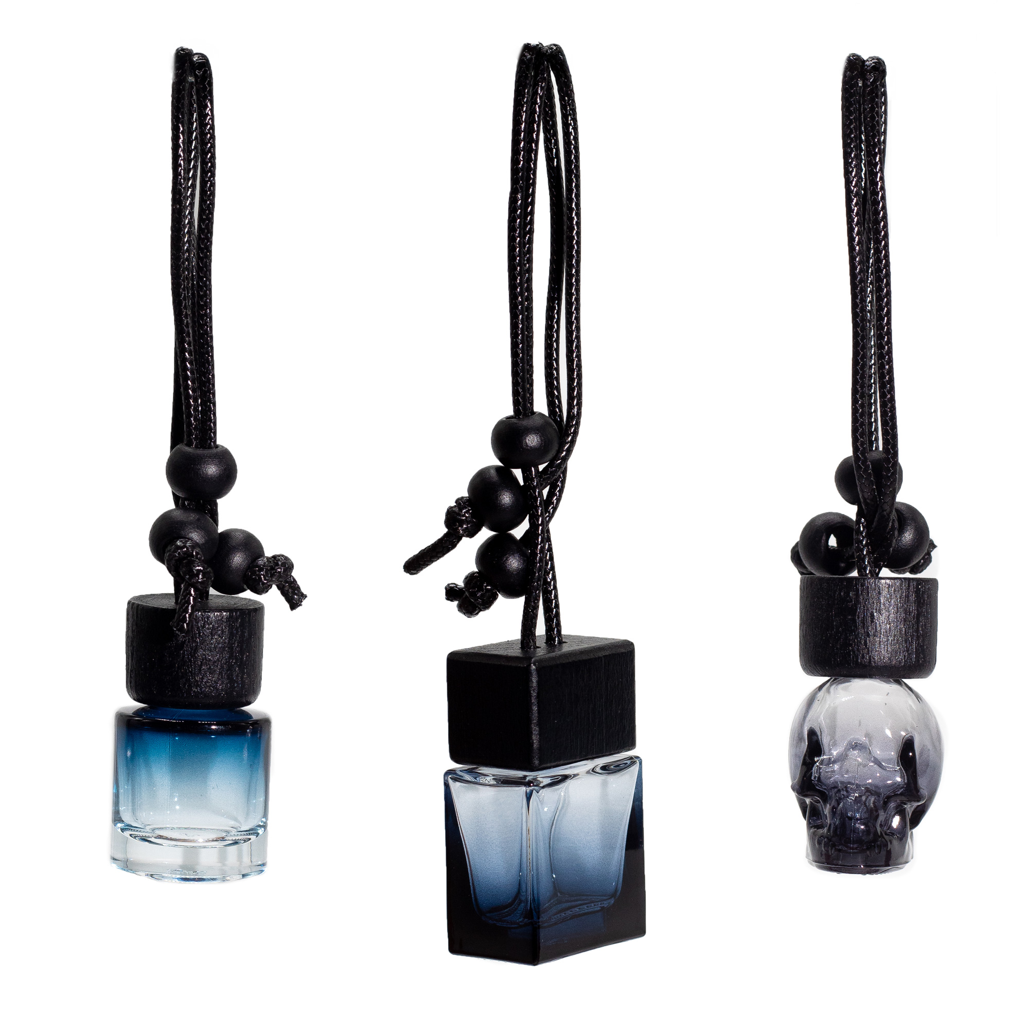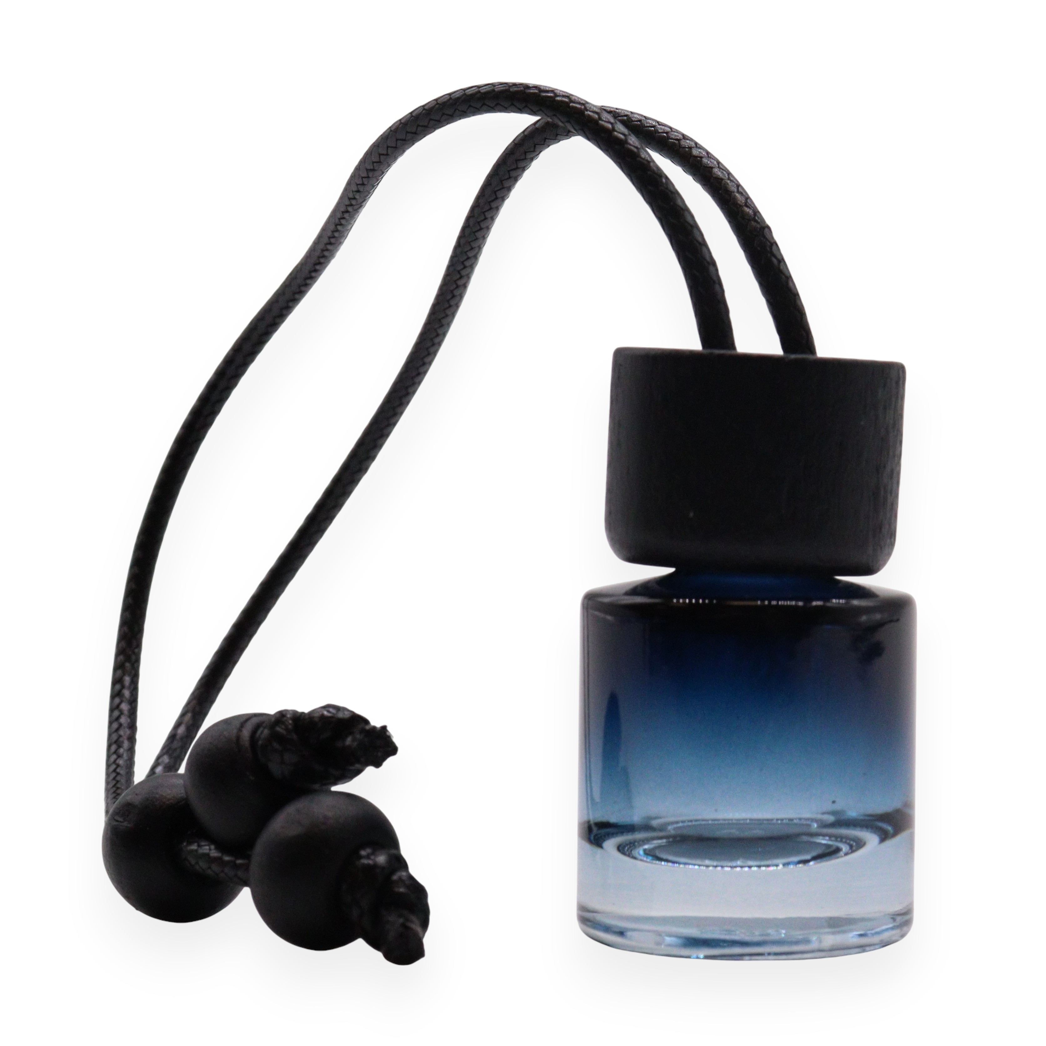 A stylish option for custom car fragrances, these hanging diffuser bottles feature dark blue glass and black wooden caps for a sleek, contemporary finish.