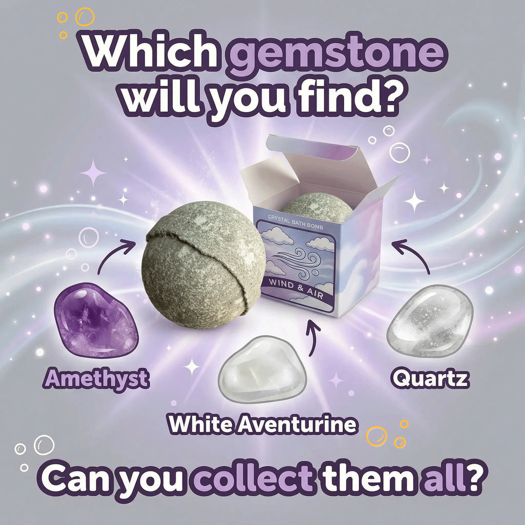 Drift into calm with the Crystal Bath Bomb – Air by Ancient Wisdom. This 180g bath bomb dissolves into a soft grey hue, capturing the lightness and freedom of air. Inside, discover one of three gemstones: