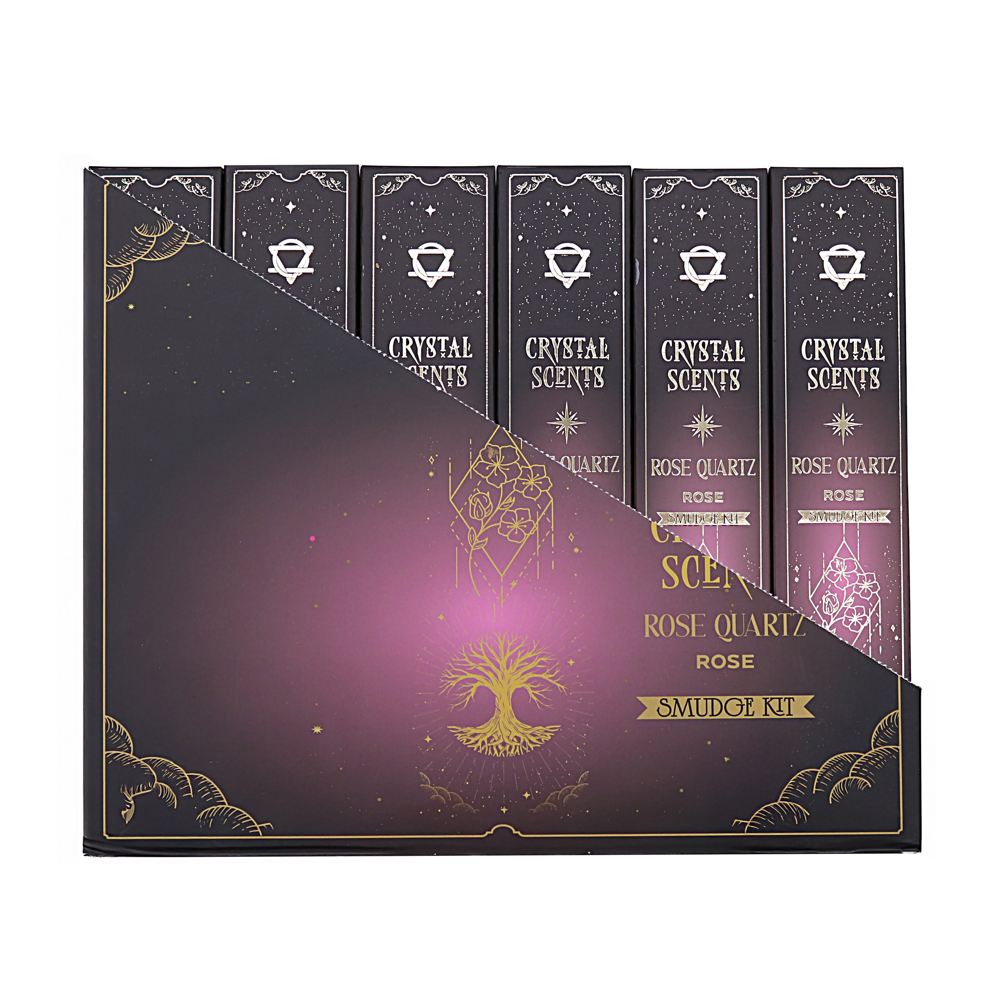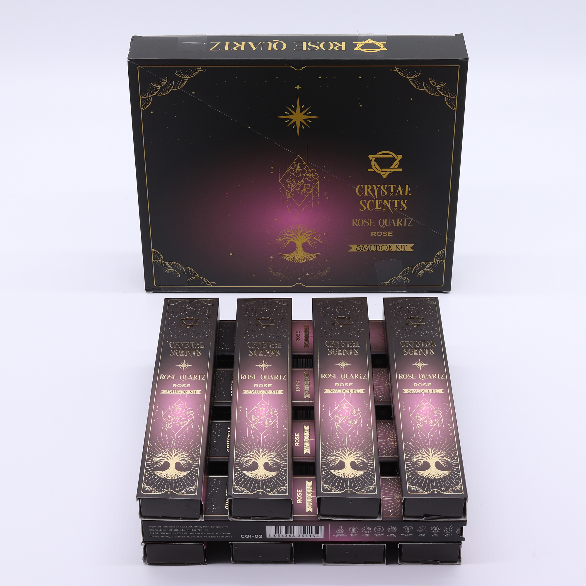 Invite softness, love, and a touch of elegance into your store’s fragrance section with our Rose Quartz Crystal Scents Smudge Incense. Each retail-ready pack features 10 handcrafted rose-scented smudge sticks, infused with delicate floral notes and finished with a pink-tinted incense stem that echoes the fragrance within.