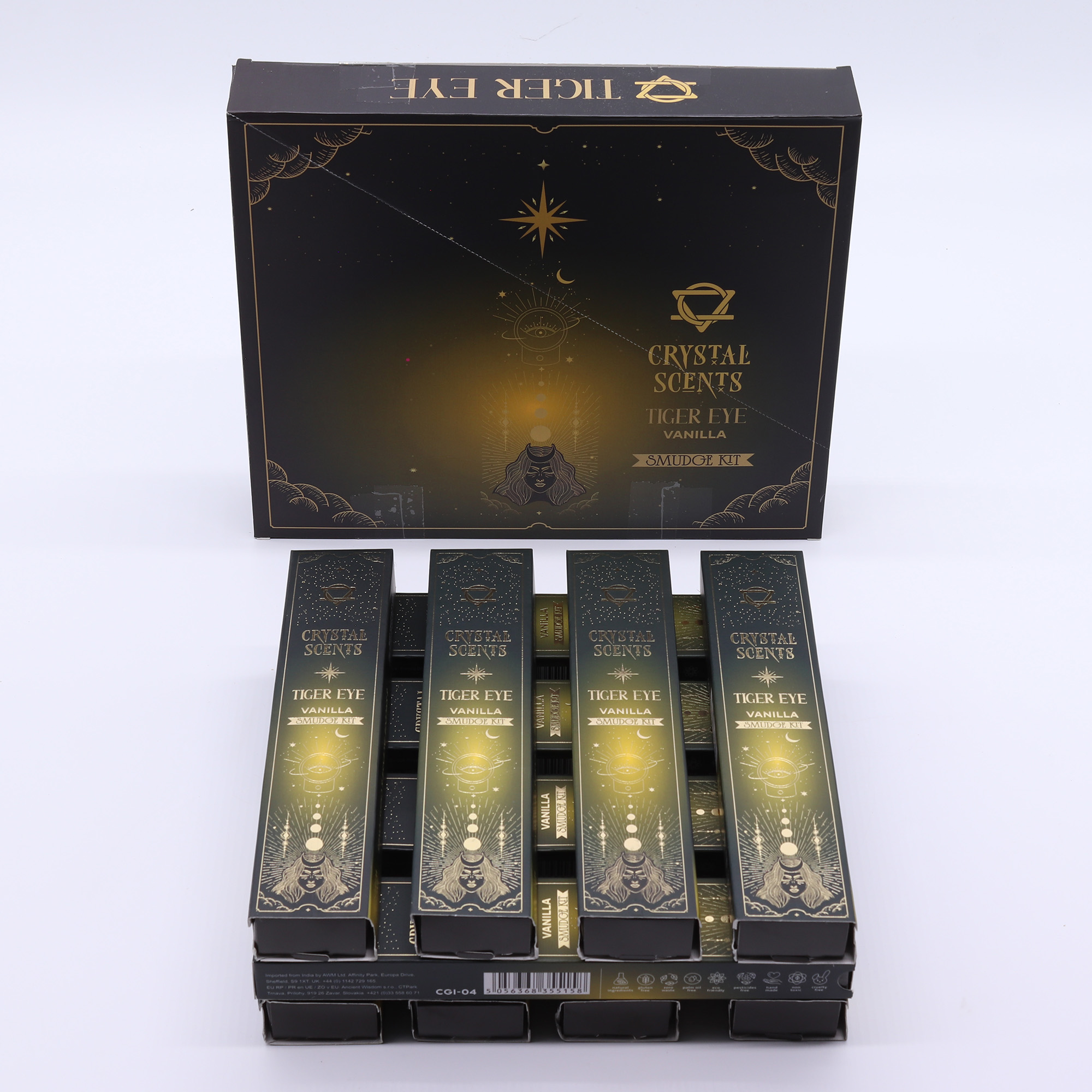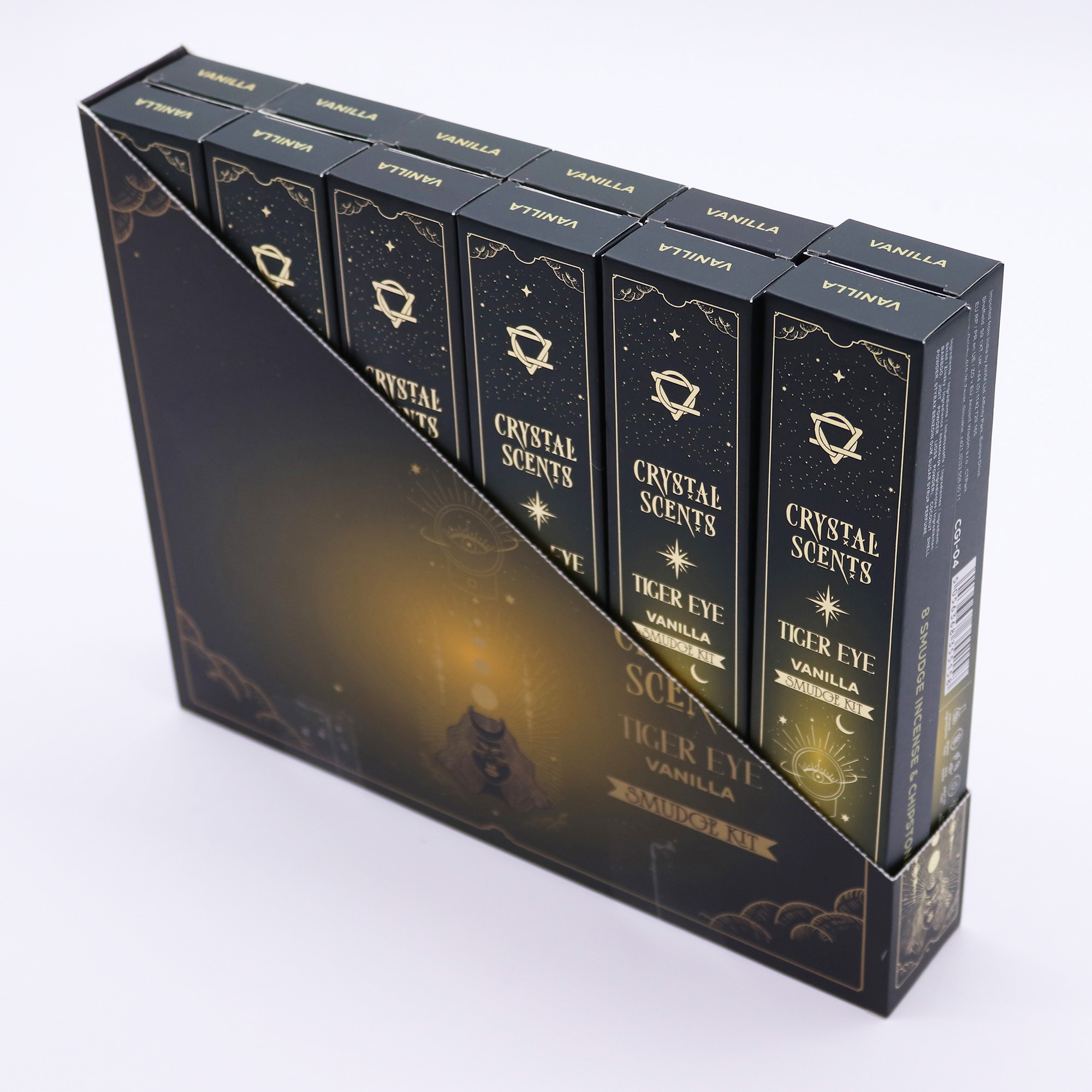 Bring balance, confidence, and inviting sweetness to your incense selection with our Tiger Eye Crystal Scents Smudge Incense. Each retail-ready pack contains 10 handcrafted vanilla-scented smudge sticks, offering a warm, creamy aroma that creates a soothing and comforting atmosphere. The sticks feature a yellow incense stem, echoing the rich tones of tiger eye.