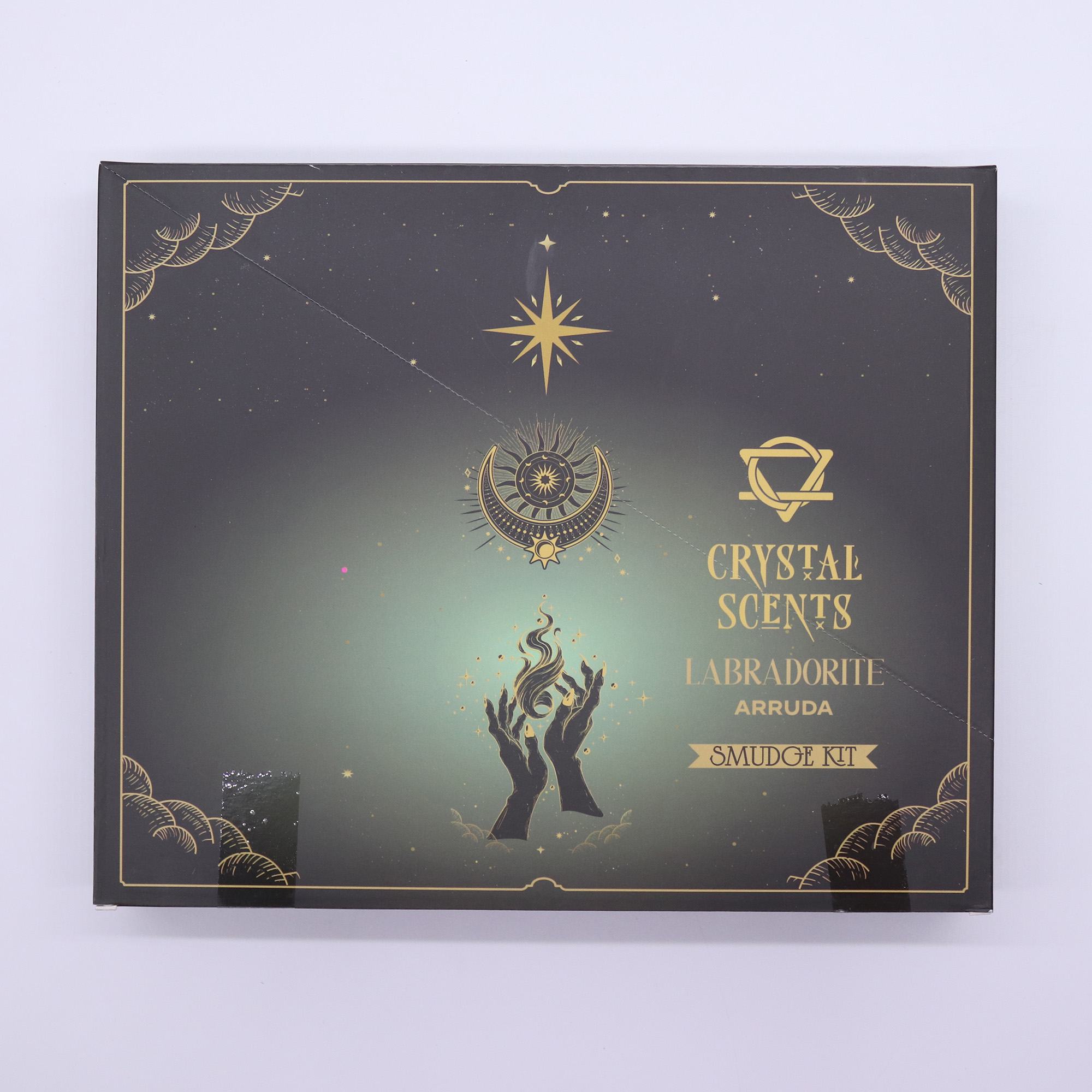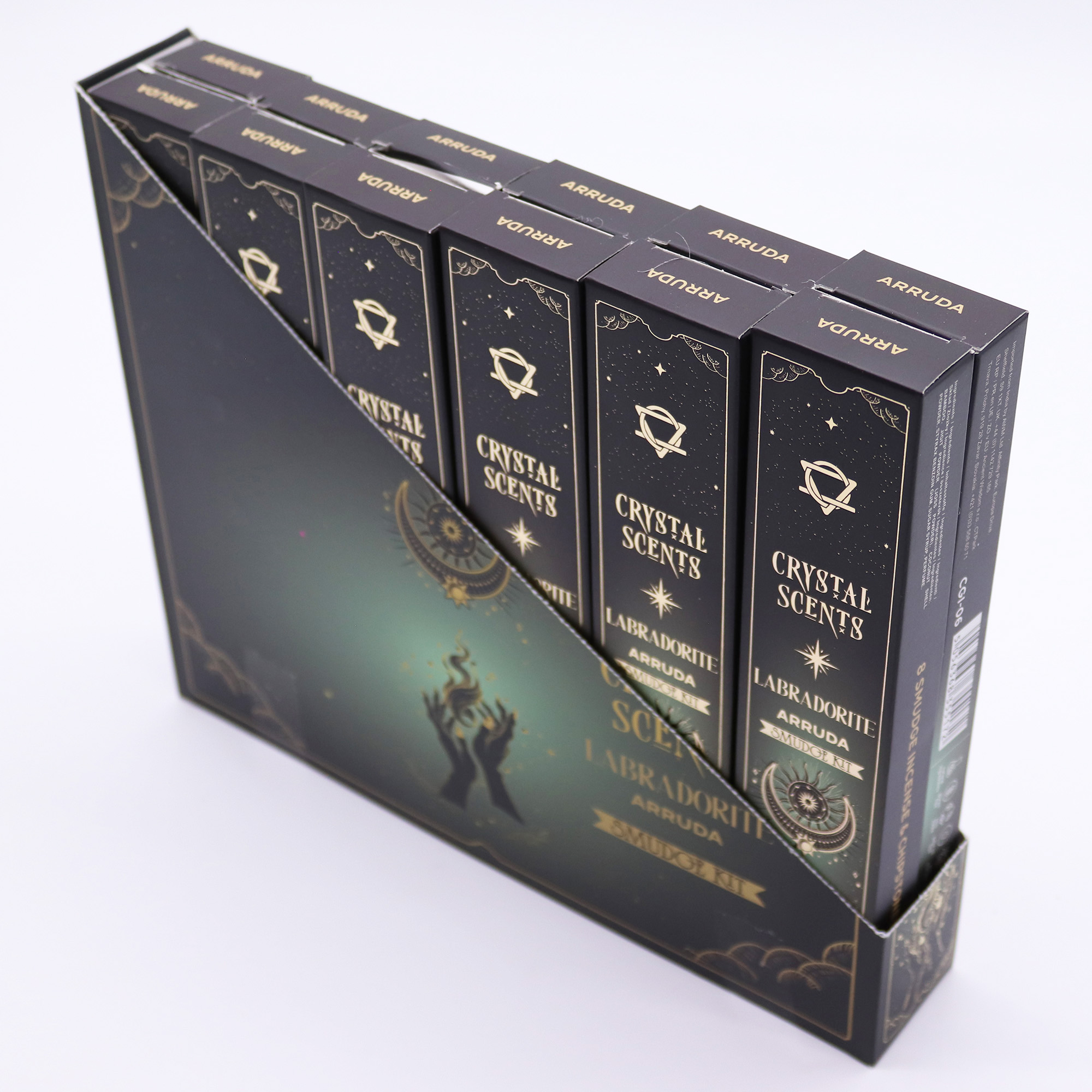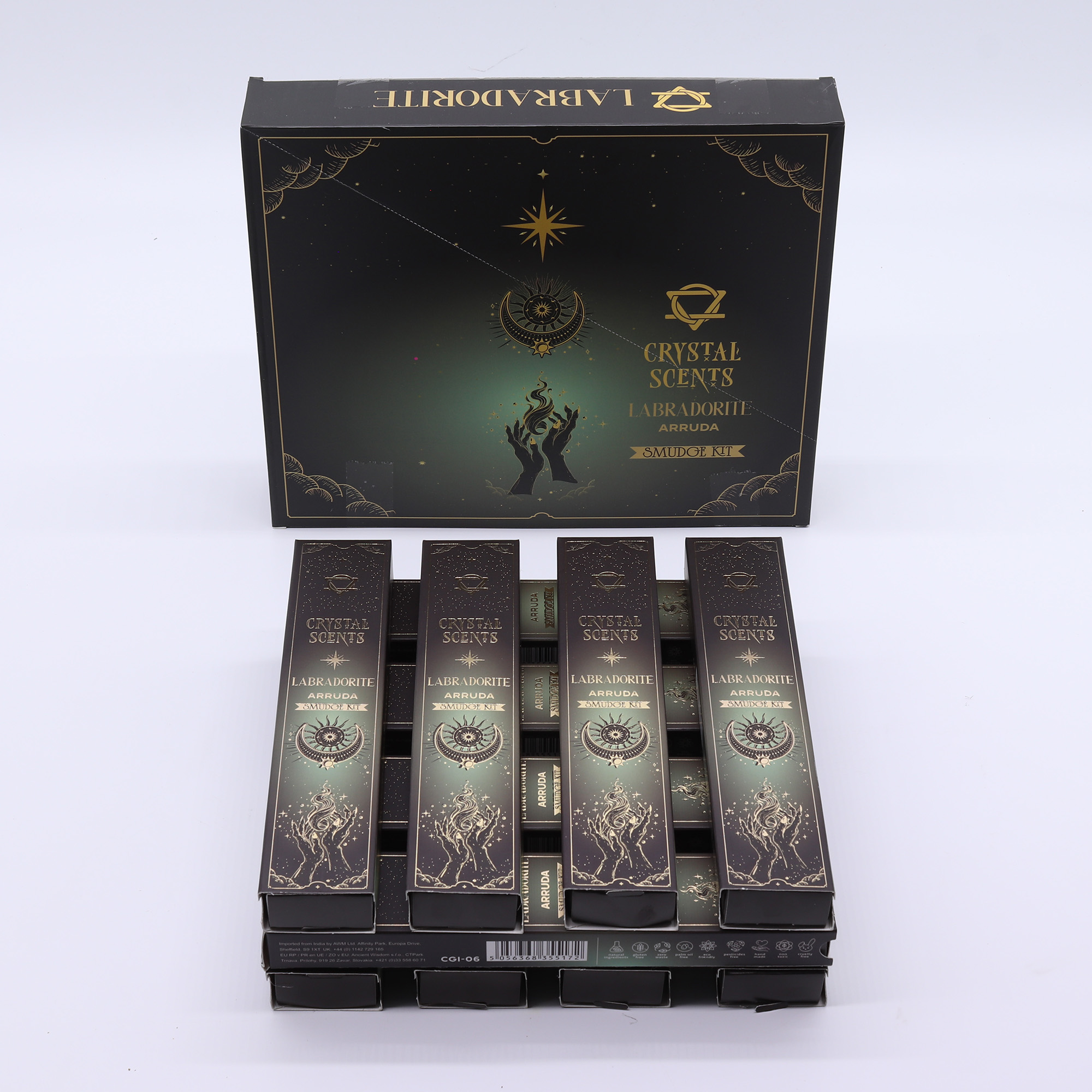 Awaken intuition, clarity, and a protective aura with our Labradorite Crystal Scents Smudge Incense. Each retail-ready pack includes 10 handcrafted Arruda-scented smudge sticks, infus