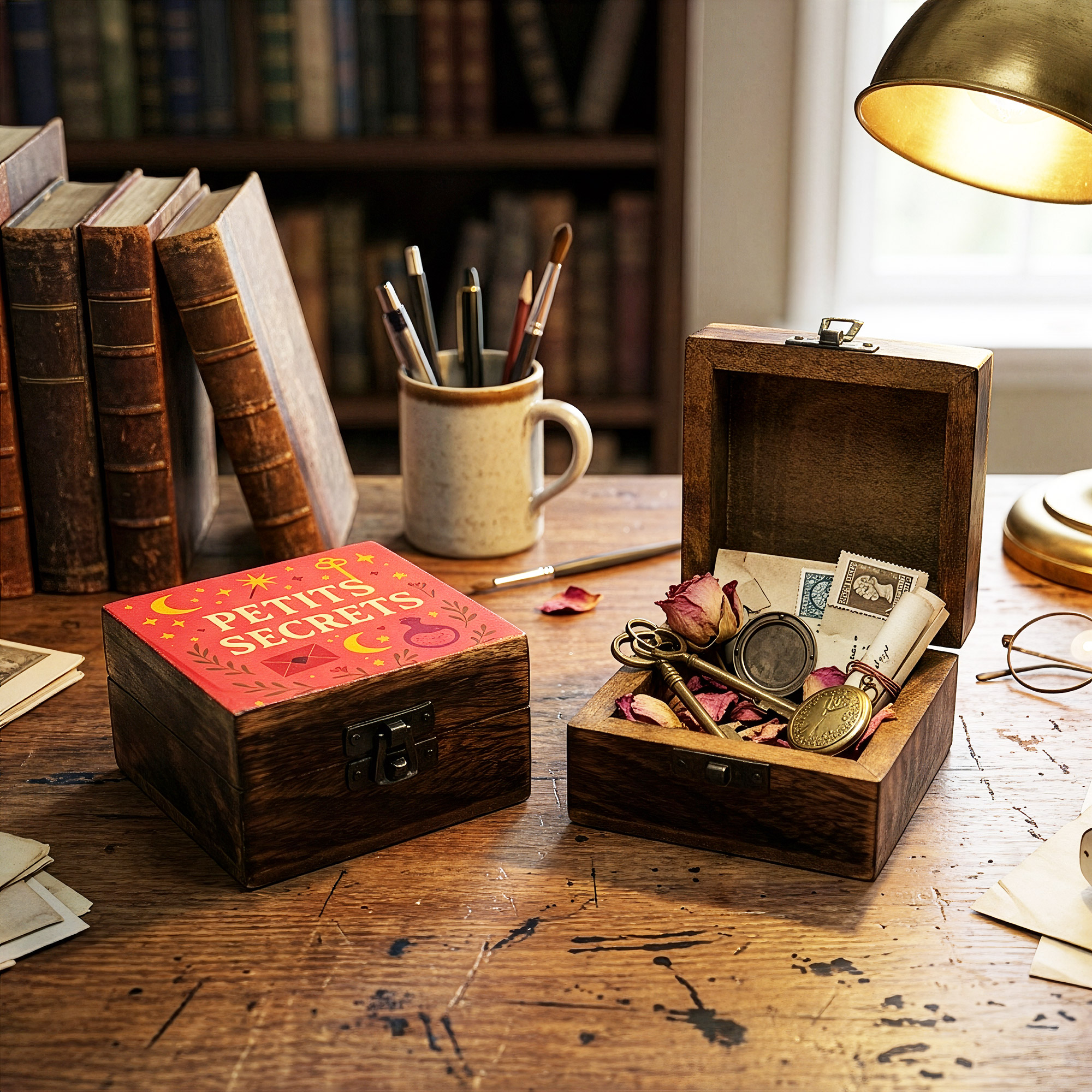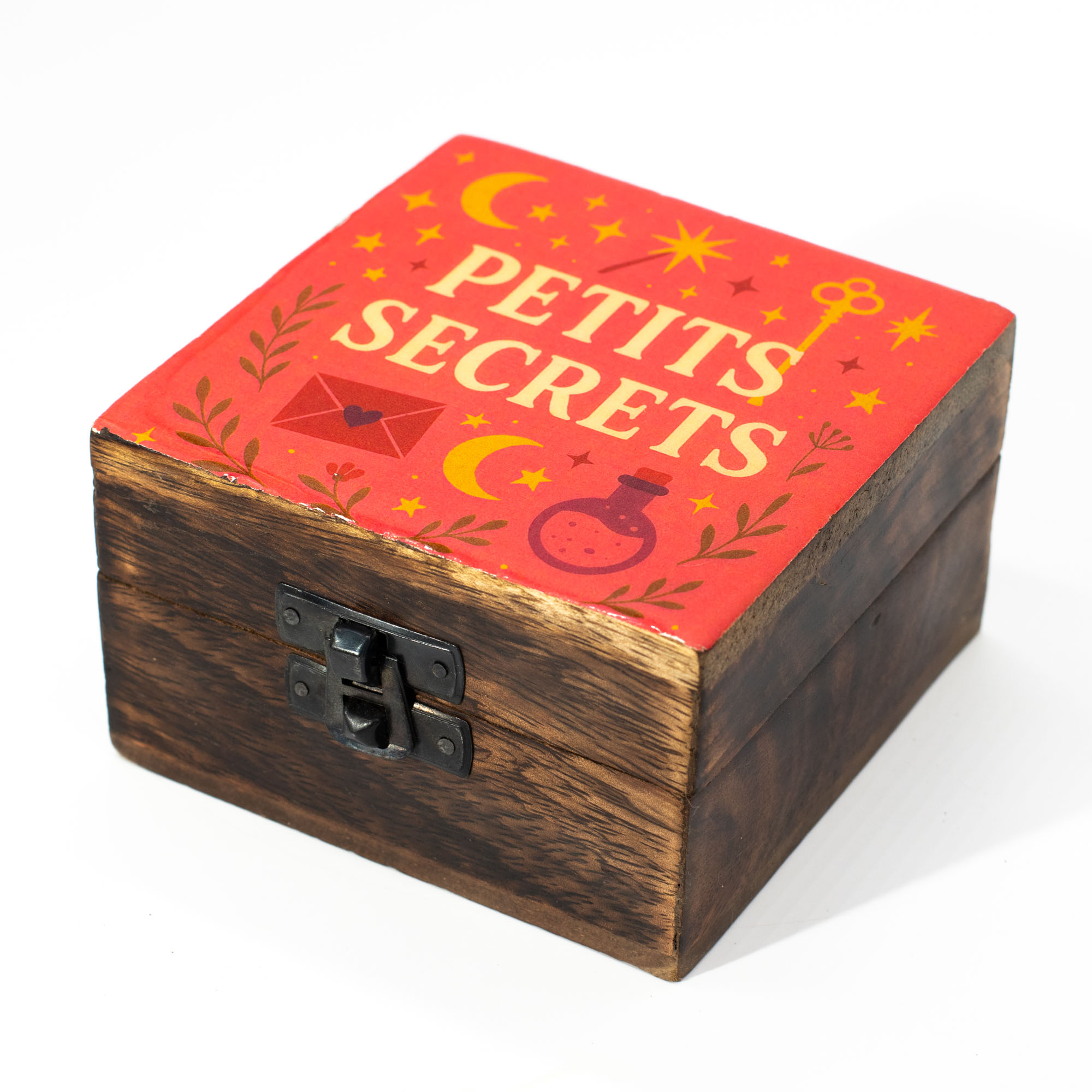 A charming little keeper for life’s quiet treasures. The Petite Secrets enamelled box blends rich, natural wood with a warm, playful design filled with symbolic details, moons, stars, keys, letters, and potion bottles, all set against a bold coral-red enamelled lid. It feels personal, slightly magical, and just curious enough to invite a closer look.