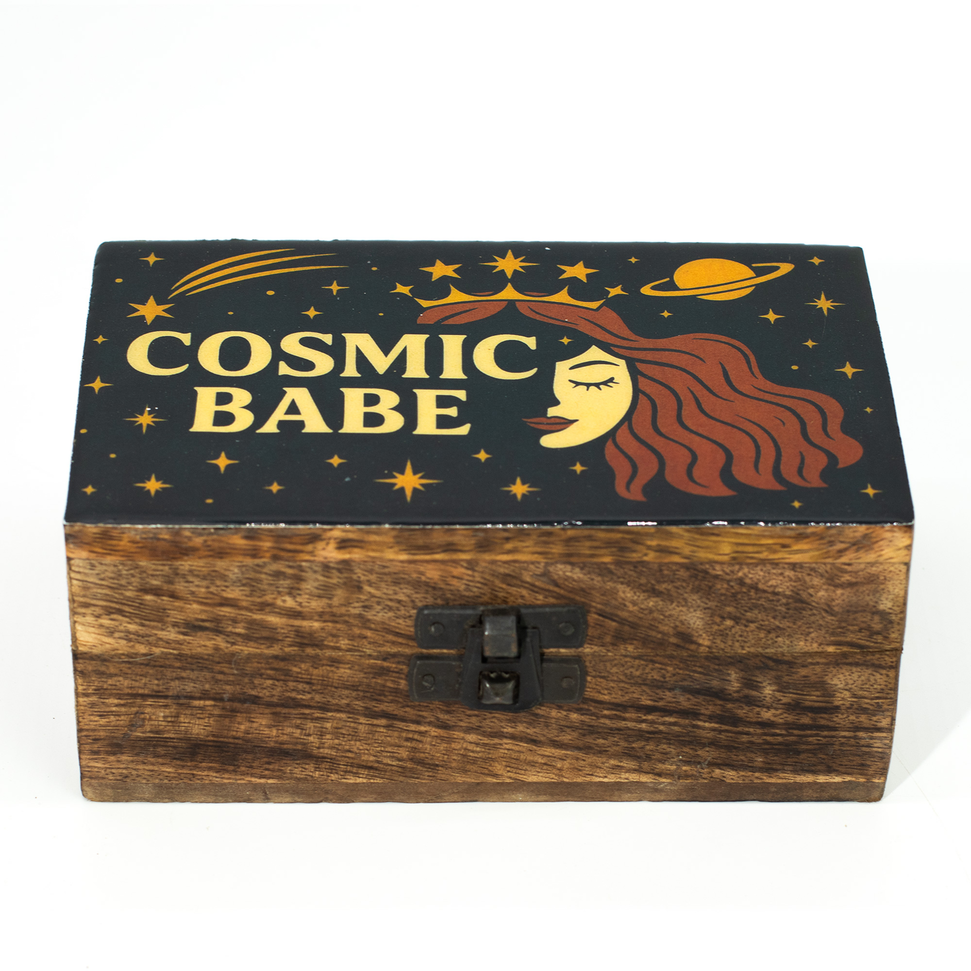 Confident, celestial, and unapologetically bold. The Cosmic Babe enamelled box is designed to stand out, combining cosmic symbolism with a strong, modern statement. The enamelled lid features a crowned celestial figure surrounded by stars and planets, set against a deep night-sky background that feels powerful and playful at the same time.