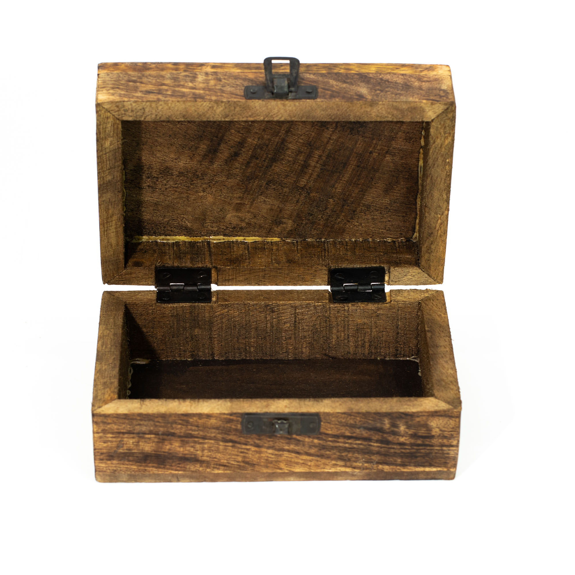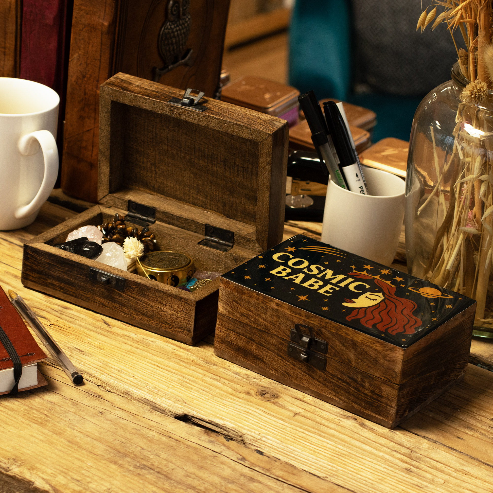 The medium size offers plenty of room for jewellery, crystals, tarot cards, letters, or personal keepsakes, while the solid wooden base grounds the design with warmth and texture. Finished with a hinged lid and metal clasp, it has the weight and presence of a true keepsake piece.