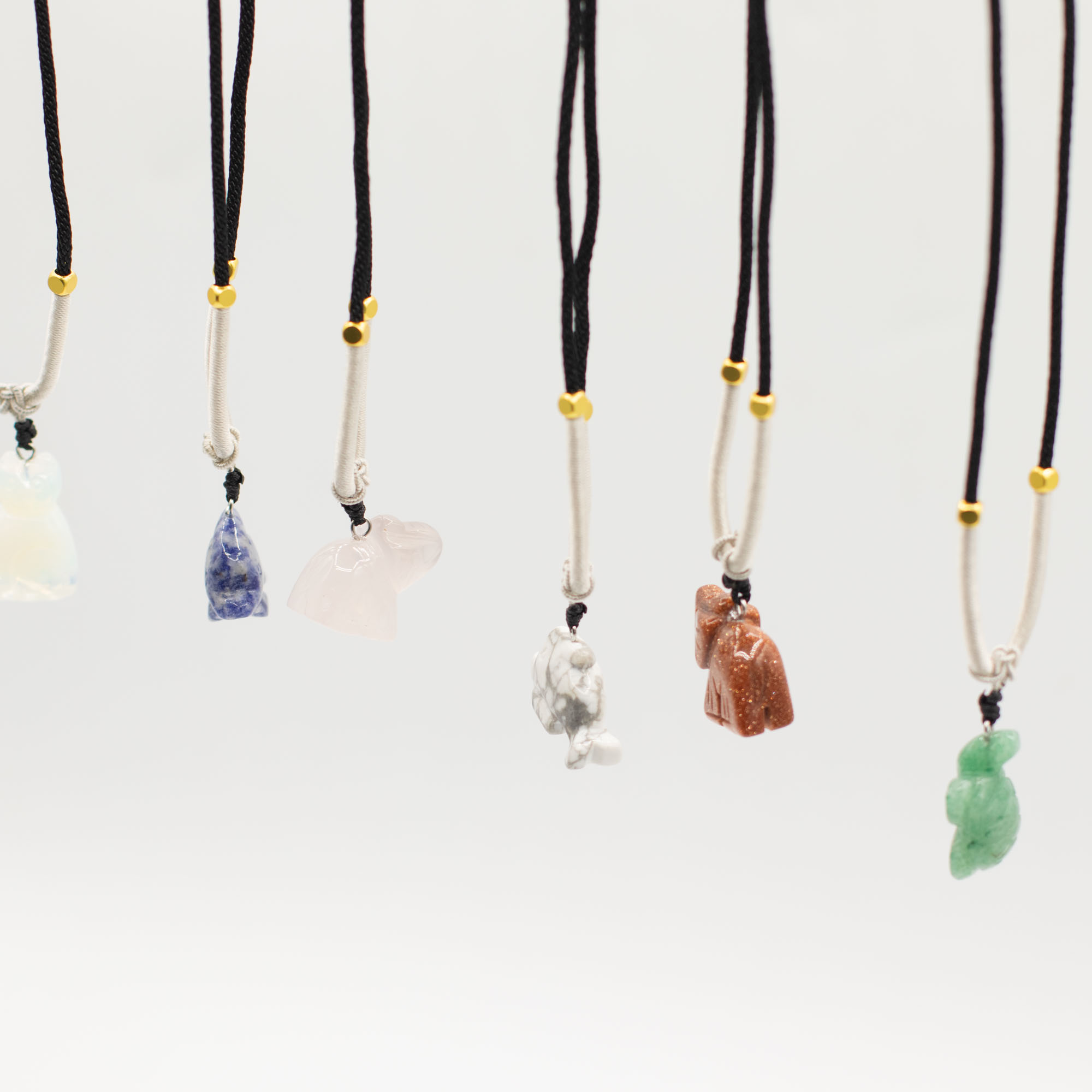 The collection includes a variety of animal designs such as elephants, turtles, dolphins, cats, and other beloved creatures, crafted from assorted natural gemstones. Each pendant is presented on an adjustable cord necklace with decorative bead accents, creating a ready-to-sell piece with strong visual appeal.