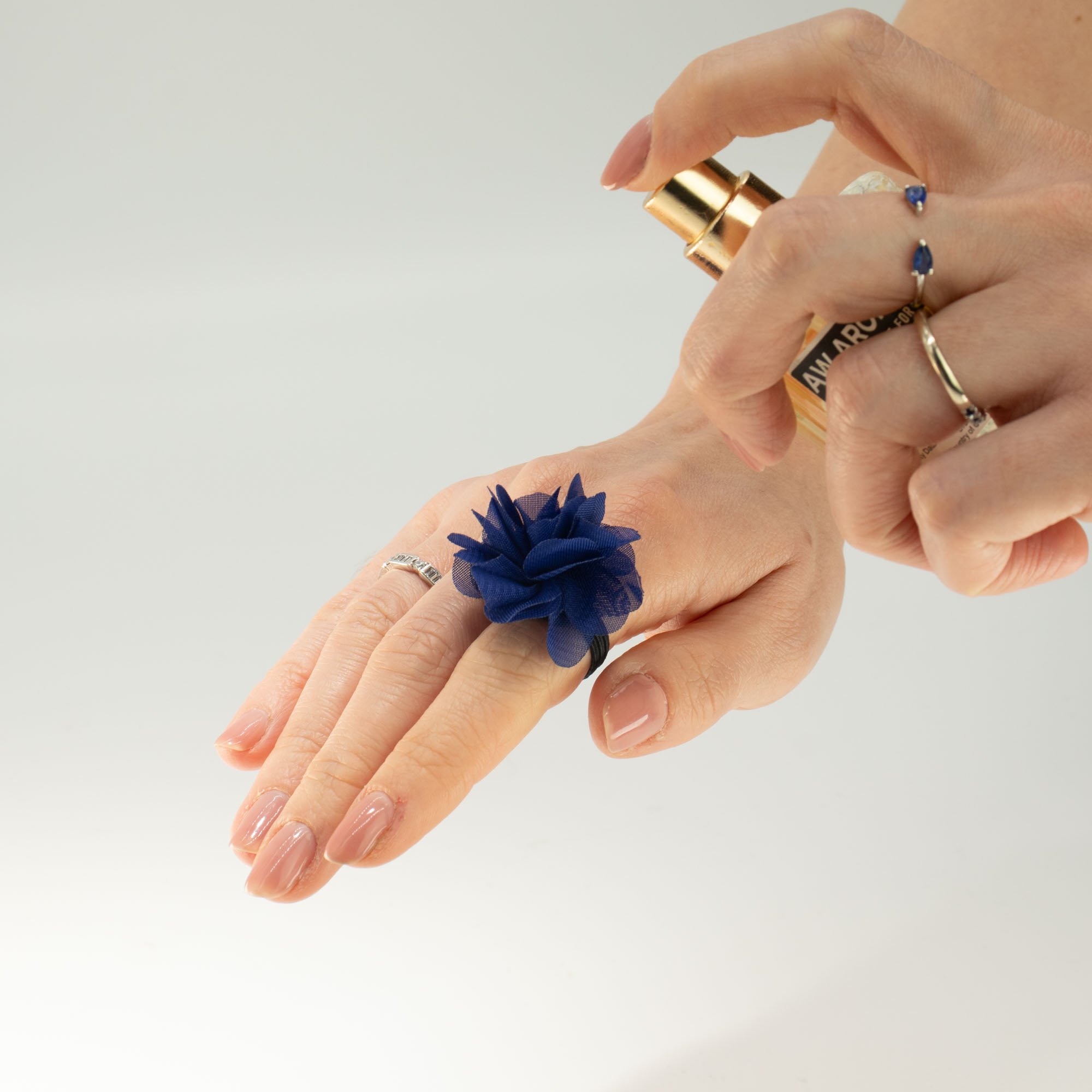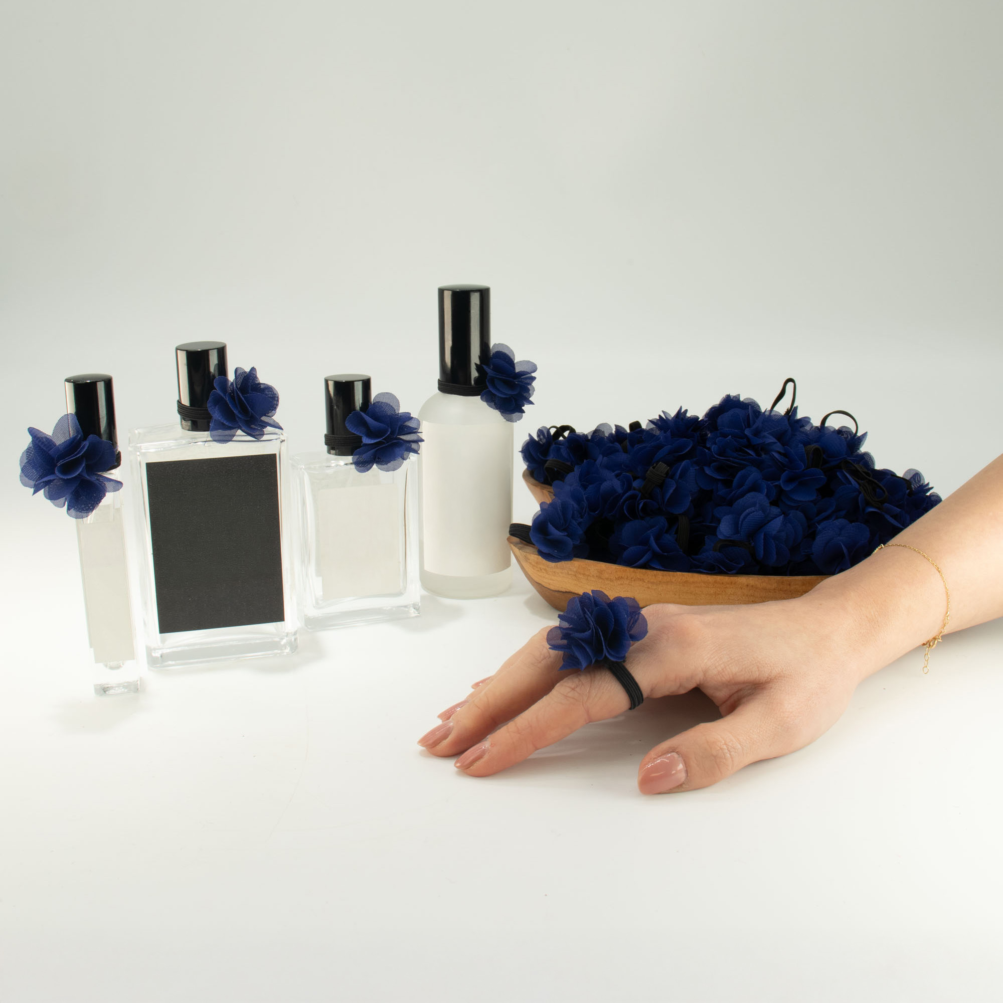 Available in a wholesale pack of 100, these Navy Blue Chiffon Scent Rings offer a refined way to present and sample fragrance in-store. Each soft chiffon flower sits on an elastic ring and can be lightly infused with fragrance oil, releasing scent gradually as a wearable mini diffuser.