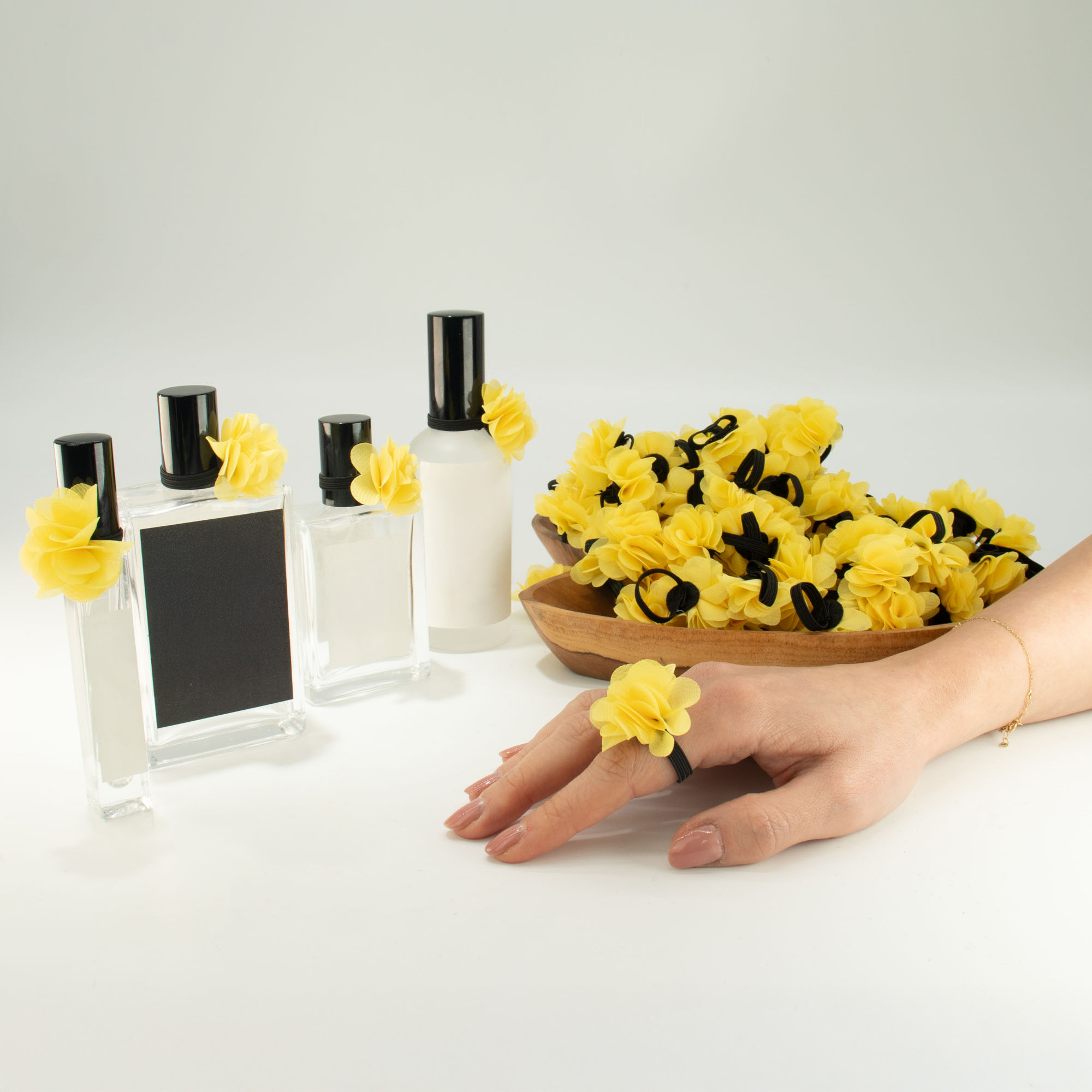 Supplied in a bulk pack of 100, these Yellow Chiffon Scent Rings bring brightness and energy to fragrance displays. Each lightweight fabric flower is set on an elastic ring and can be infused with fragrance oil, allowing it to gently diffuse scent as a wearable tester.