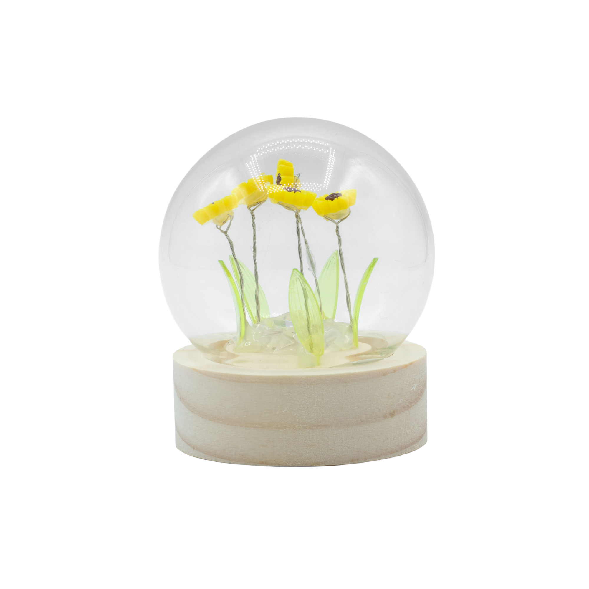 The 5 Sunflowers Floral Glow Garden Dome offers a minimalist and bright touch of nature in a compact design. This piece features five cheerful yellow sunflowers elegantly spaced within a clear glass globe. The blooms are set among delicate green leaves and a base of translucent decorative stones, all supported by a wood-like base.
