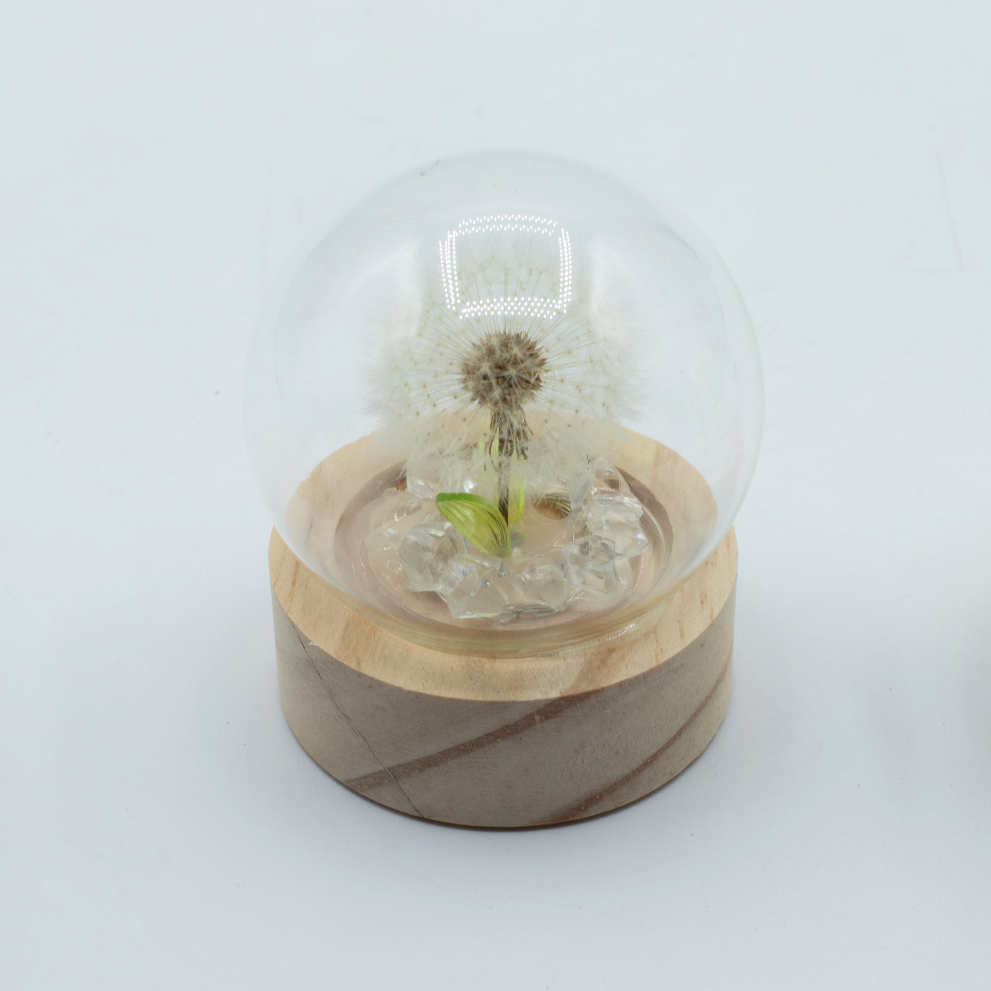The 1 Dandelion Floral Glow Garden Dome provides a peaceful, minimalist aesthetic that focuses on the intricate details of a single dandelion puff. Enclosed in a clear glass globe, the airy seeds are frozen in time, standing elegantly above a bed of translucent decorative stones. This delicate botanical scene is mounted on a thick wood-like base that adds a grounded, organic feel to the design.