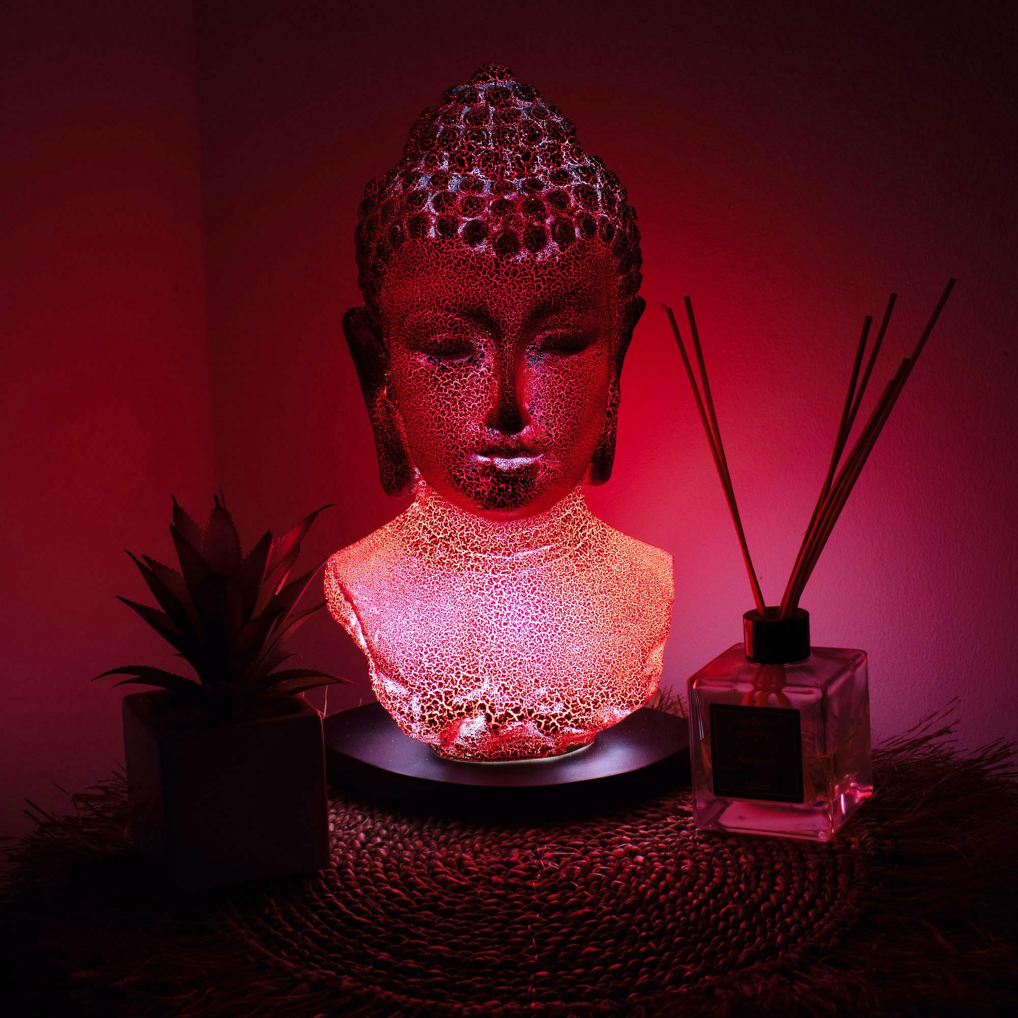 The Molton Lava Buddha Bust Lamp features a deep, textured finish that provides a bold, earthy aesthetic. Made with a fibreglass shade, the "crackle" surface creates a high-contrast look when unlit and a warm, volcanic glow when powered on.