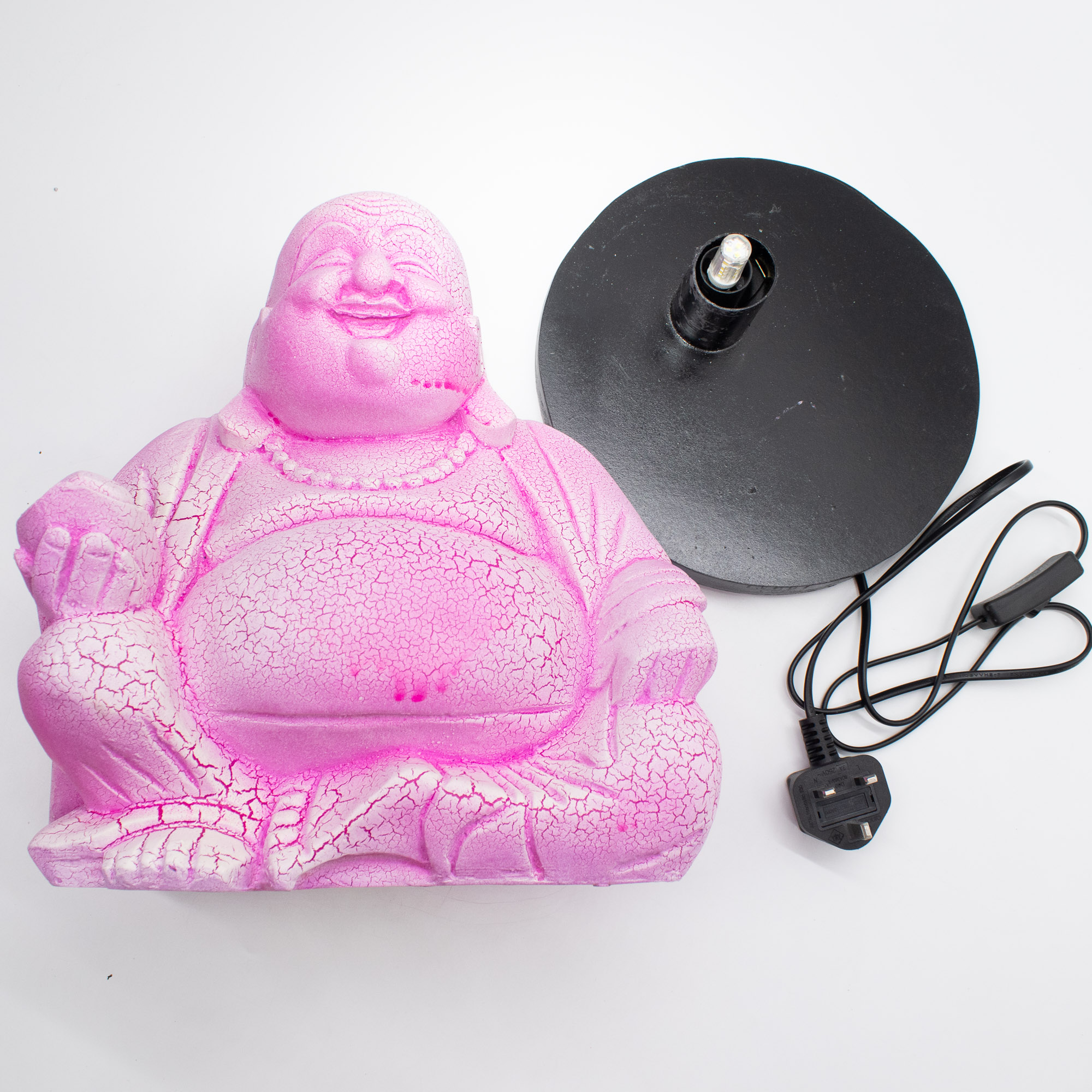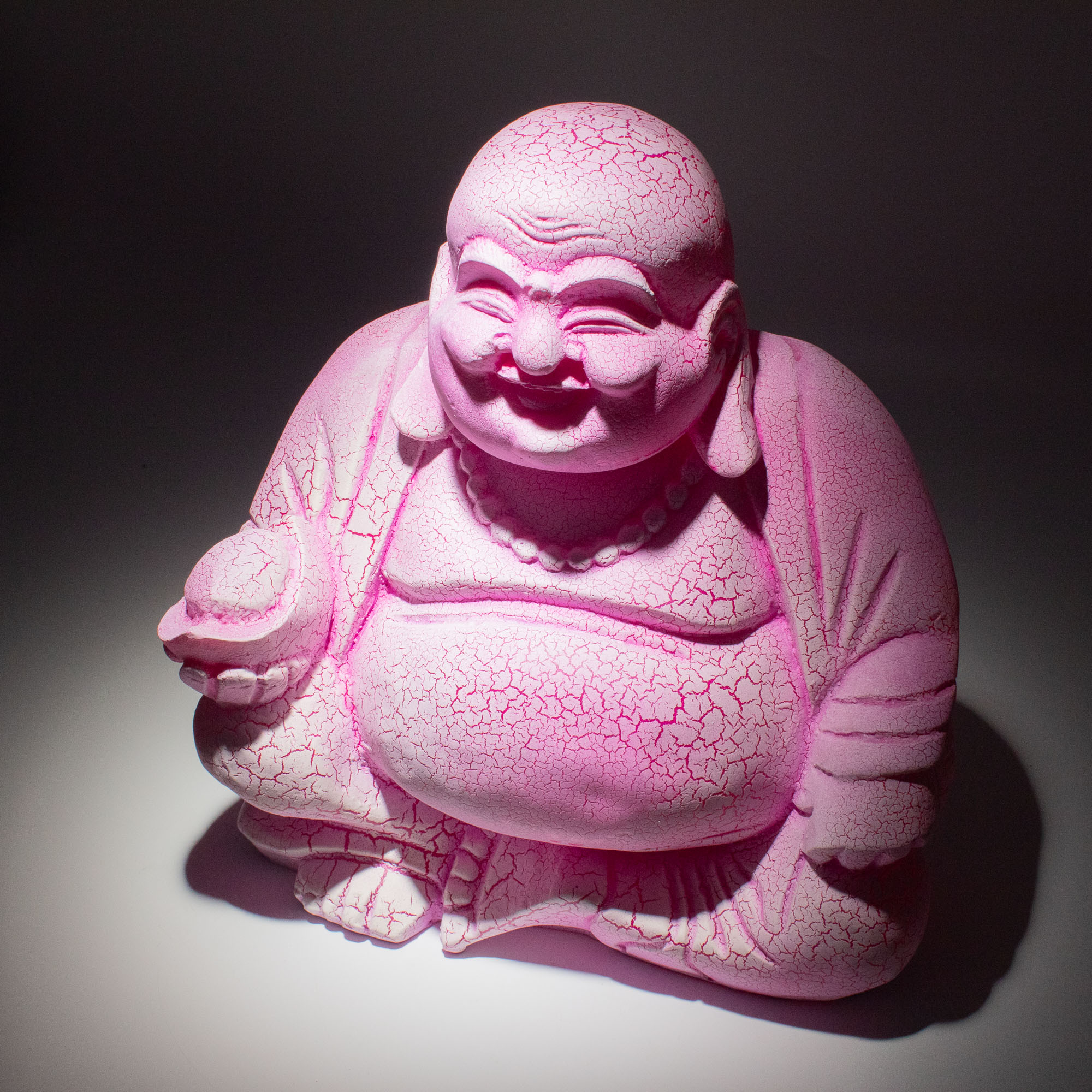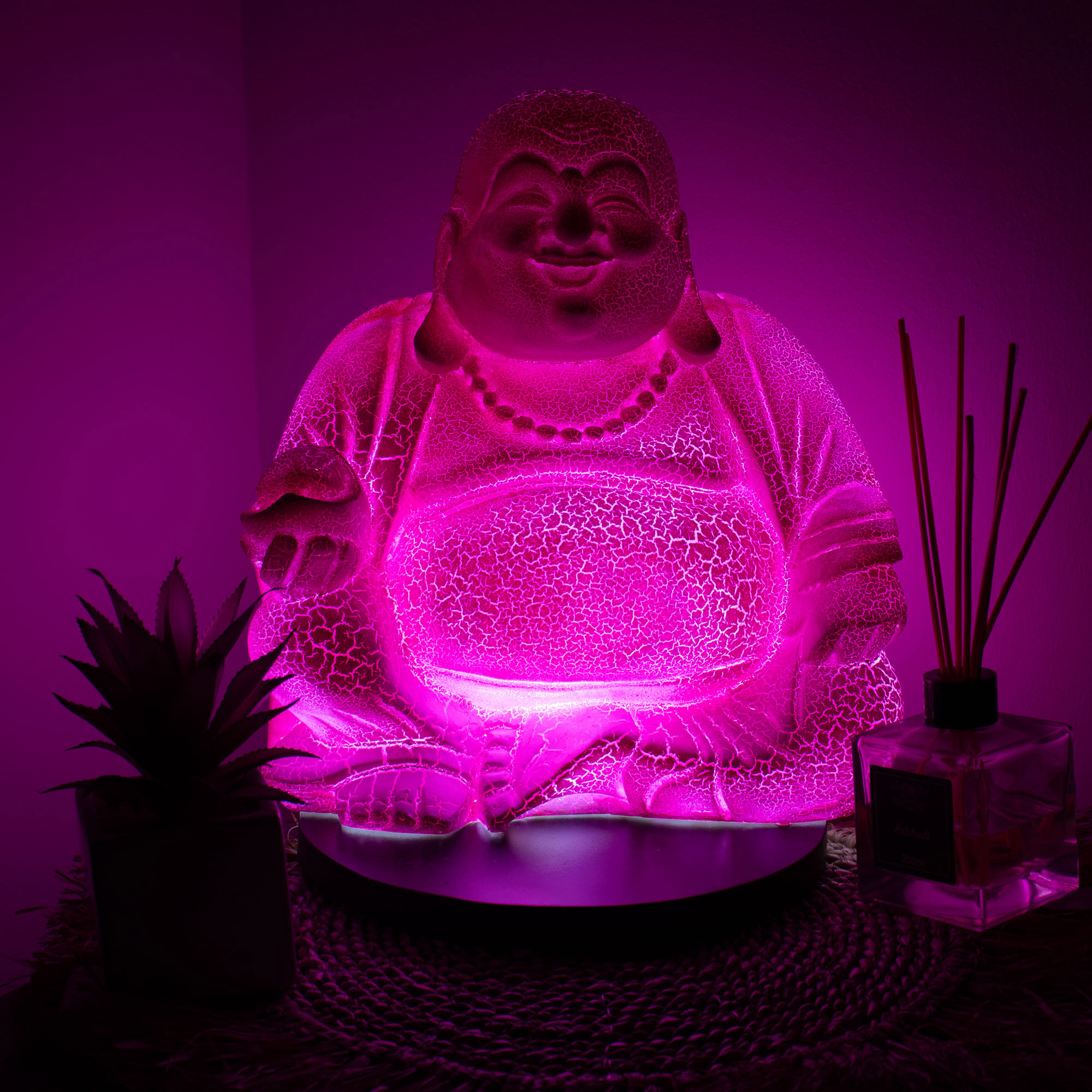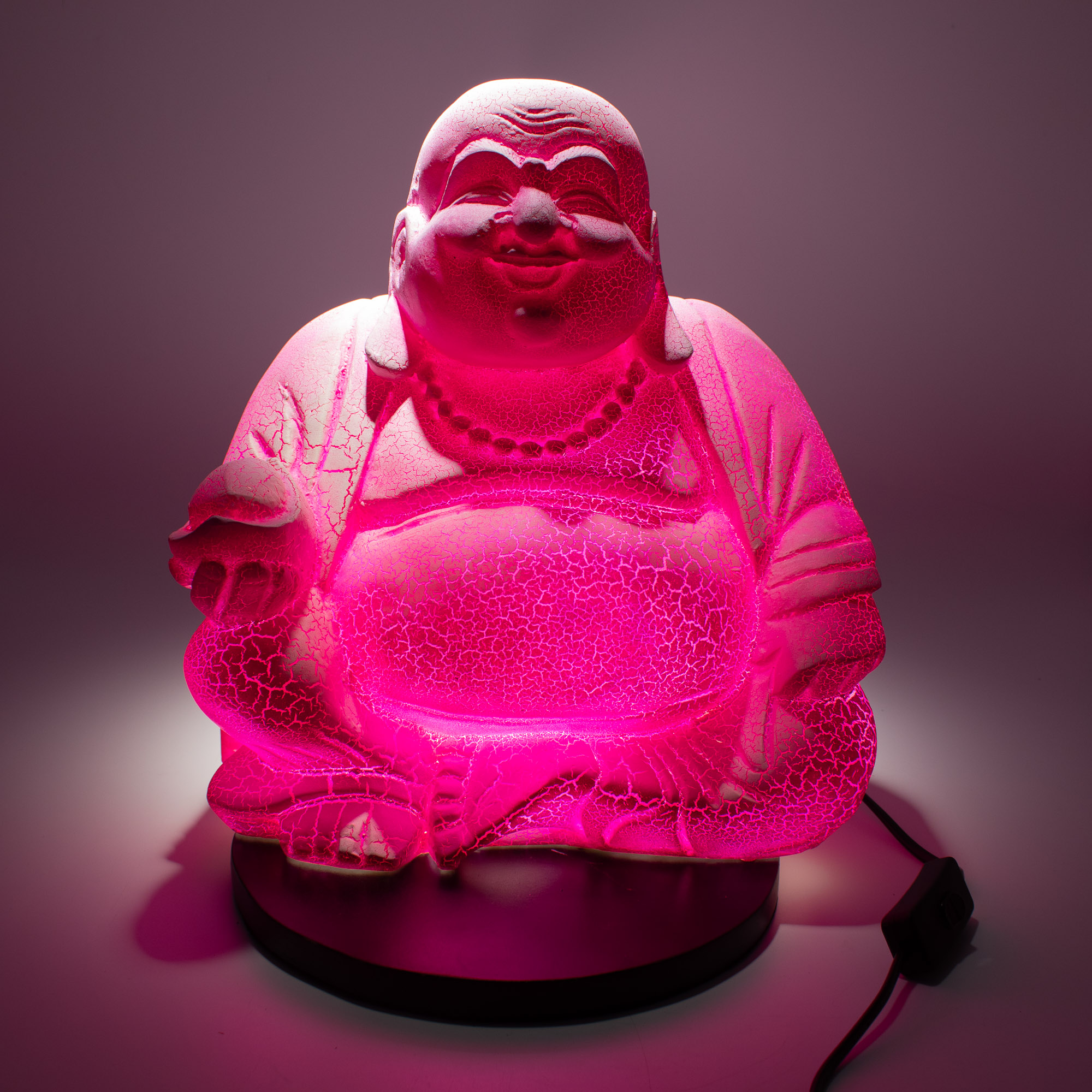 The Dragonfruit Laughing Buddha Lamp brings a joyful energy to your lighting range. This model features a sitting Laughing Buddha figure with a vibrant, pink-magenta fiberglass shade. The "crackle" surface gives the piece a stone-like texture that glows intensely when the lamp is lit.
