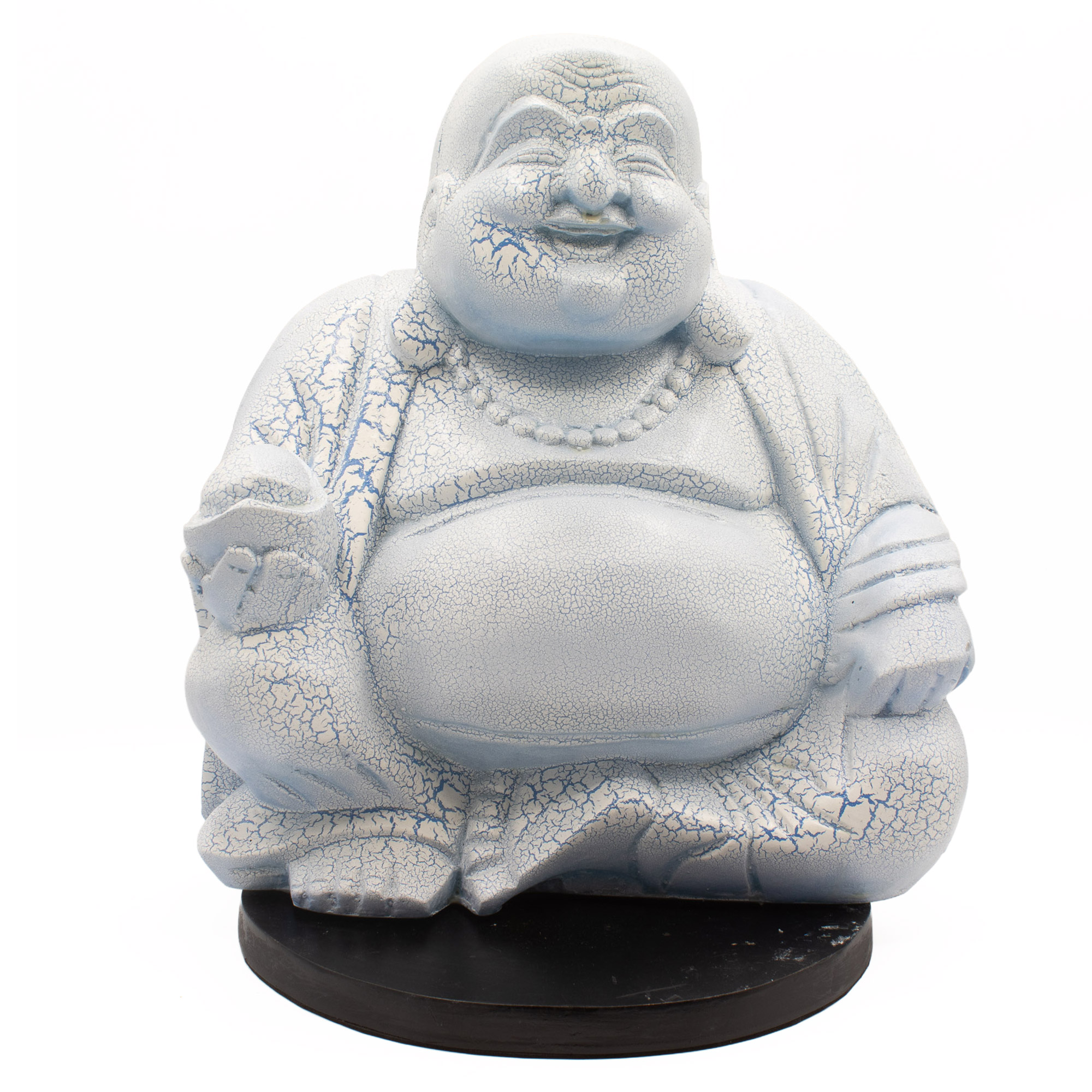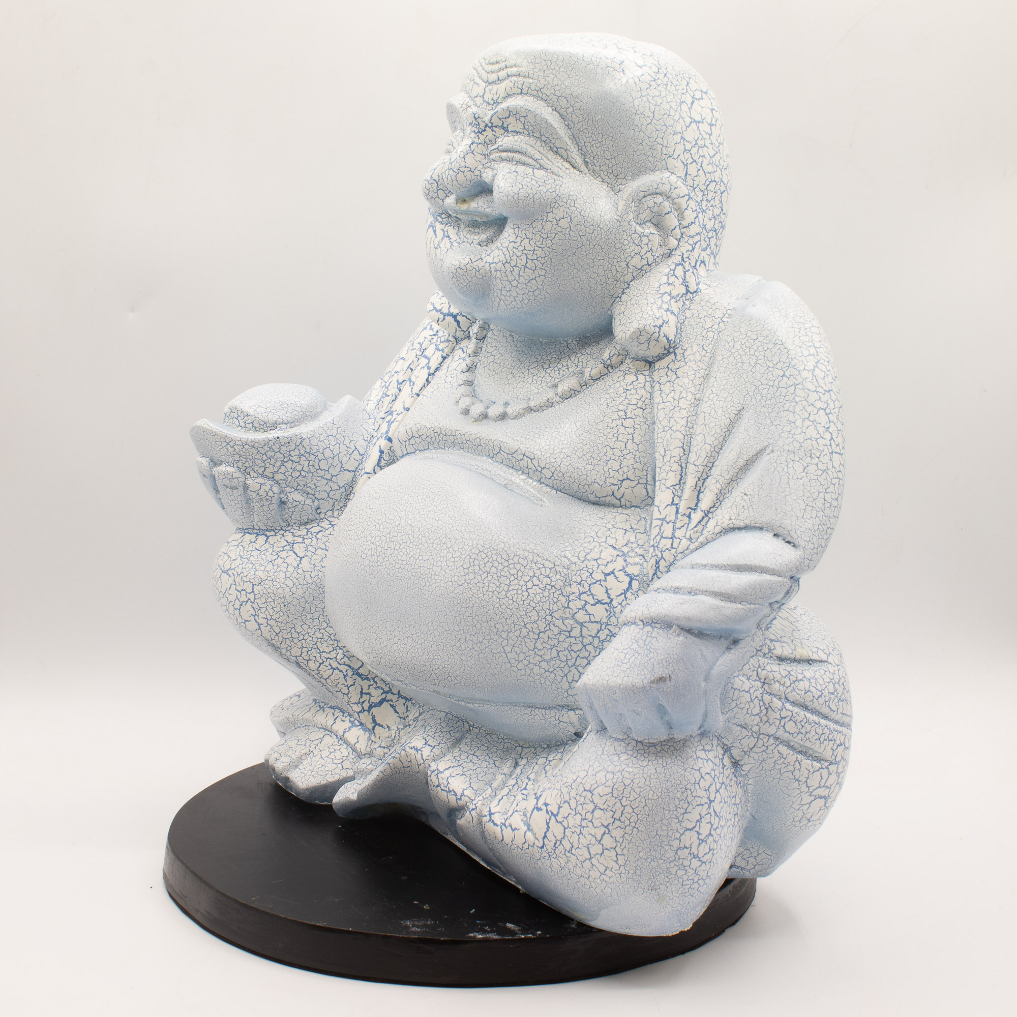 Round Stand: Mounted on a sturdy, circular black base tailored to the wider proportions of the Laughing Buddha figure.