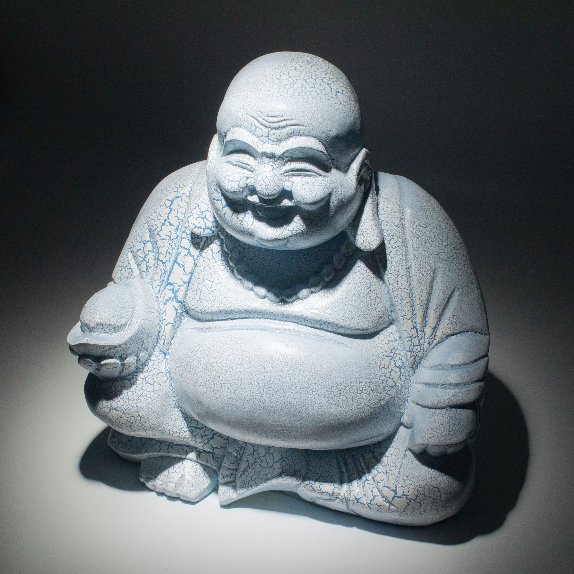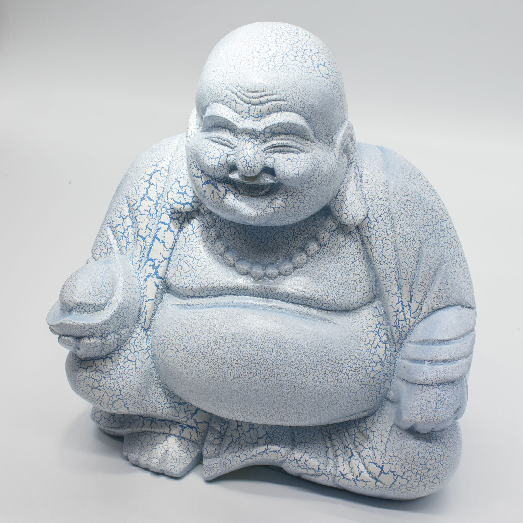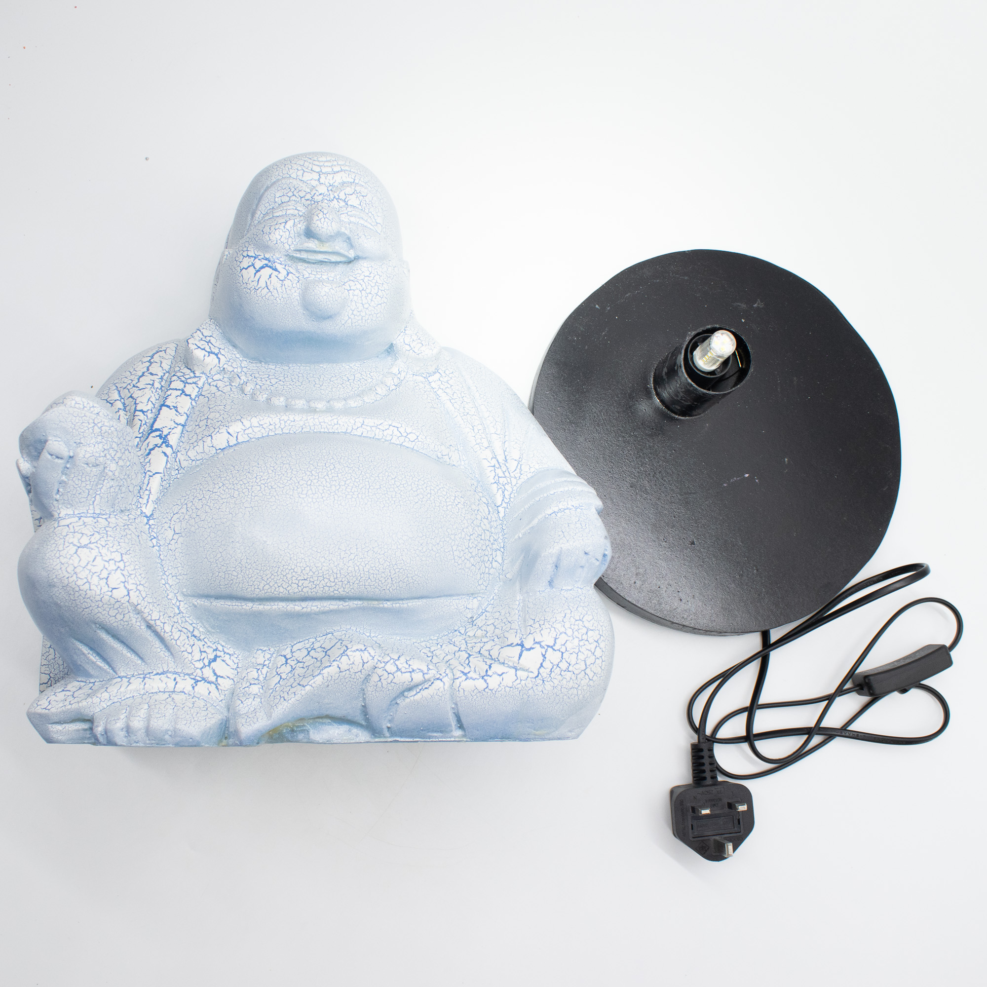 The Sky Blue Laughing Buddha Lamp offers a refreshing, cool-toned addition to the collection. Constructed with a durable fibreglass shade, the classic "crackle" finish diffuses light to create a soft, azure glow. This model features the traditional seated Laughing Buddha, symbolising prosperity and happiness.