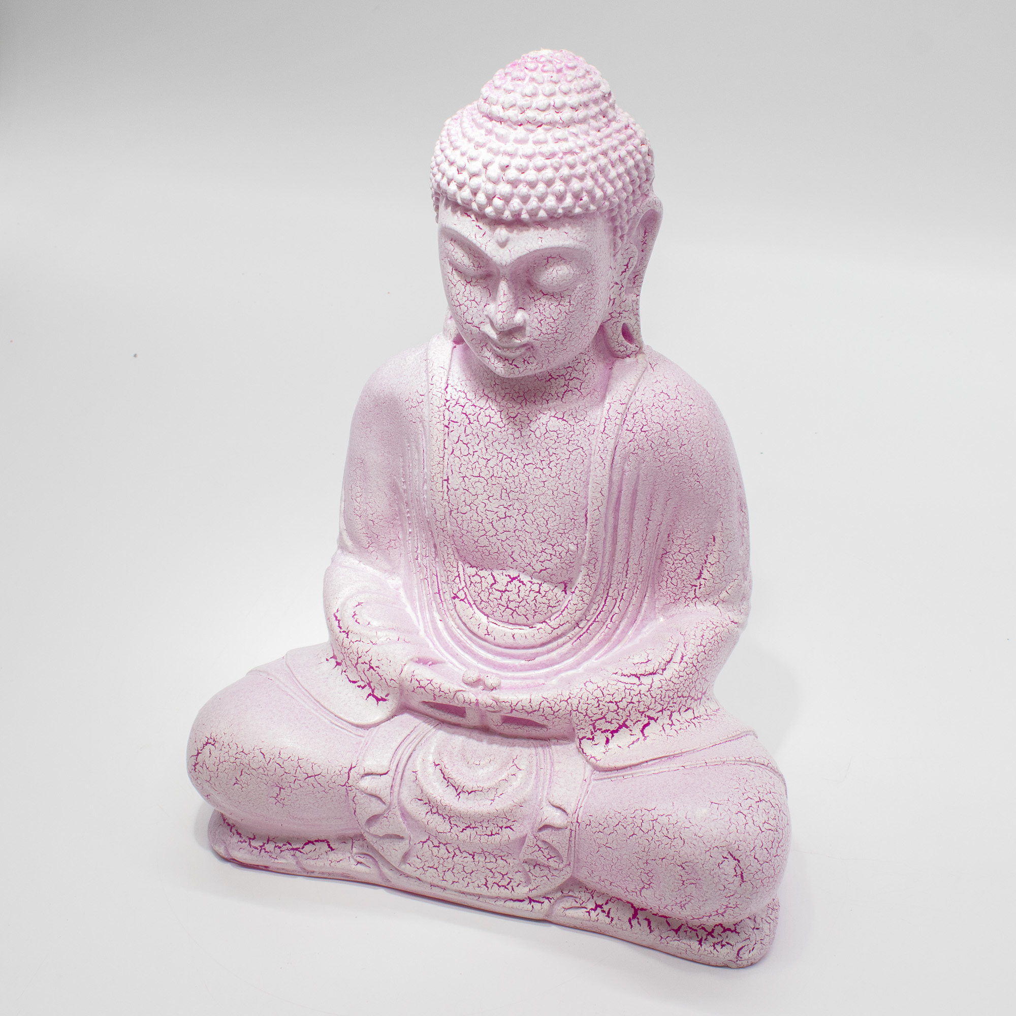 The Meditation Buddha Lamp in Cherry Crackle features a full-body seated figure in a traditional meditative pose. This fibreglass shade is finished with a detailed crackle texture that, when unlit, gives the appearance of a stone carving. When illuminated, it emits a vibrant cherry-pink glow that serves as a focal point for any room.