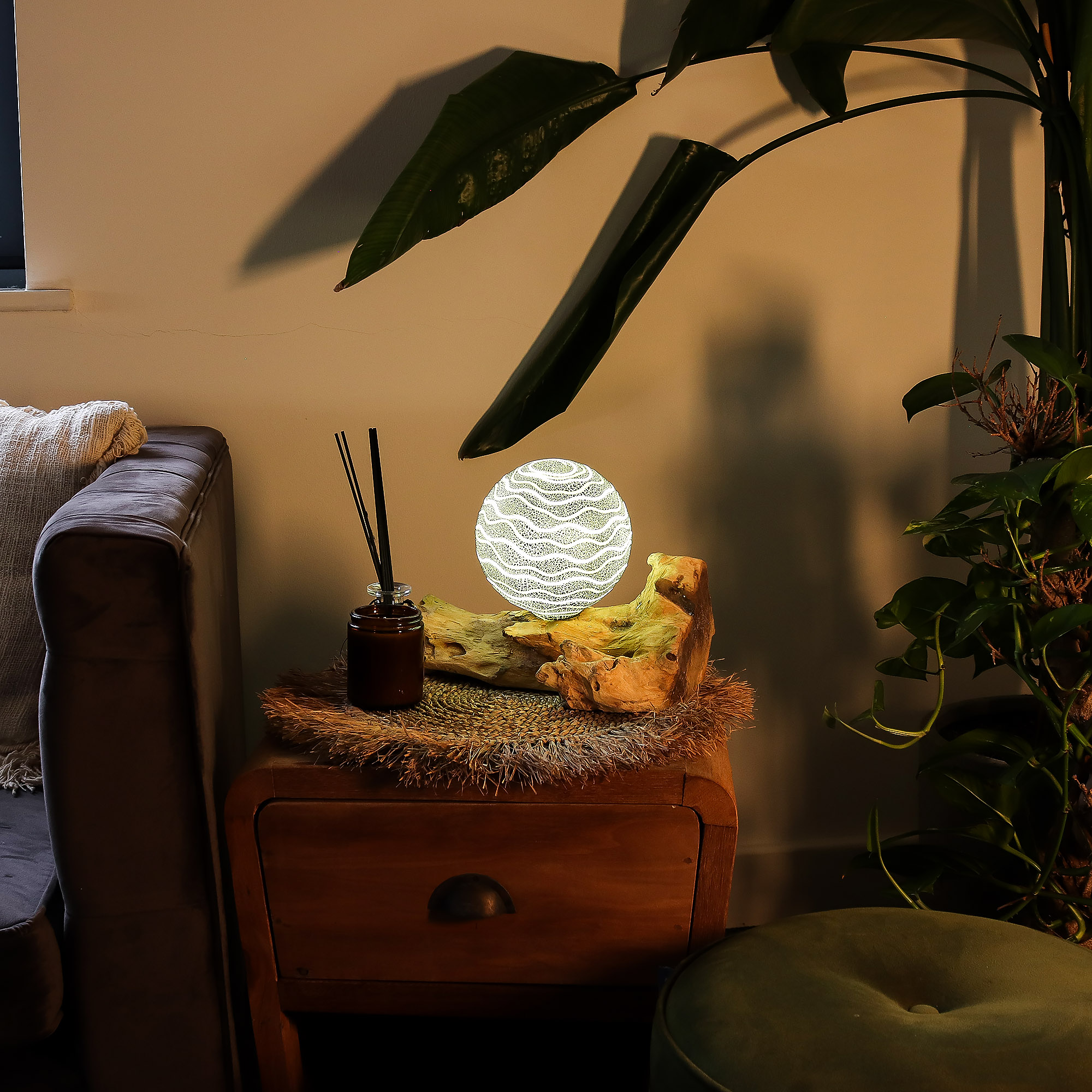 This lamp brings a calm, lunar glow into the room. The Grey Luna shade sits on a natural piece of Indonesian driftwood, giving you a blend of soft light, organic texture, and sculptural design. It feels both earthy and modern, making it an easy statement piece for any home.