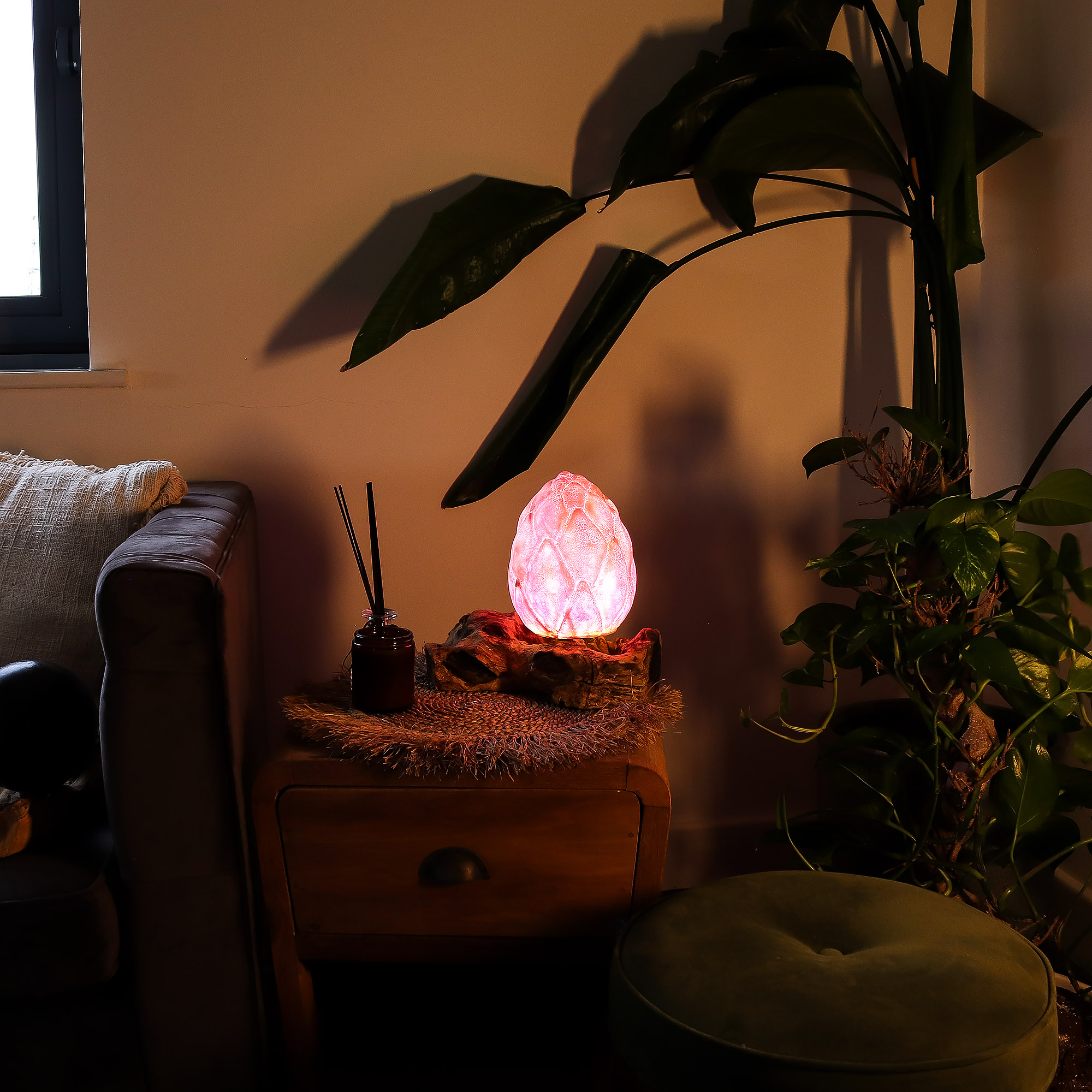 This lamp delivers a soft, enchanting glow that feels instantly calming. The Crackle Lotus Flower shade adds a sculptural, petal-like texture that stands out even when unlit. Switch it on, and the crackle glass lights up with warm pink/red tones, giving the whole piece a gentle, magical radiance your customers will love.