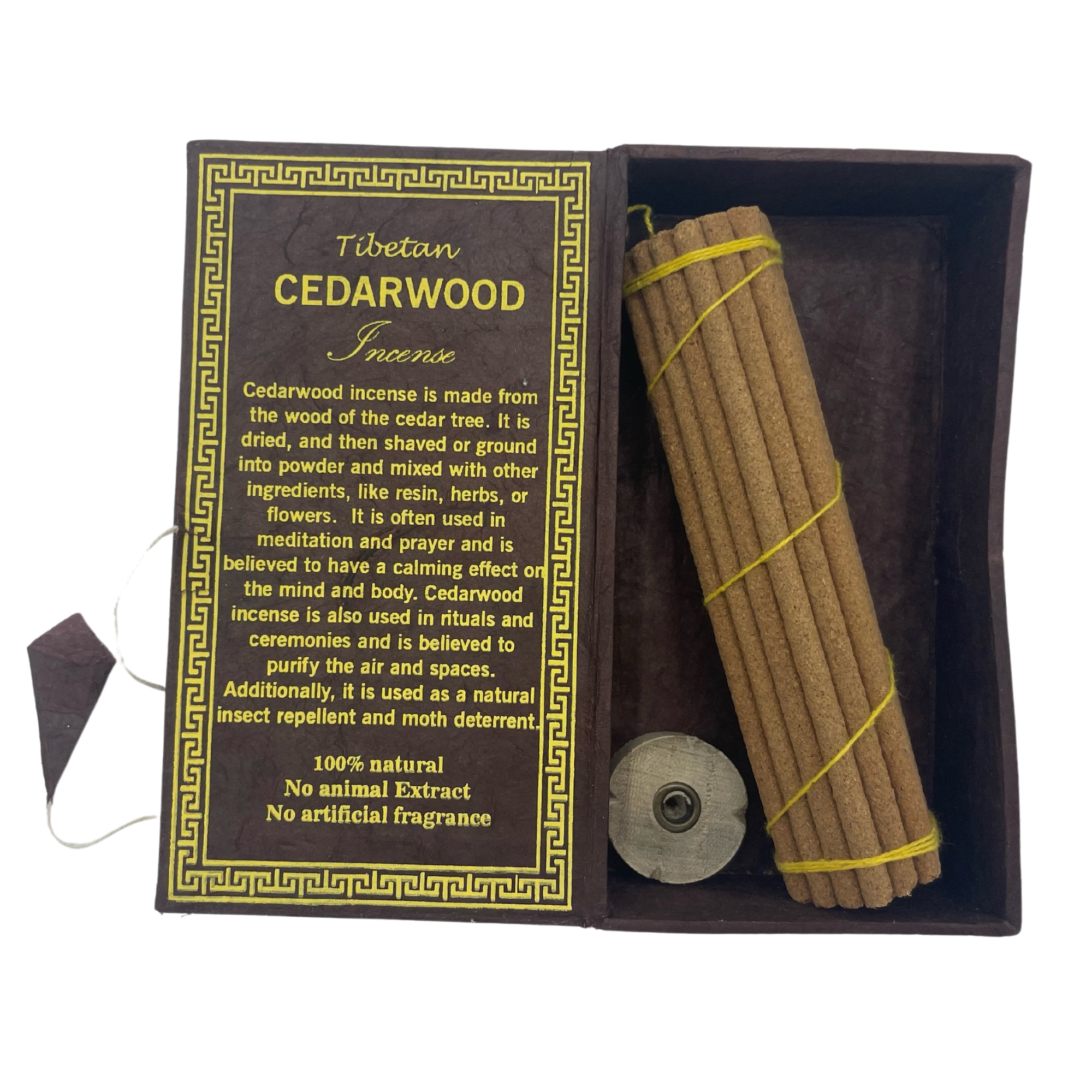 Each set comprises 30 incense sticks infused with the calming scent of cedarwood, a cherished offering from the Himalayan region. Accompanied by an exquisitely designed wooden holder, this set also includes an enlightening explanatory text that unveils the cultural and spiritual significance behind these aromatic creations.