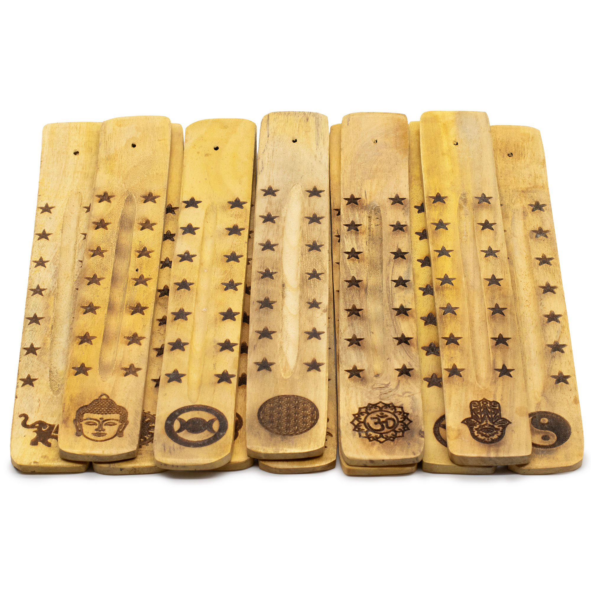 A beautifully balanced collection of form, function, and symbolism. This assorted set includes twelve mango wood ash catchers, each engraved with a different esoteric symbol such as the Buddha, Yin Yang, Hamsa, Om, and the Flower of Life. The warm, natural grain of the mango wood gives every piece a unique finish, while the carved motifs add meaning without overpowering the design.