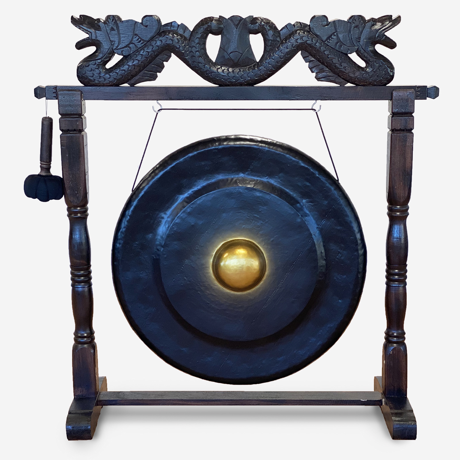 The gongs comes with a sturdy wooden carved stand. Making an attractive and useful artwork.