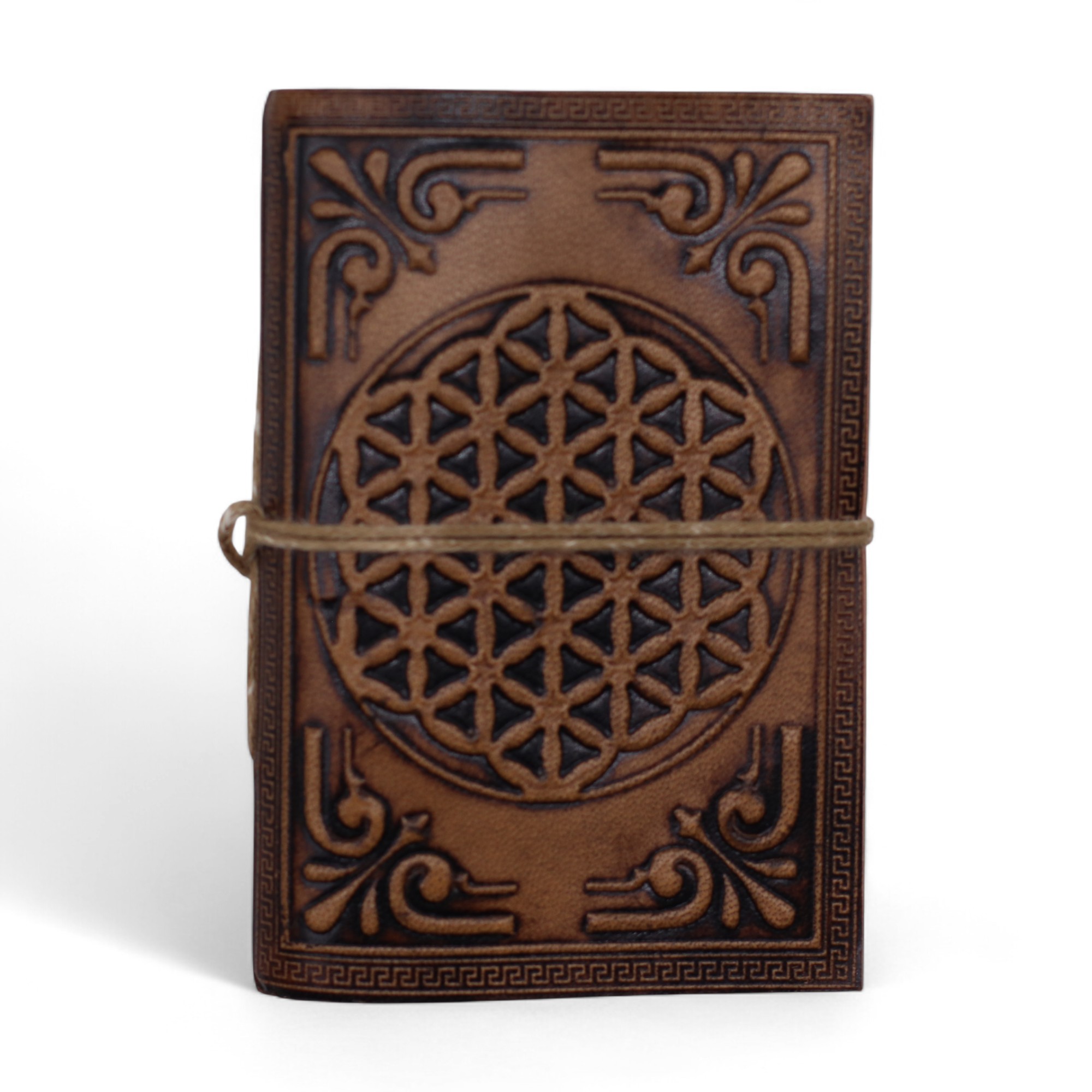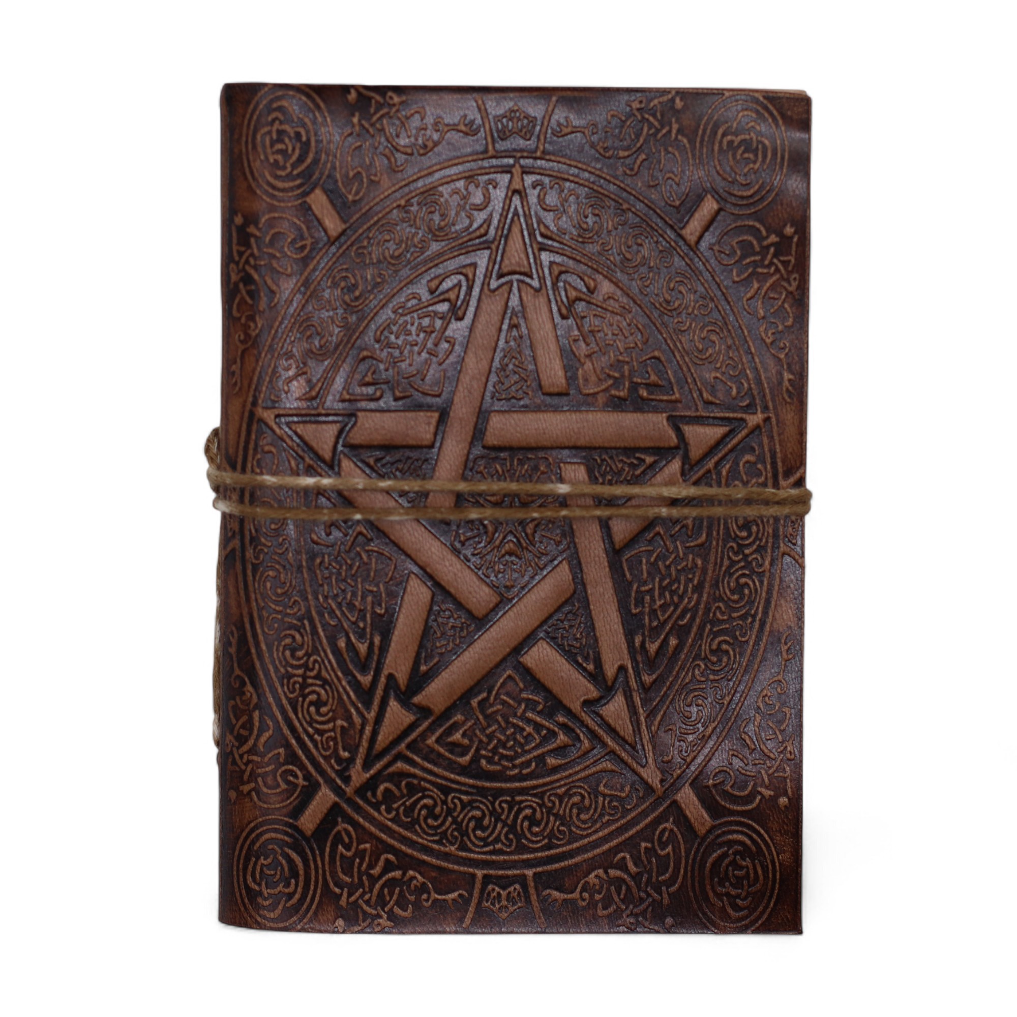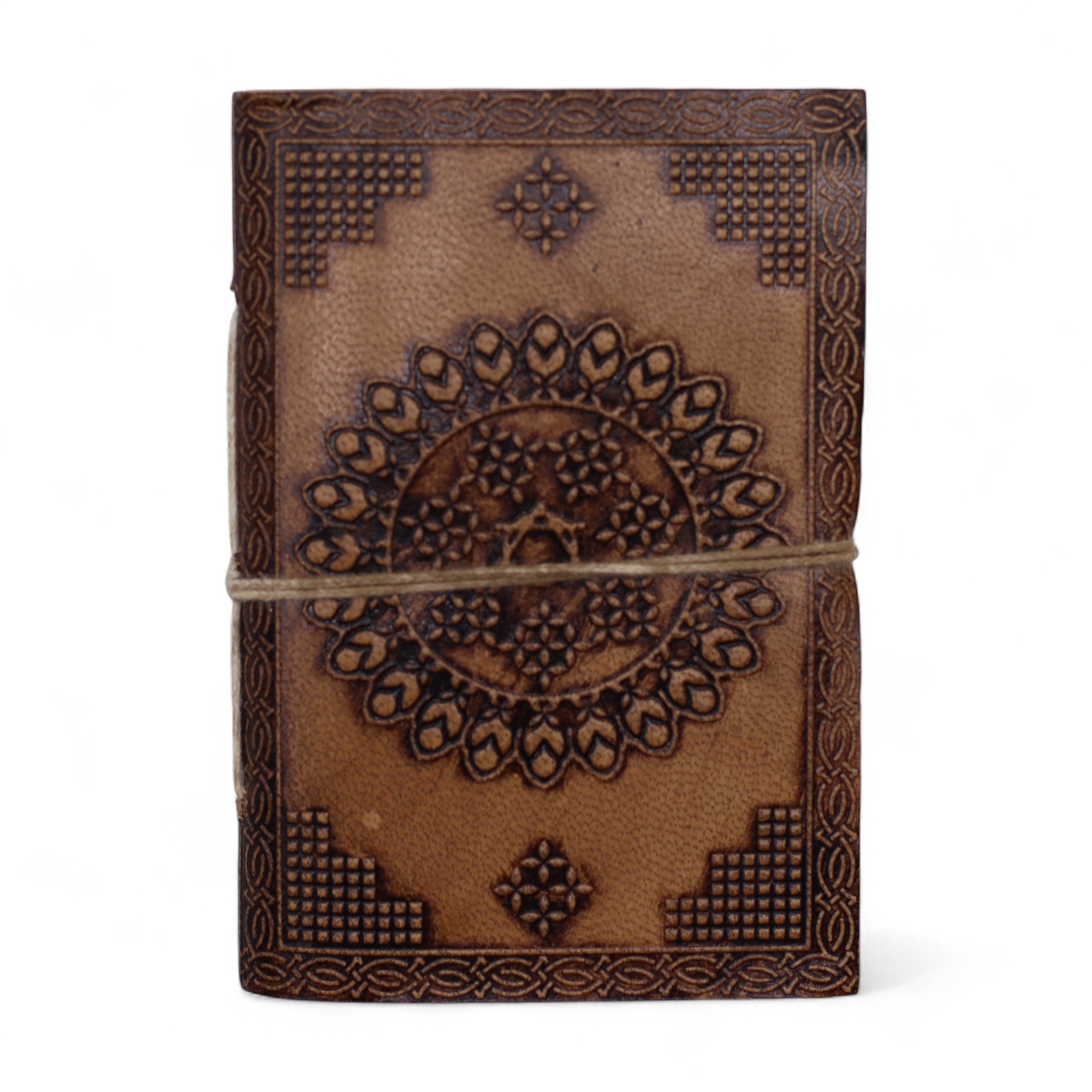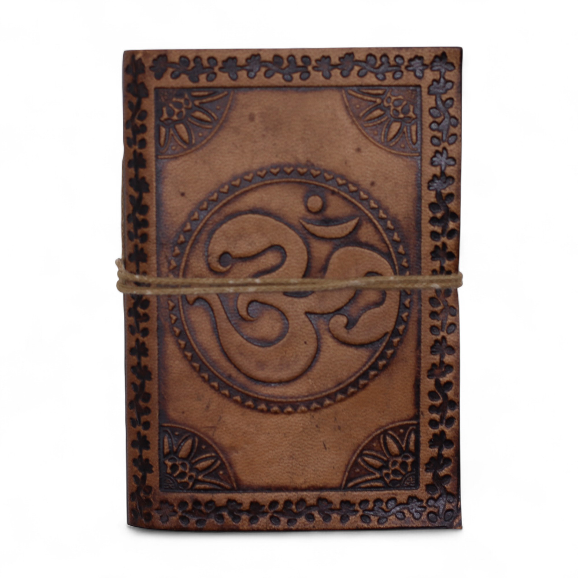 A compact collection of handcrafted leather notebooks featuring embossed esoteric and spiritual designs such as the Tree of Life, Pentagram, and Om symbol. Each notebook is bound with a rustic wrap-around string, adding a touch of vintage charm while keeping pages secure.