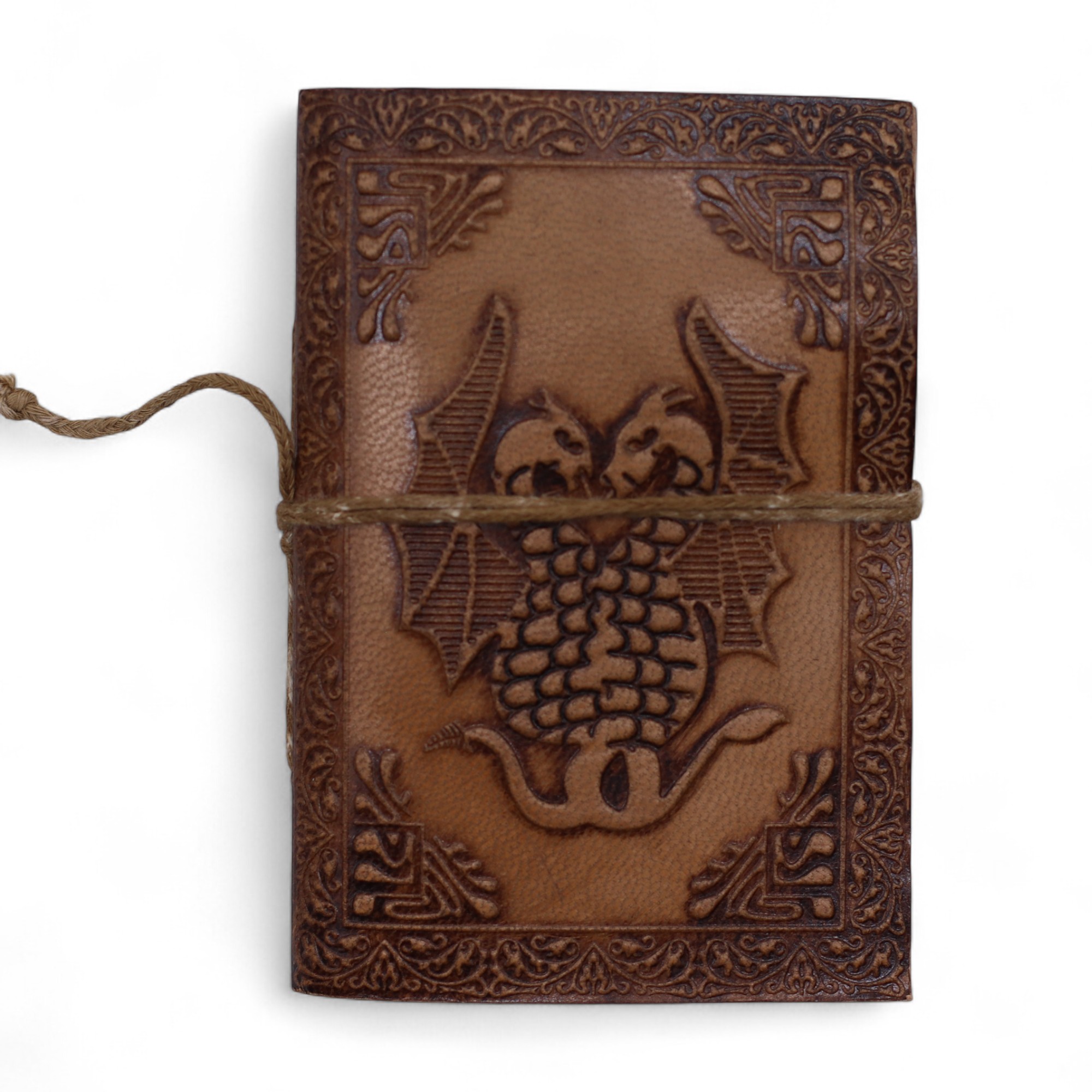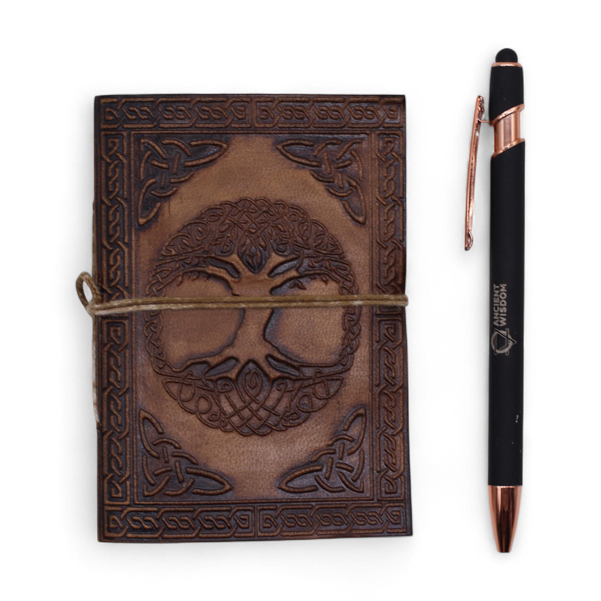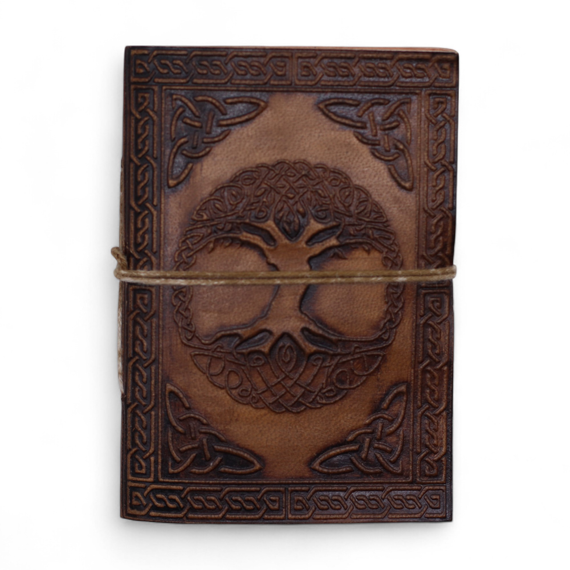 A compact collection of handcrafted leather notebooks featuring embossed esoteric and spiritual designs such as the Tree of Life, Pentagram, and Om symbol. Each notebook is bound with a rustic wrap-around string, adding a touch of vintage charm while keeping pages secure.