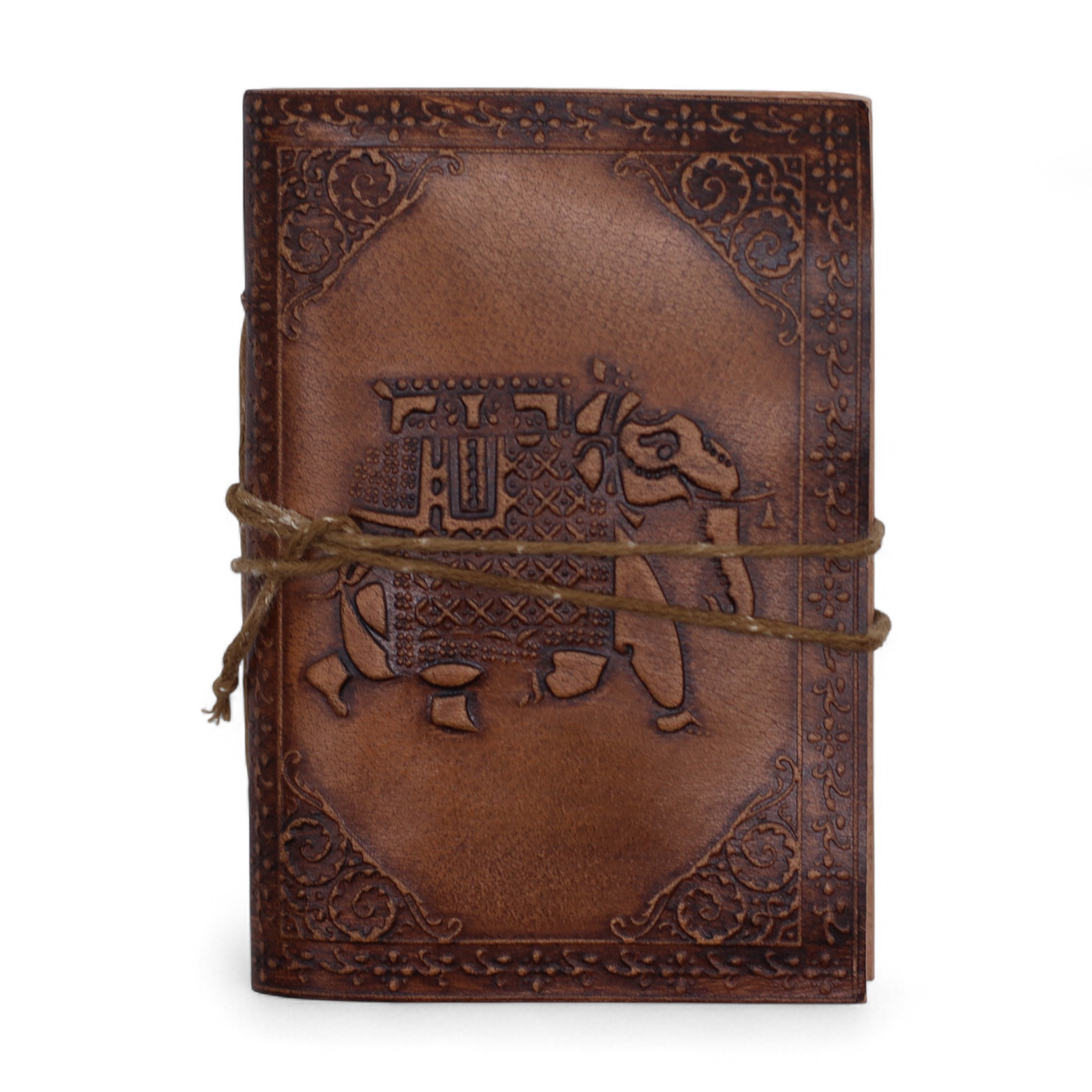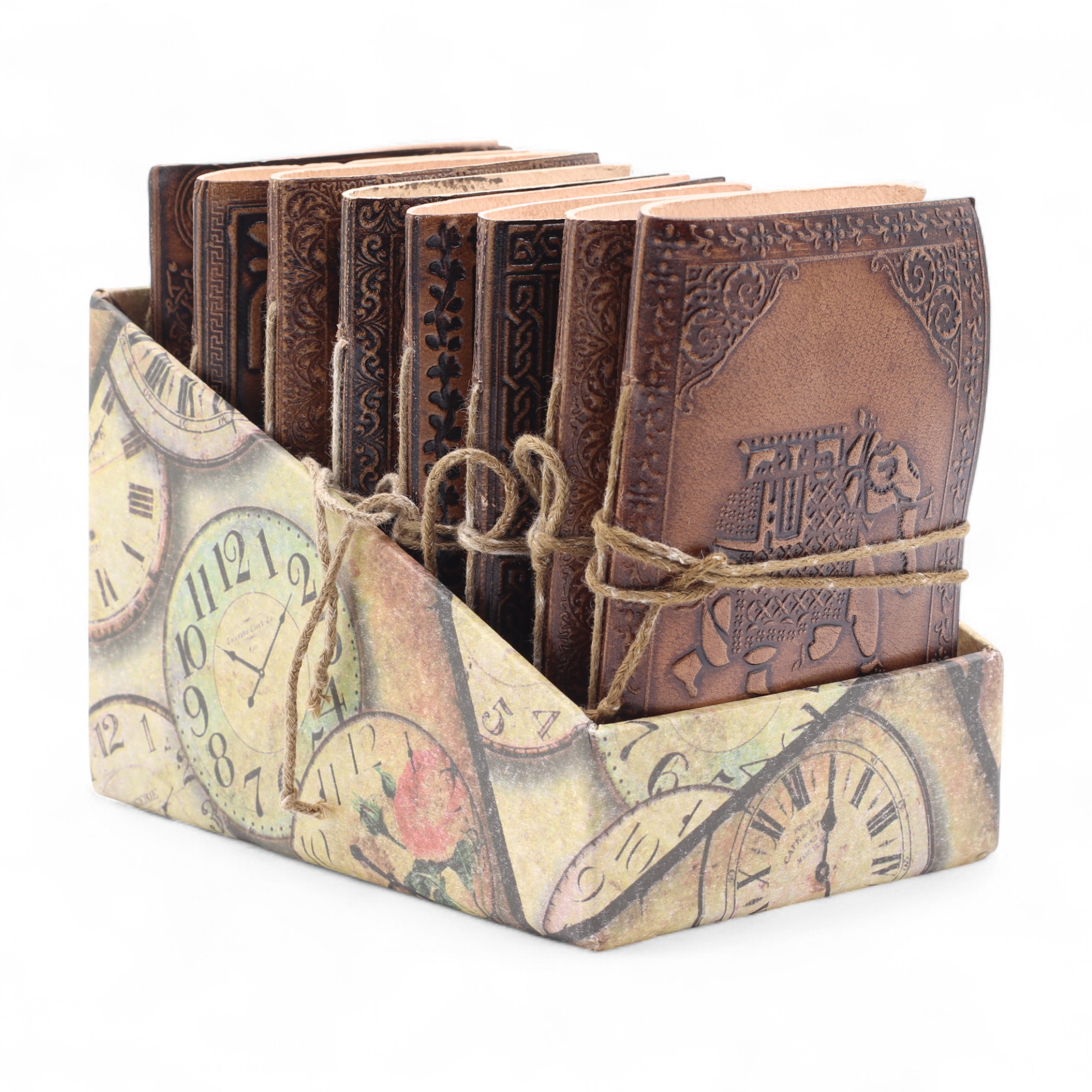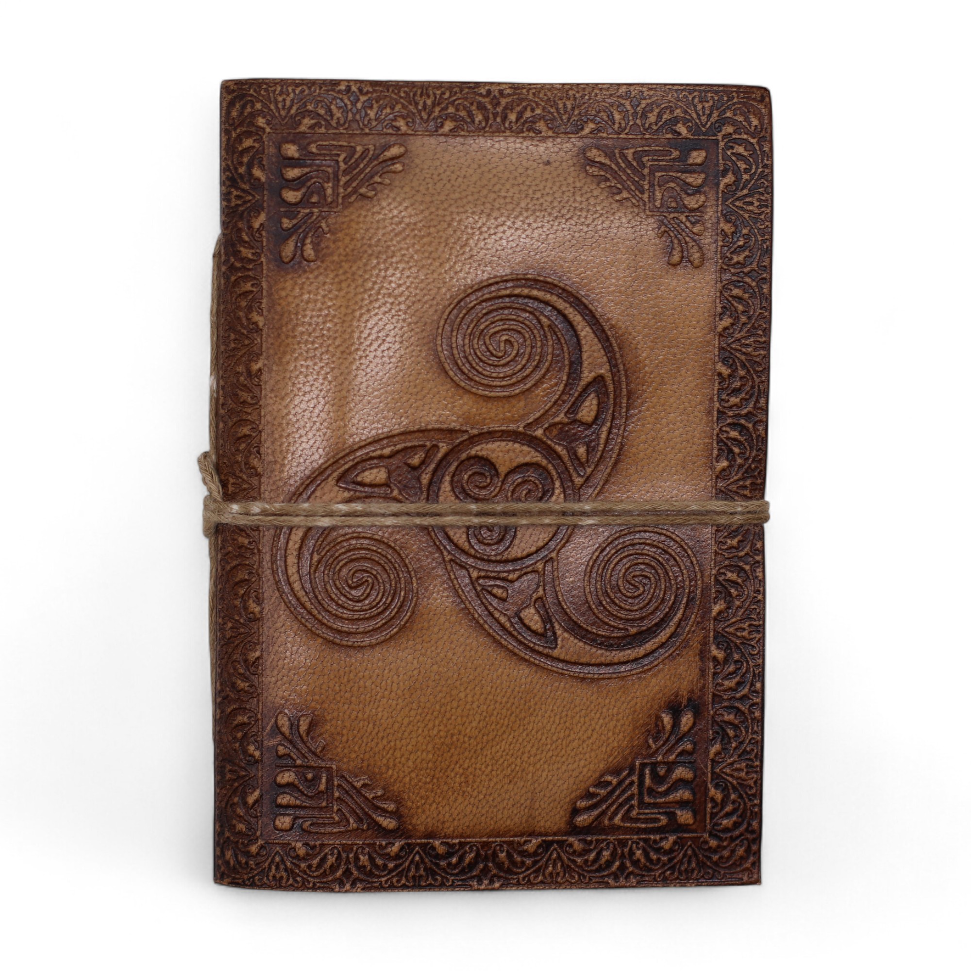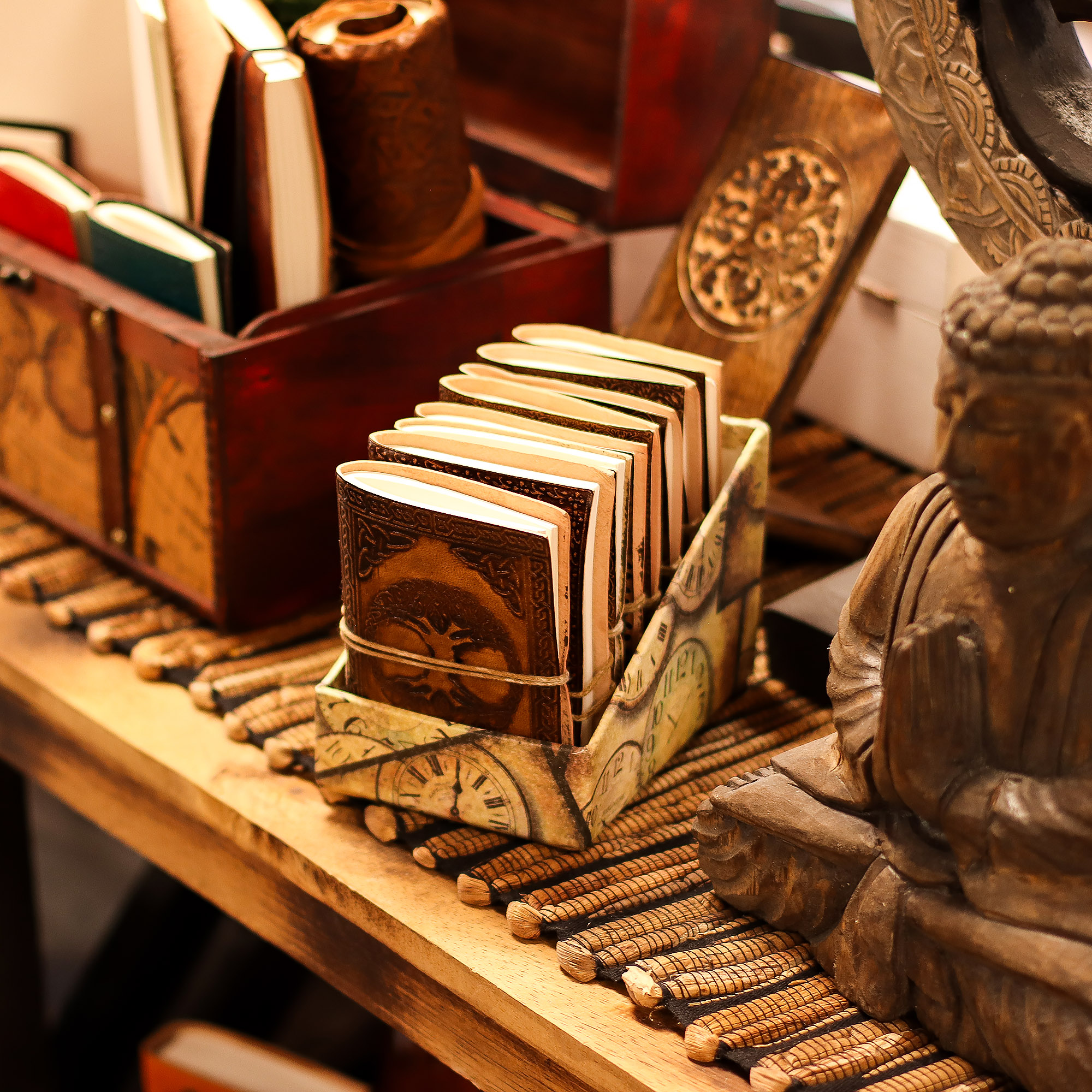 A compact collection of handcrafted leather notebooks featuring embossed esoteric and spiritual designs such as the Tree of Life, Pentagram, and Om symbol. Each notebook is bound with a rustic wrap-around string, adding a touch of vintage charm while keeping pages secure.