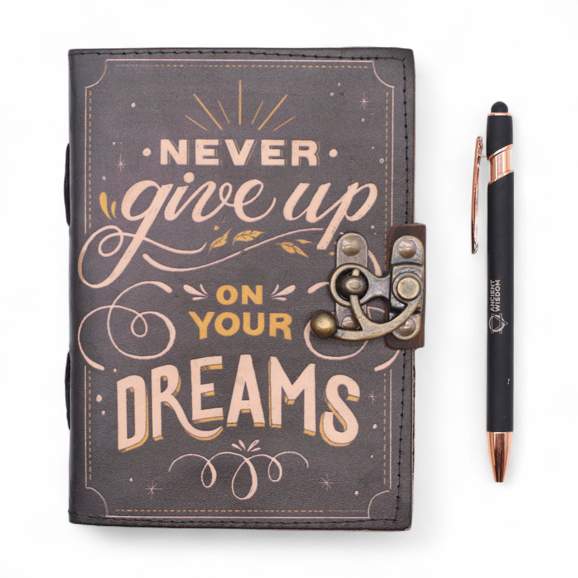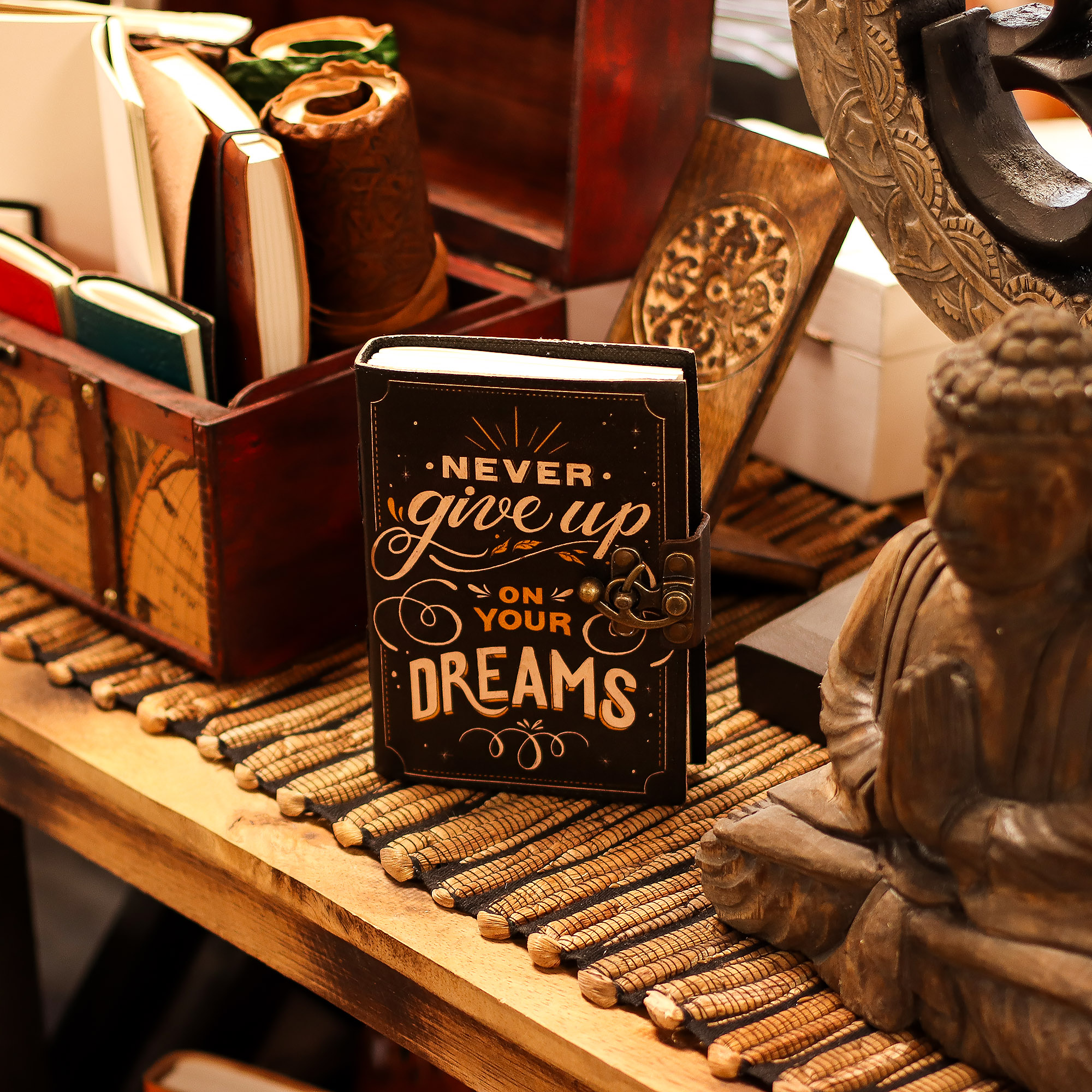 An inspiring and beautifully designed notebook made from genuine leather, embossed with the motivational quote “Never Give Up On Your Dreams.” The elegant typography, soft matte finish, and warm golden accents make it as stylish as it is meaningful.
