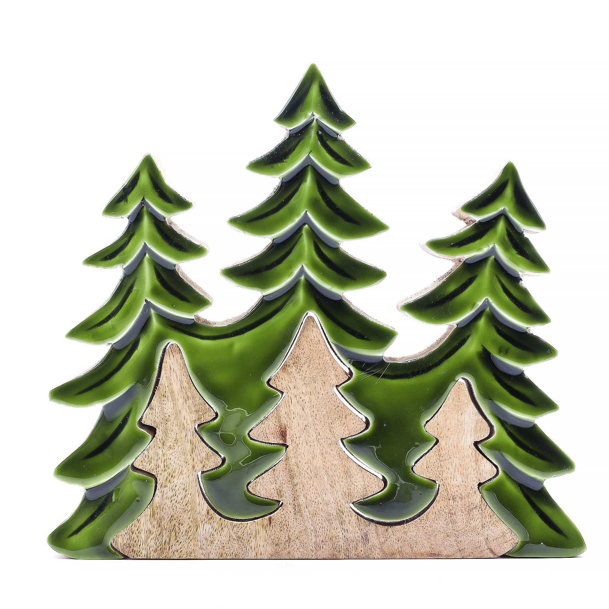 You will receive 3 handcrafted 3D tree decorations featuring layered mango wood and green enamel designs, each measuring approx. 20x23cm.