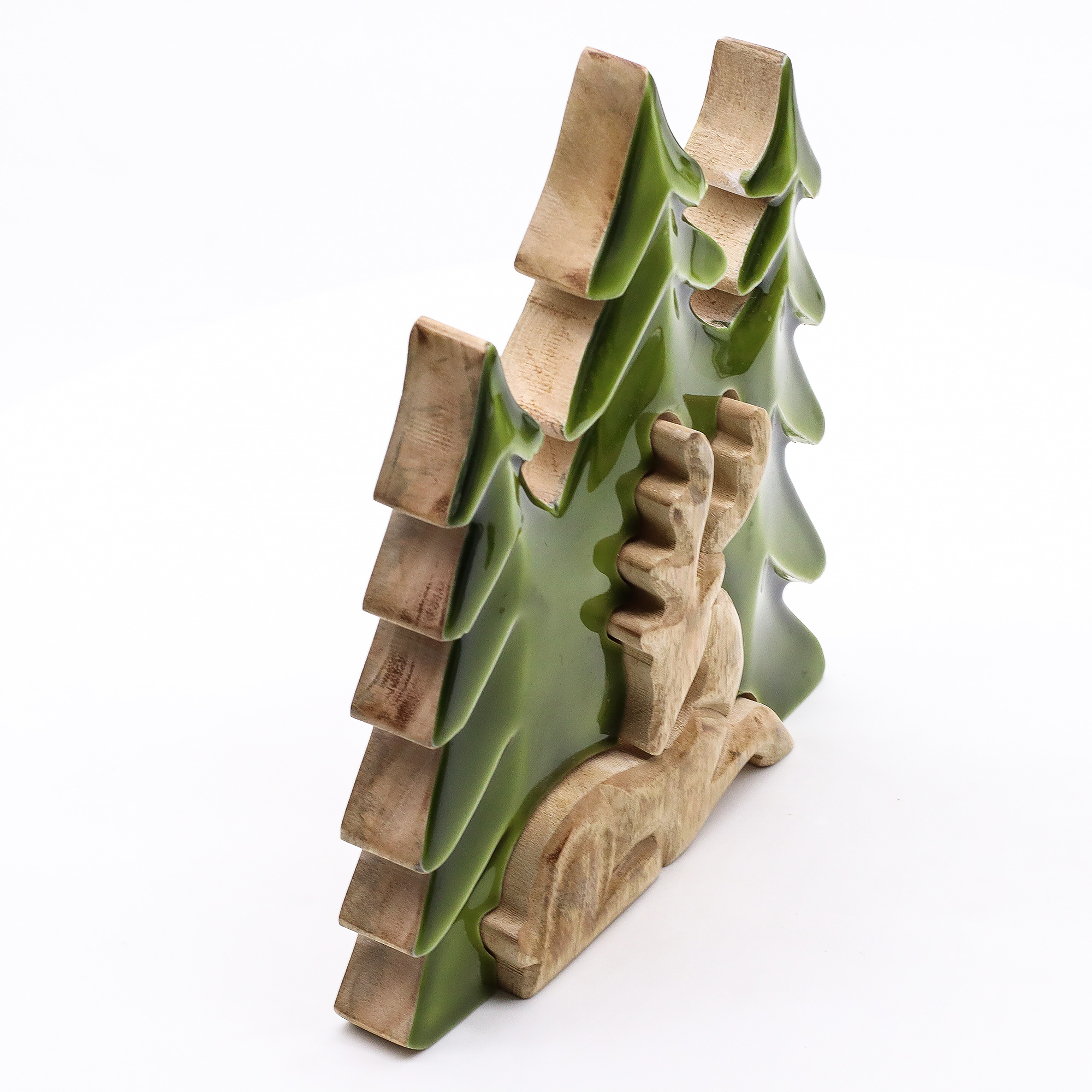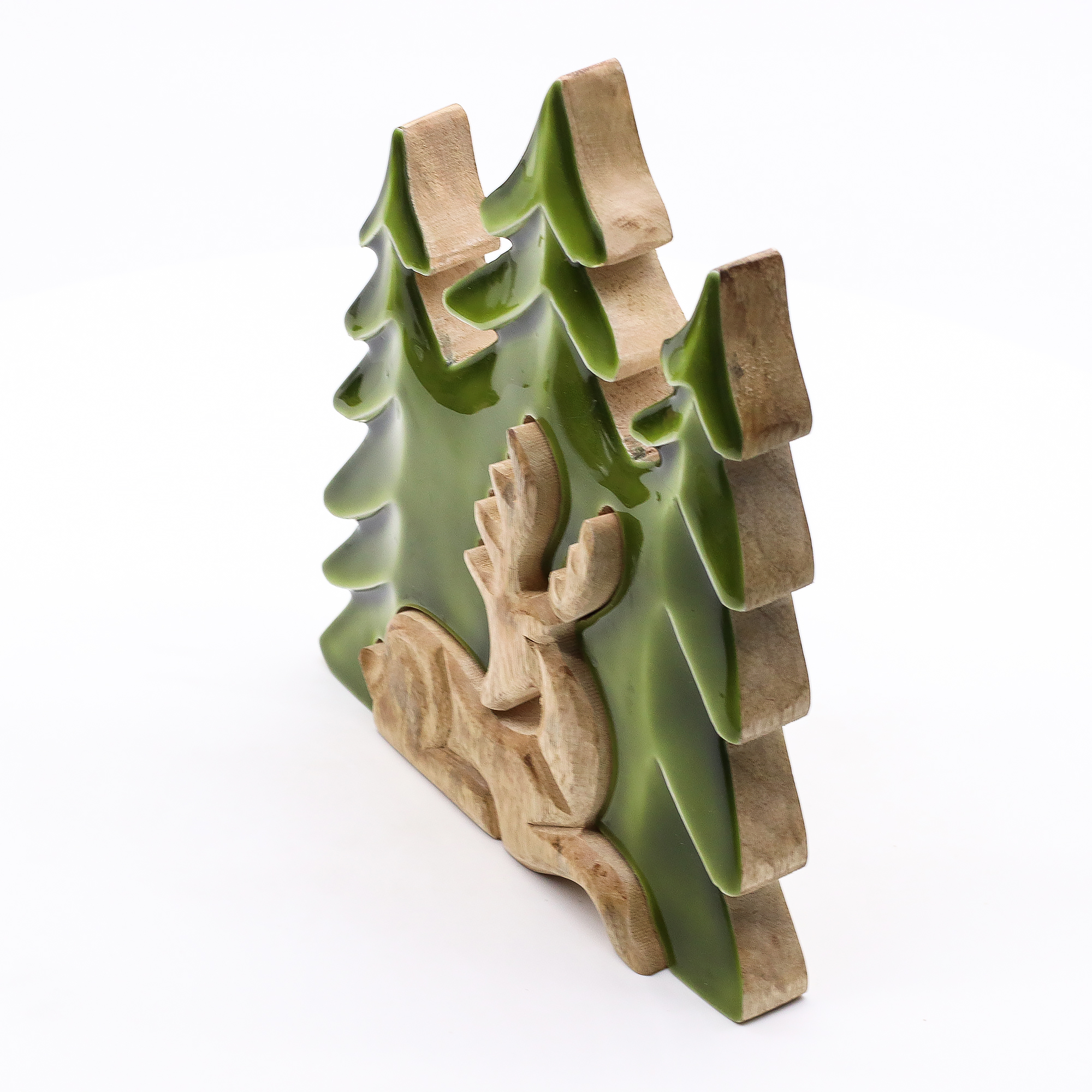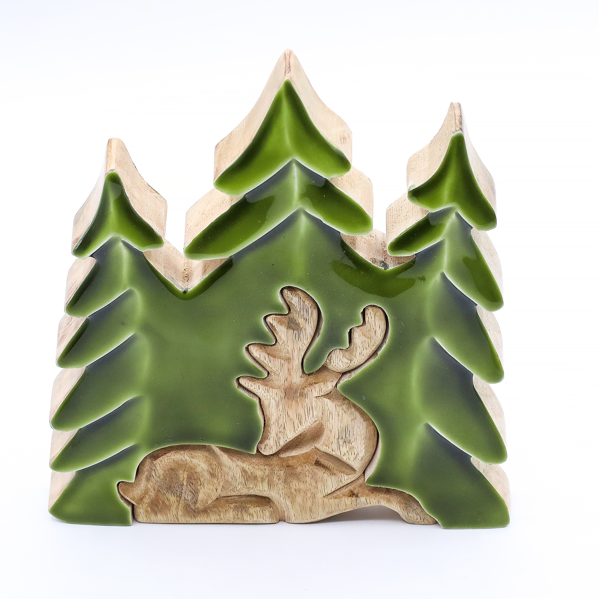 Bring a moment of woodland stillness to your displays with this elegant Stag in the Forest ornament. Carved from mango wood and finished with rich green enamel, this piece features a majestic stag peacefully resting under the shelter of three tall trees. The layered 3D design adds depth and warmth to any festive or rustic arrangement.