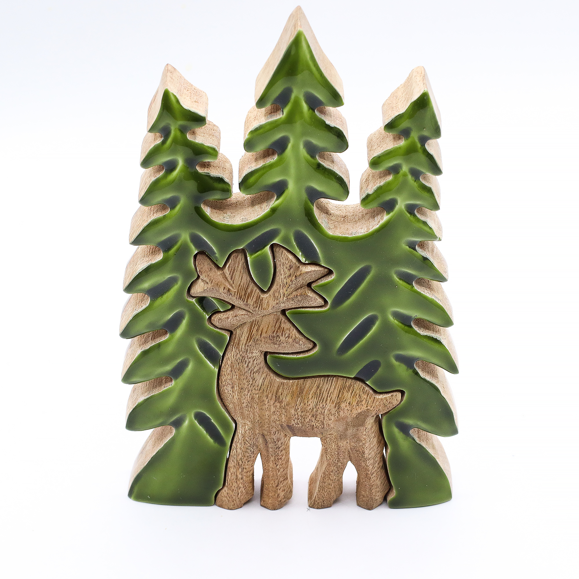 Celebrate woodland magic with this striking Stag in the Forest ornament. Beautifully carved from mango wood and detailed with glossy green enamel, this decoration features a proud stag standing amongst three stylised pine trees. The layered 3D design gives it visual depth and a handcrafted charm that stands out on shelves or displays.