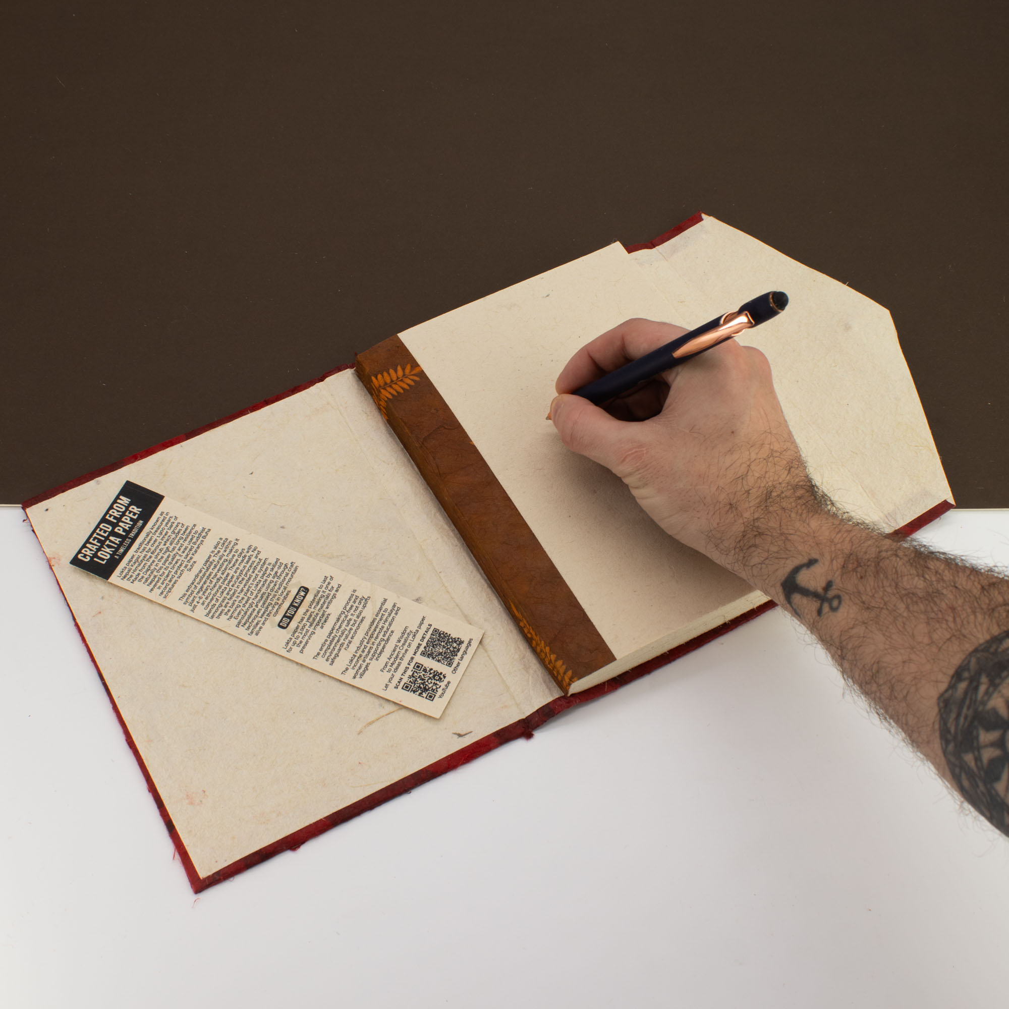 This Large Lokta Bold Floral Notebook in Ruby is a striking, eco-friendly choice for those who appreciate natural textures and handmade quality. Crafted from sustainable Lokta paper, this notebook features a vibrant red cover decorated with bold leaf patterns and real pressed floral accents.