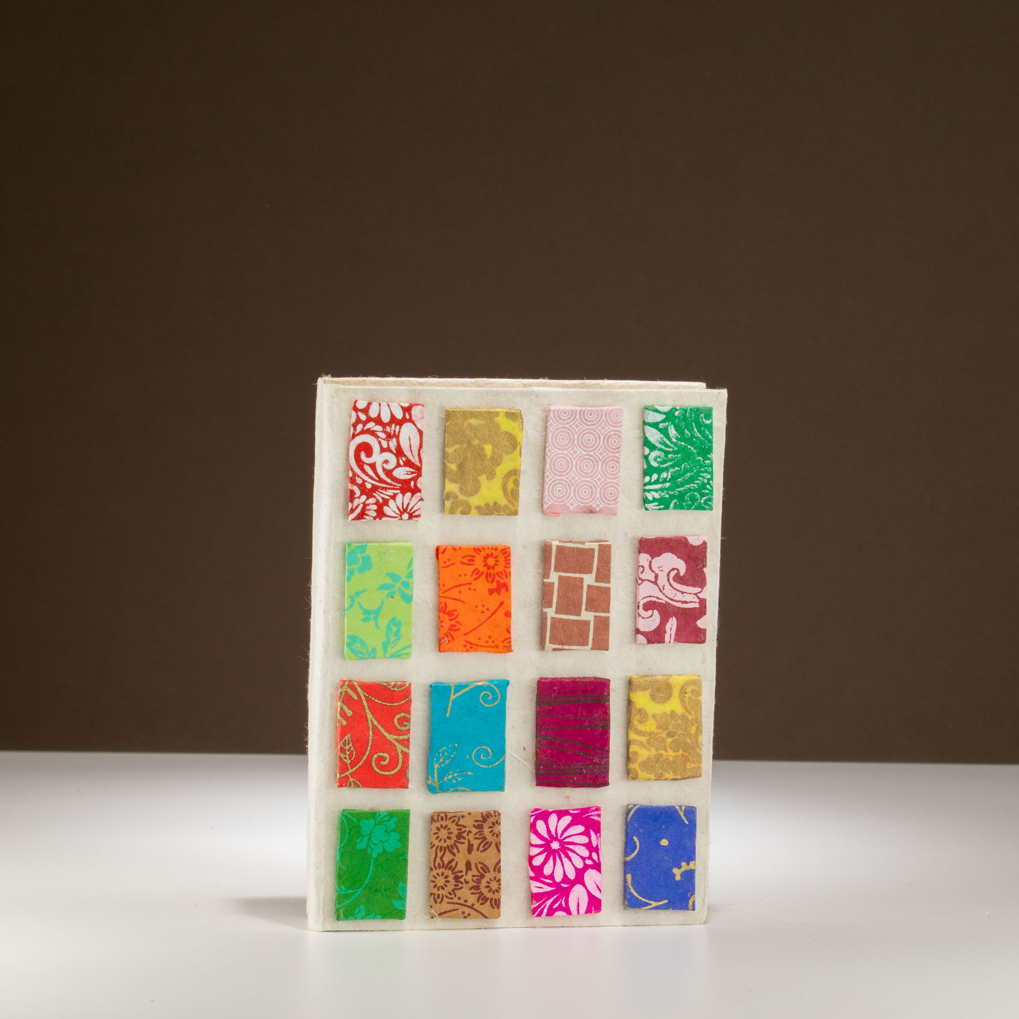 The cover is handcrafted from sustainable Lokta paper in a clean natural white. It features a grid of 16 raised "mini tiles", each individually wrapped in scraps of colorful, patterned Lokta paper. These tiles showcase a variety of traditional motifs — from intricate florals to geometric patterns — creating a vibrant 3D patchwork effect against the neutral background.