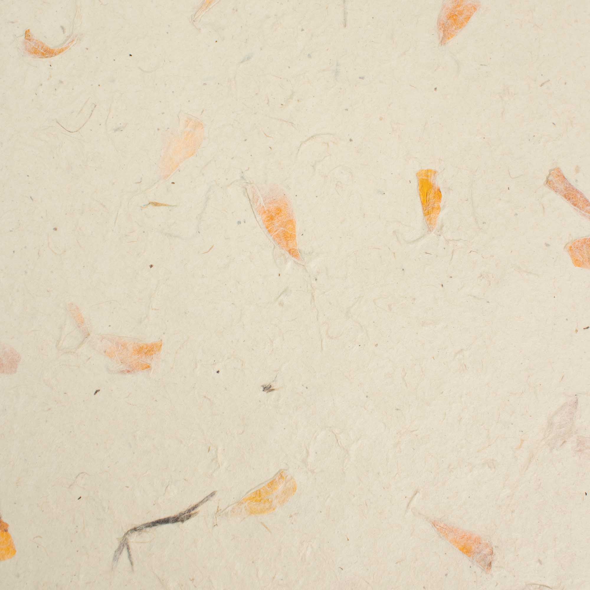 While the paper is being formed, fresh marigold petals are scattered into the pulp, creating a stunning organic pattern. The golden-orange petals contrast beautifully against the natural, cream-colored Lokta base. Because it is handmade from the bark of the Daphne bush, the paper is exceptionally durable and acid-free.