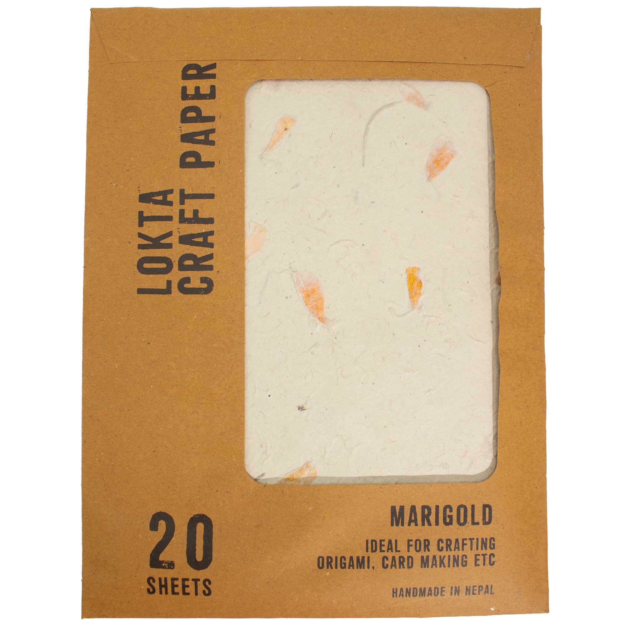 This Pack of 20 Sheets of A4 Lokta Craft Paper features real Marigold flowers pressed directly into the fibers during the papermaking process. Handcrafted in the Himalayas, this specialty paper offers a beautiful, 3D botanical texture that makes every sheet a unique work of art.