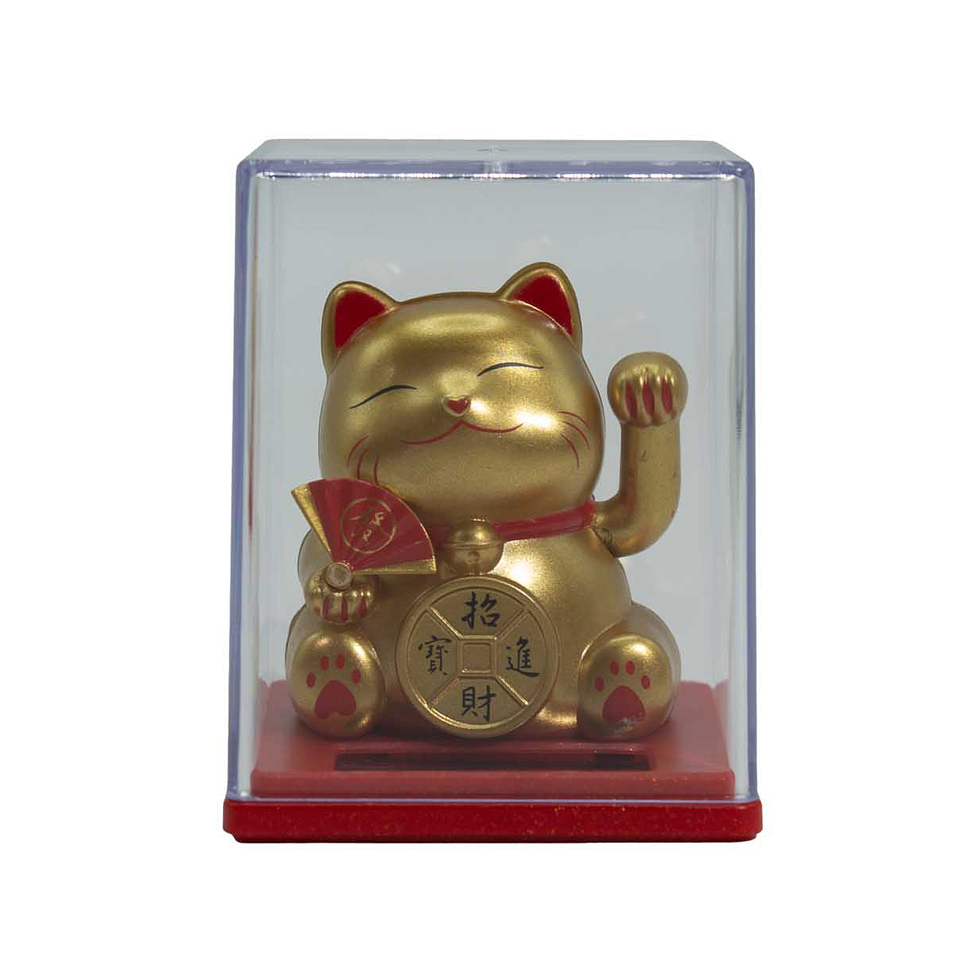 This gold-finished Maneki-neko is a classic symbol of prosperity, designed for effortless retail display. The figurine features a solar-powered waving arm that activates in both natural and artificial light, eliminating the need for batteries.