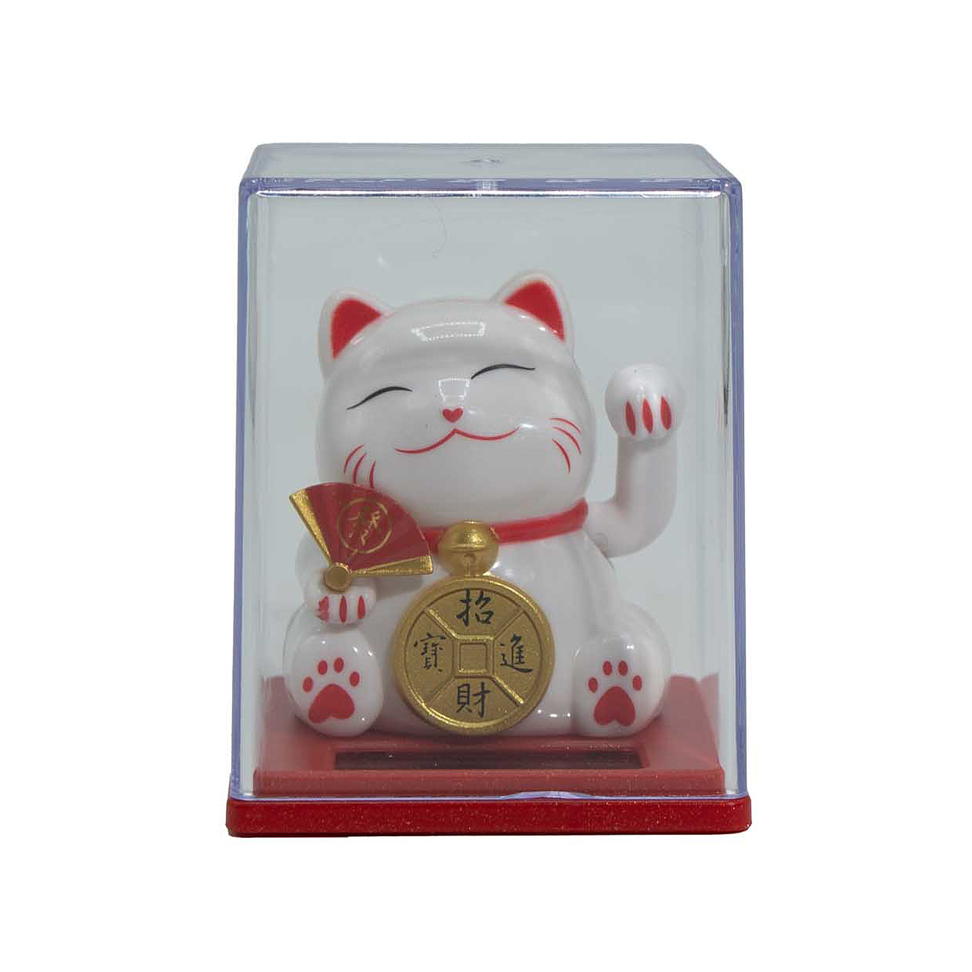 This classic white Maneki-neko symbolizes purity and happiness, making it a versatile décor piece for any setting. The figurine features a solar-powered waving arm that operates on both natural and artificial light, removing the need for battery replacements.