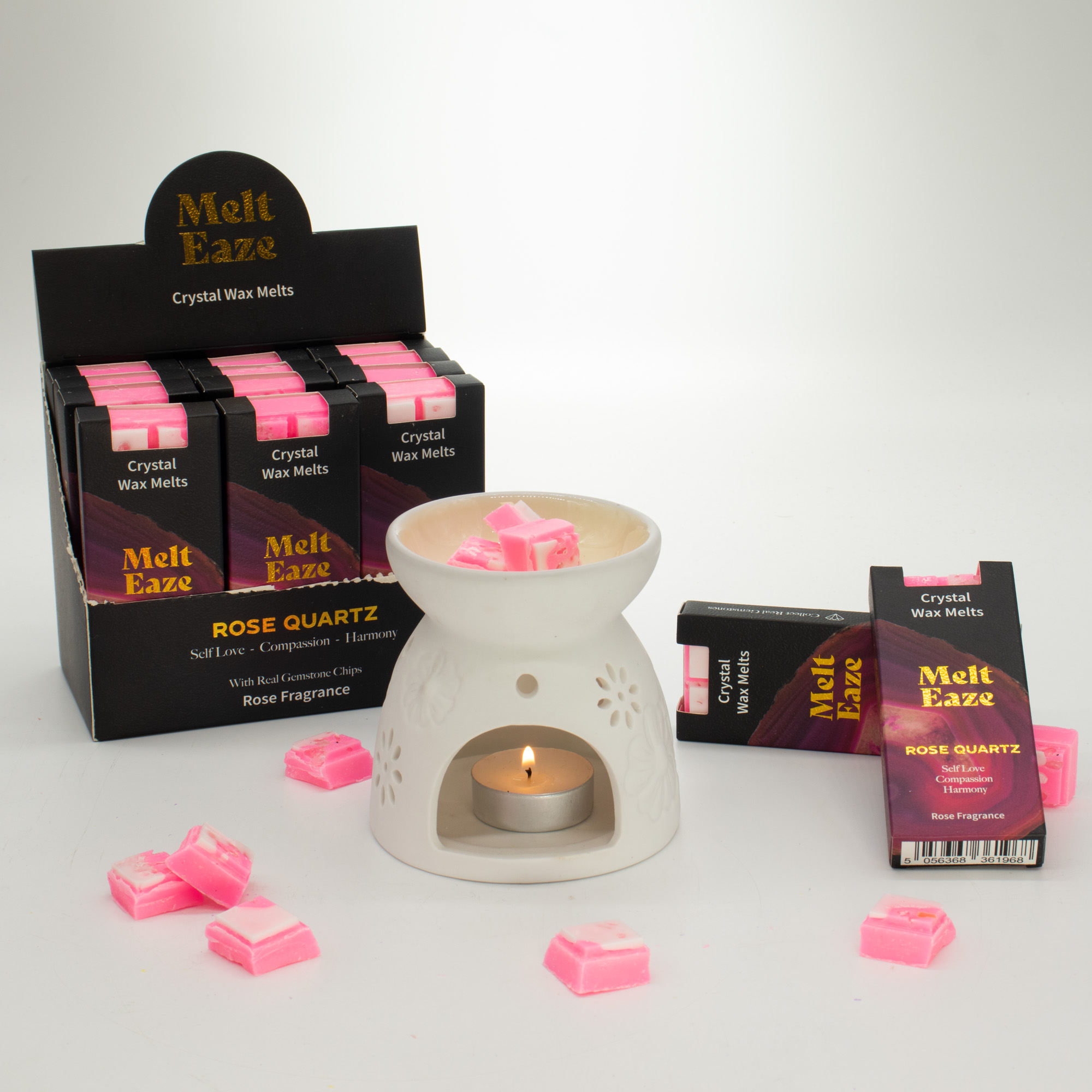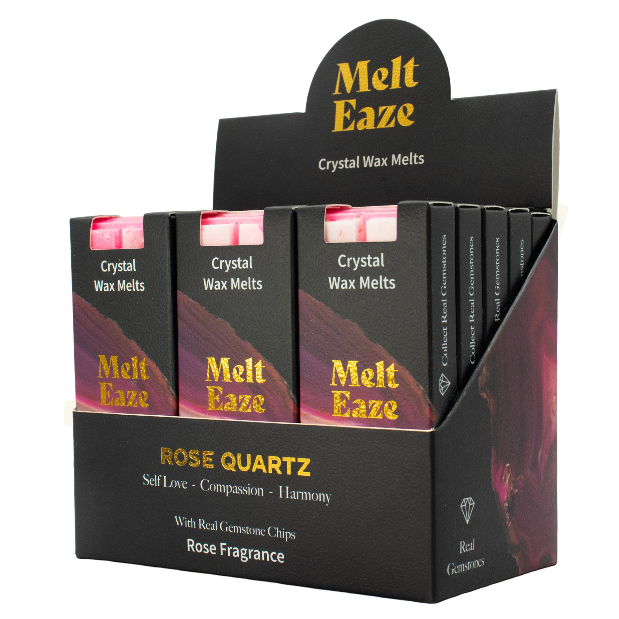 Embrace a sense of harmony with Melt Eaze Rose wax bars. Each 50g bar releases a delicate floral fragrance while revealing real Rose Quartz gemstone chips as the wax melts. Supplied in a 15-piece display box, these bars are a perfect impulse purchase for any wellness or gift-focused retail space.