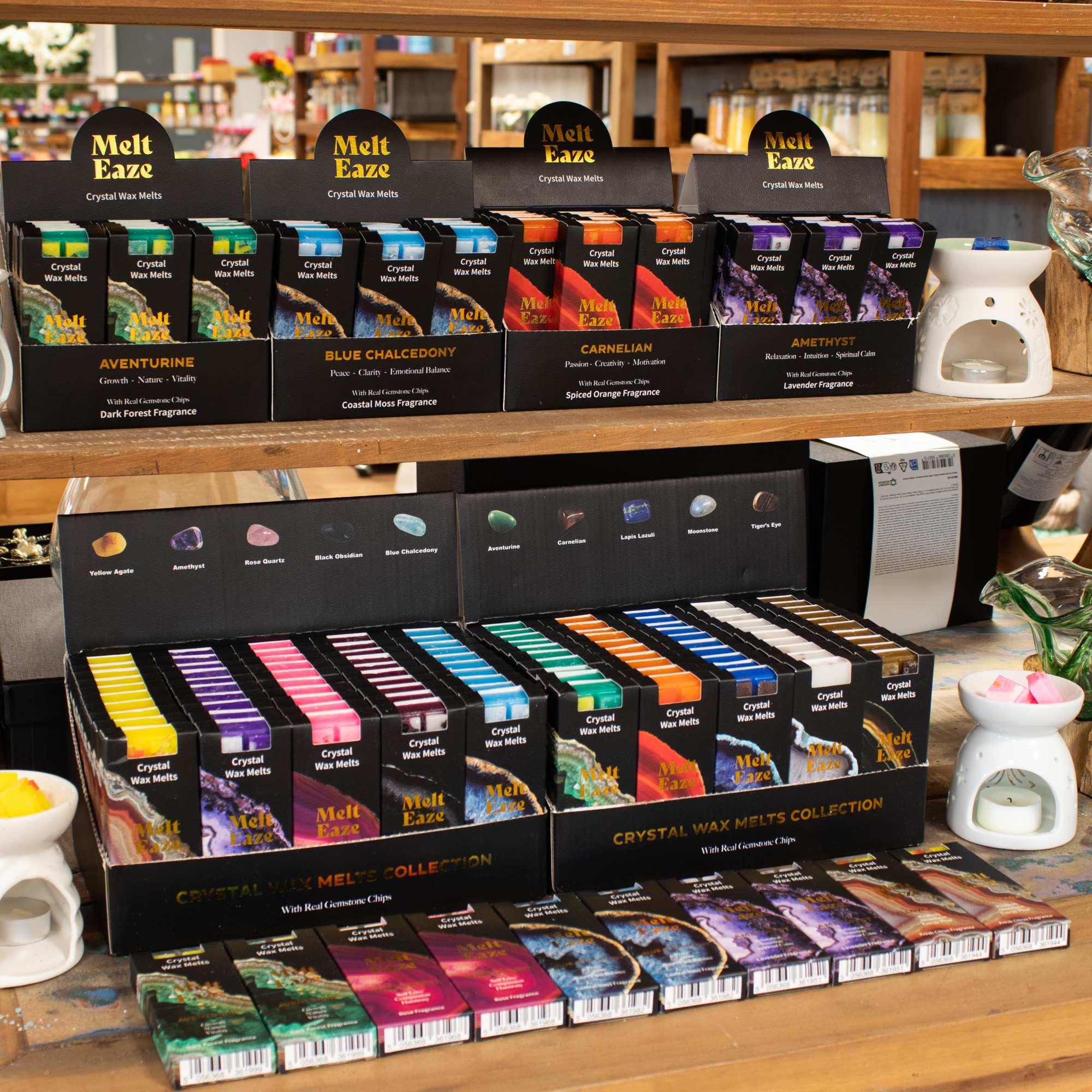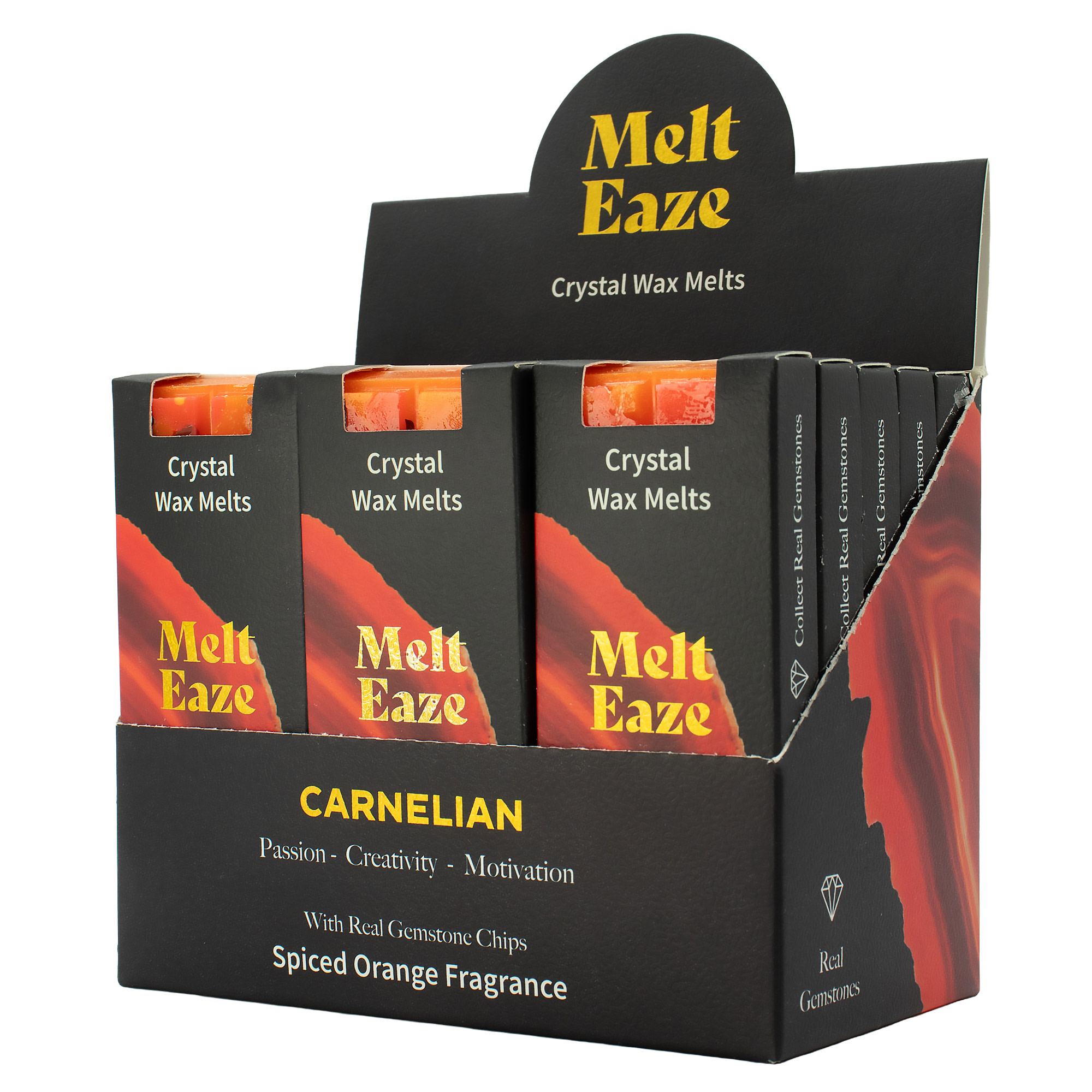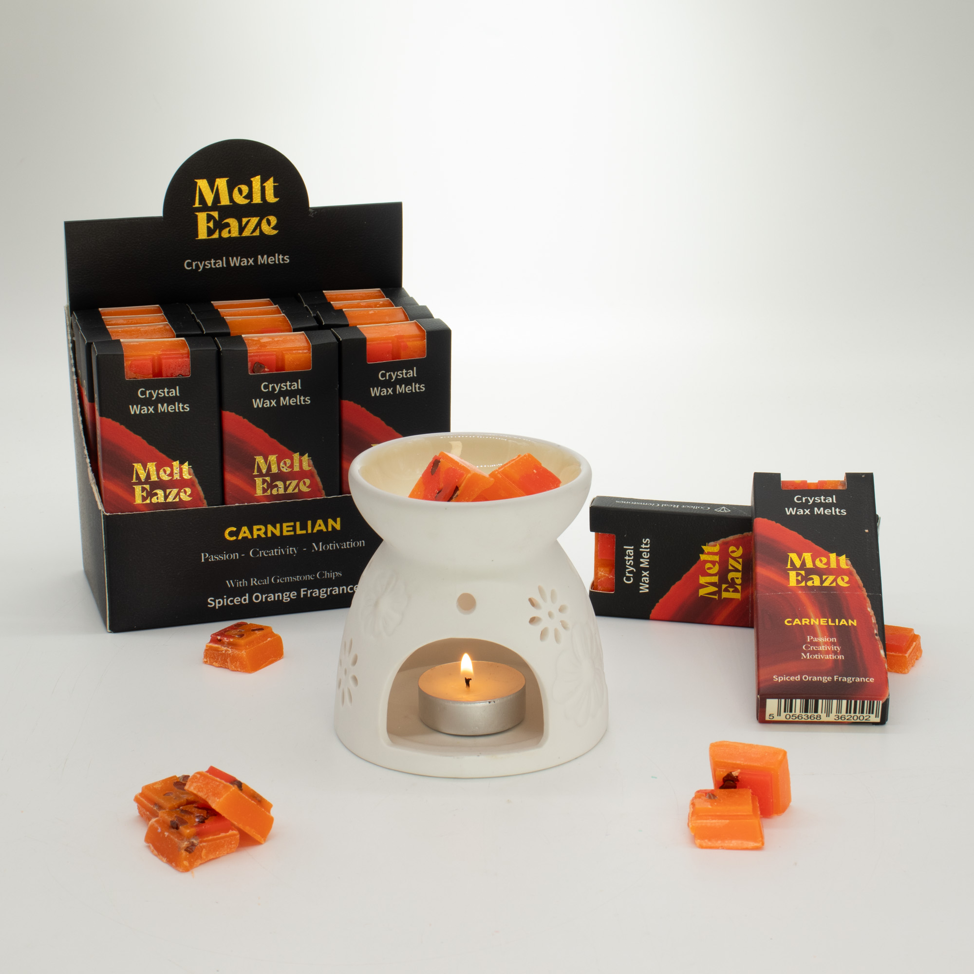 Ignite your sales with Melt Eaze Spiced Orange wax bars. Each 50g bar blends warming citrus notes with real Carnelian gemstone chips that emerge as the wax melts. This 15-piece display box is a high-impact wholesale solution, perfect for seasonal gifting and till-side impulse purchases.