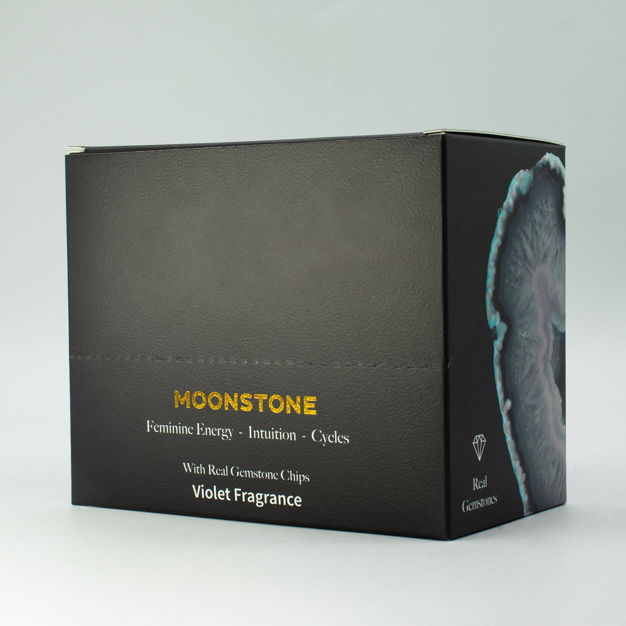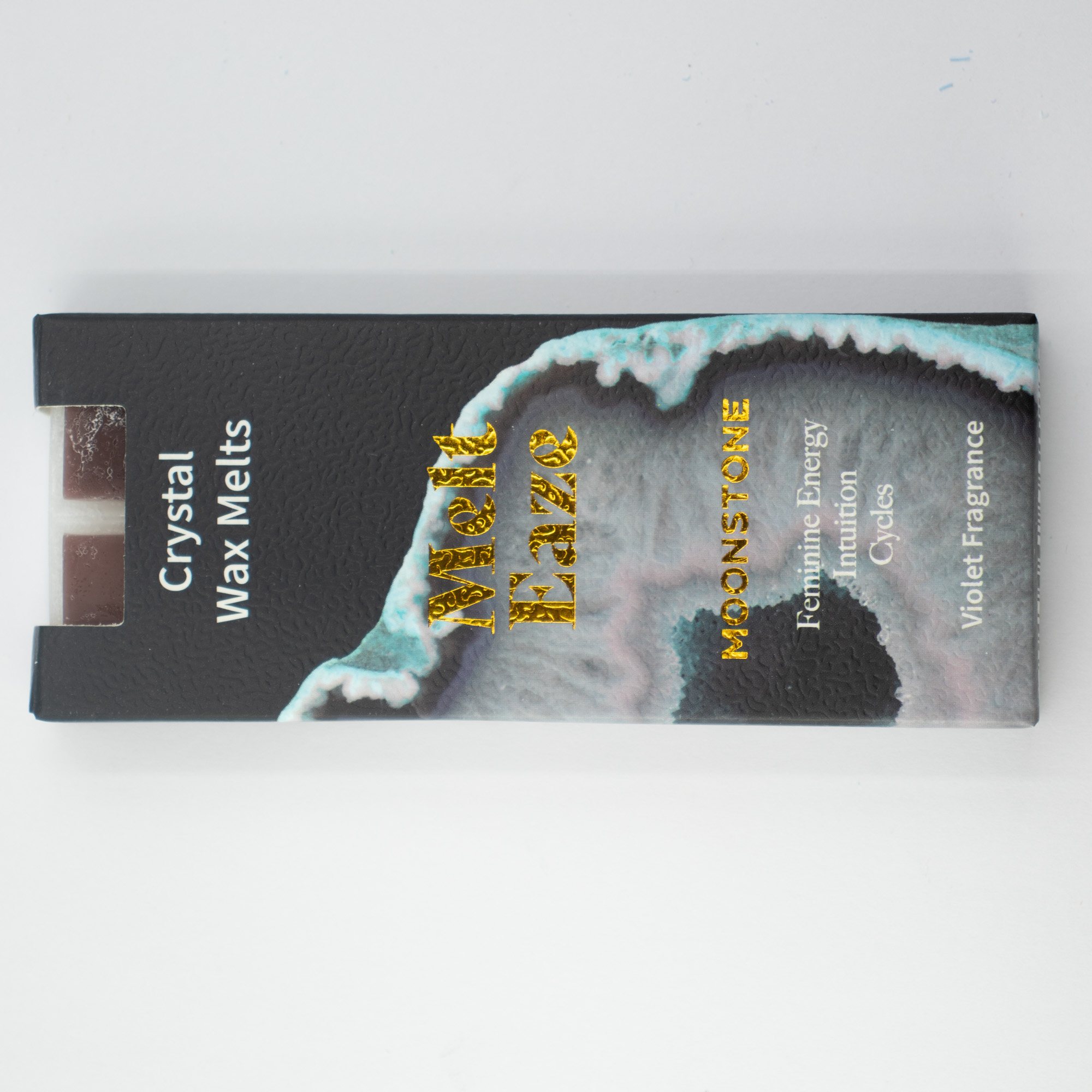 These gemstone-infused wax melt bars offer a serene sensory experience that blends ethereal fragrance with natural beauty. As the soft, powdery notes of Violet fill the room, the melting wax gradually unveils real Moonstone chips — a stone long associated with feminine energy, intuition, and the rhythm of natural cycles. Once the fragrance has faded, the customer is left with a set of milky, iridescent gemstones to collect, display, or keep as a personal talisman.