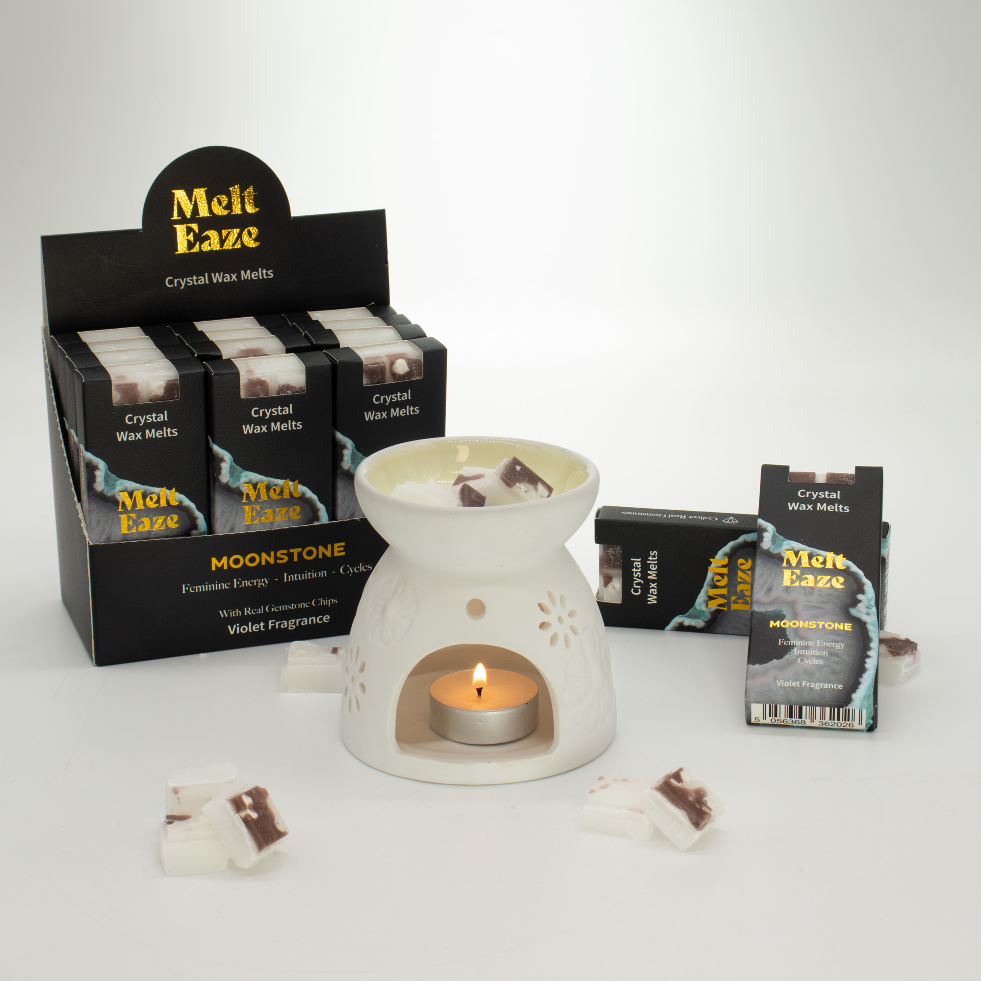 Inspire your customers with the gentle magic of Melt Eaze Violet wax bars. Each 50g bar diffuses a delicate floral scent while revealing genuine Moonstone gemstone chips as it melts. This 15-piece display box is a high-impact solution, perfect for wellness displays and impulse buys.
