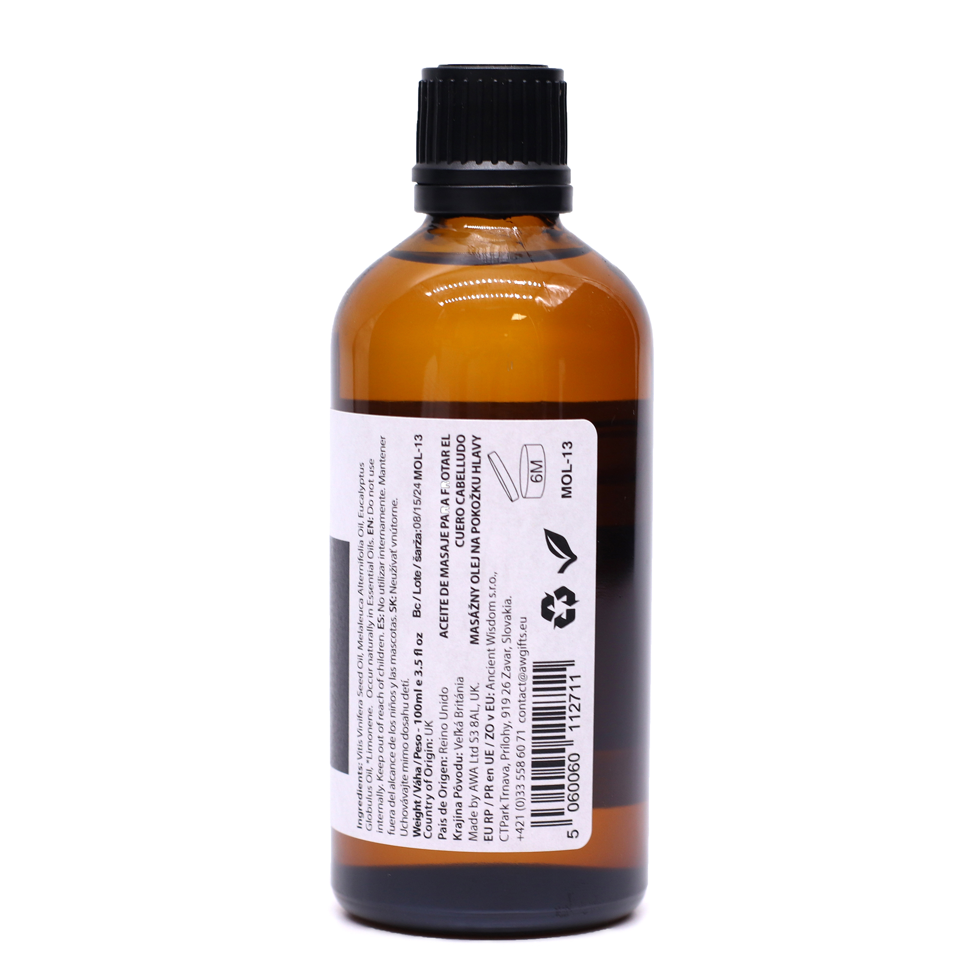 Your Scalp Massage Oil is made with worlds known Ancient Wisdom quality Tea Tree and Eucaliptus Essential Oils and Pure Grapeseed Oil.