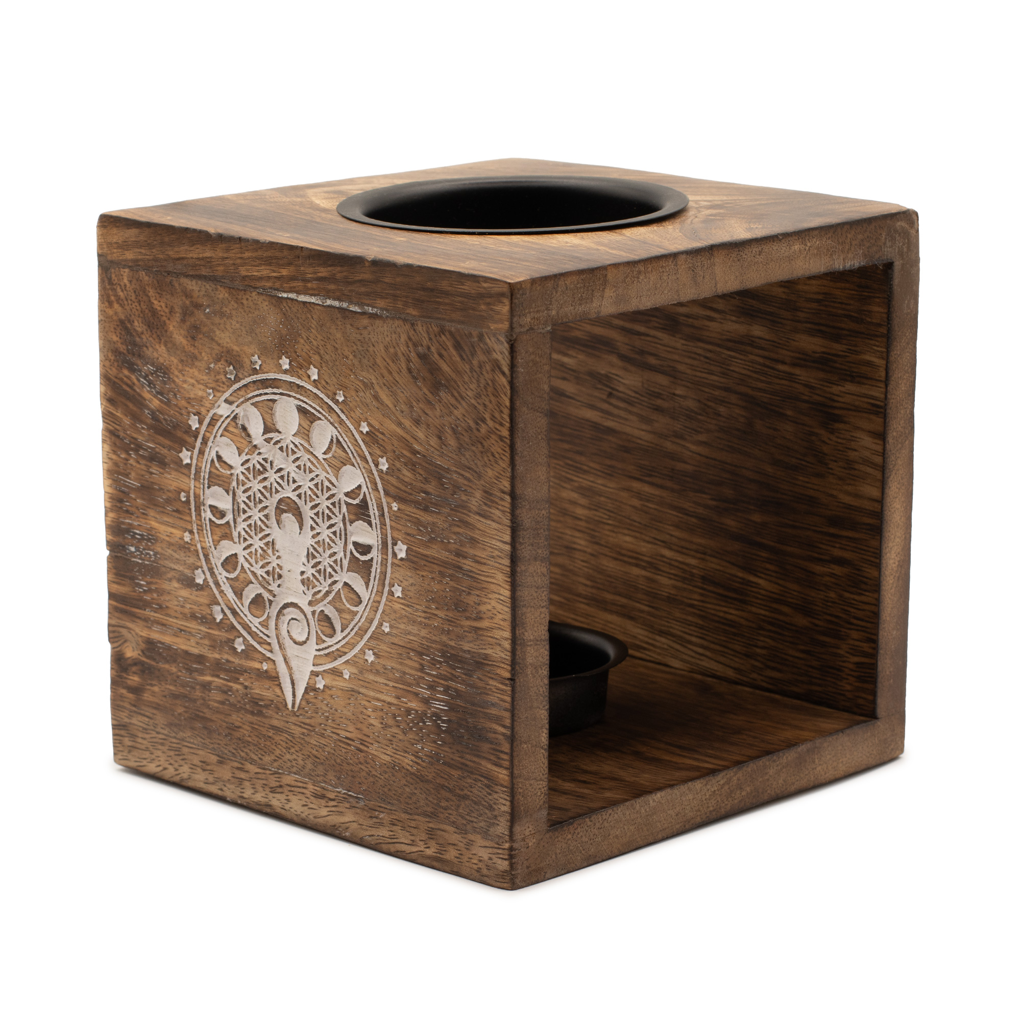 The Large Square Mango Wood Oil Burner featuring the Moon Goddess is a captivating piece that honours the divine feminine and the celestial cycles. Carved from mango wood, this burner serves as a powerful symbol of intuition and empowerment. The central engraving depicts the goddess intertwined with the crescent moon, detailed with a delicate white-washed finish that contrasts beautifully against the deep, chocolate tones of the natural wood grain. Its larger dimensions make it a striking decorative statement for customers who appreciate pagan, Wiccan, or lunar-inspired aesthetics.
