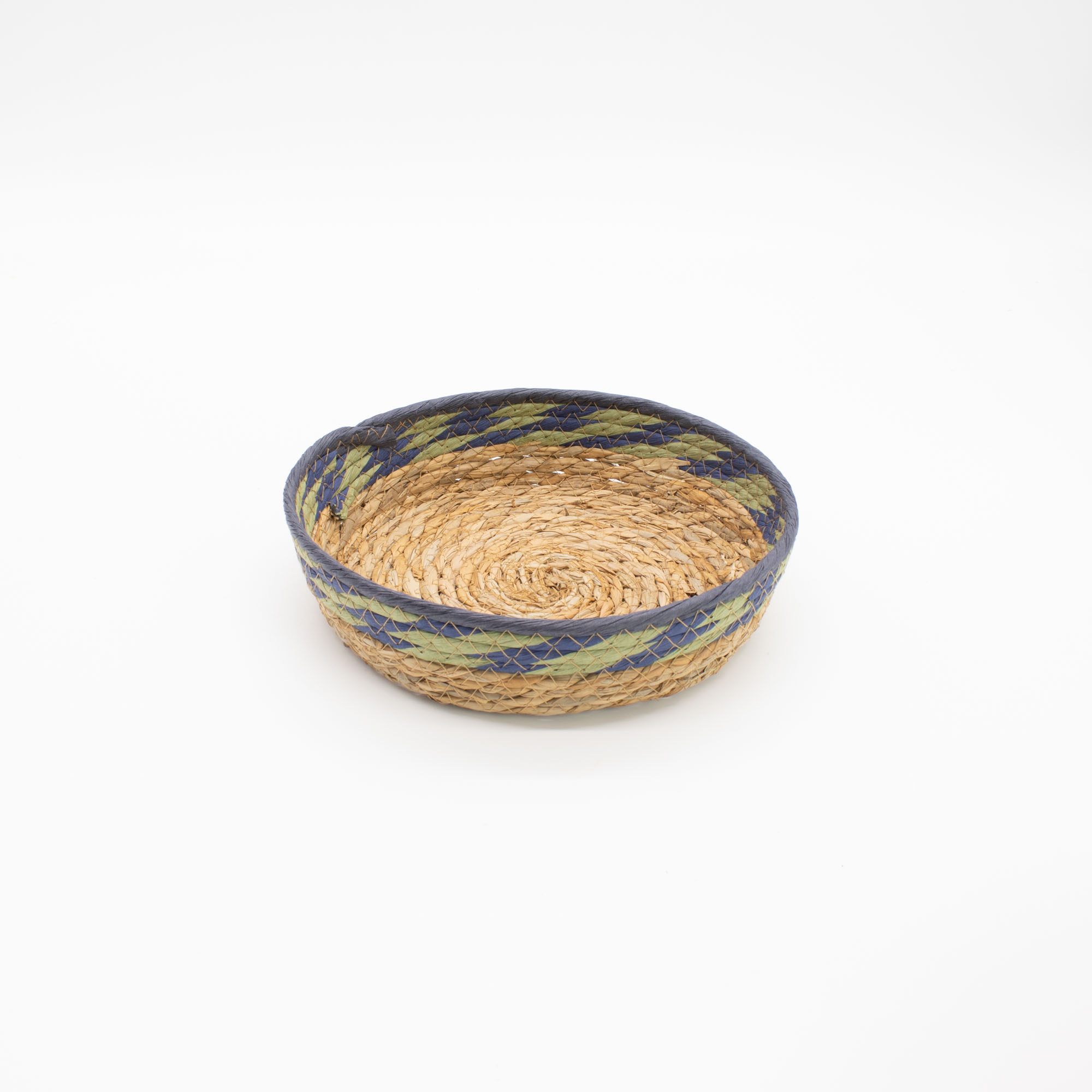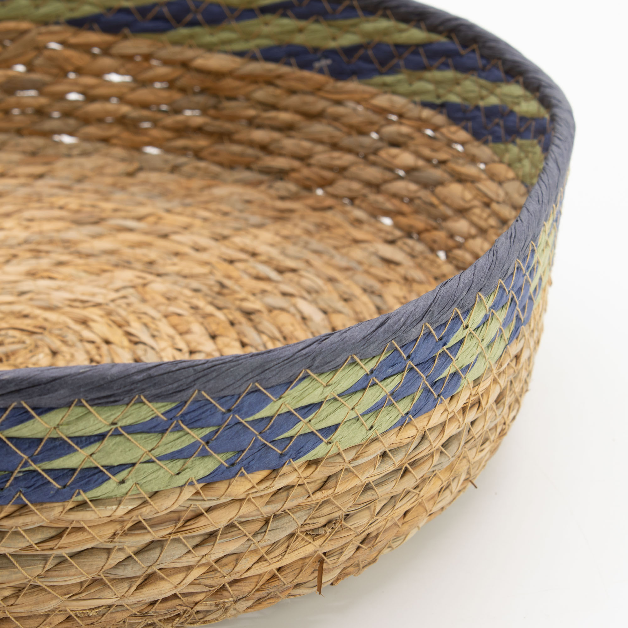These tray-style baskets are handwoven using tightly coiled straw and seagrass fibres, a traditional technique that creates a sturdy, structured base while maintaining the natural flexibility of the material. The woven construction highlights subtle tonal variations in the fibres, while the blue and green edge detailing adds a soft colour accent that enhances the handcrafted character of each piece.