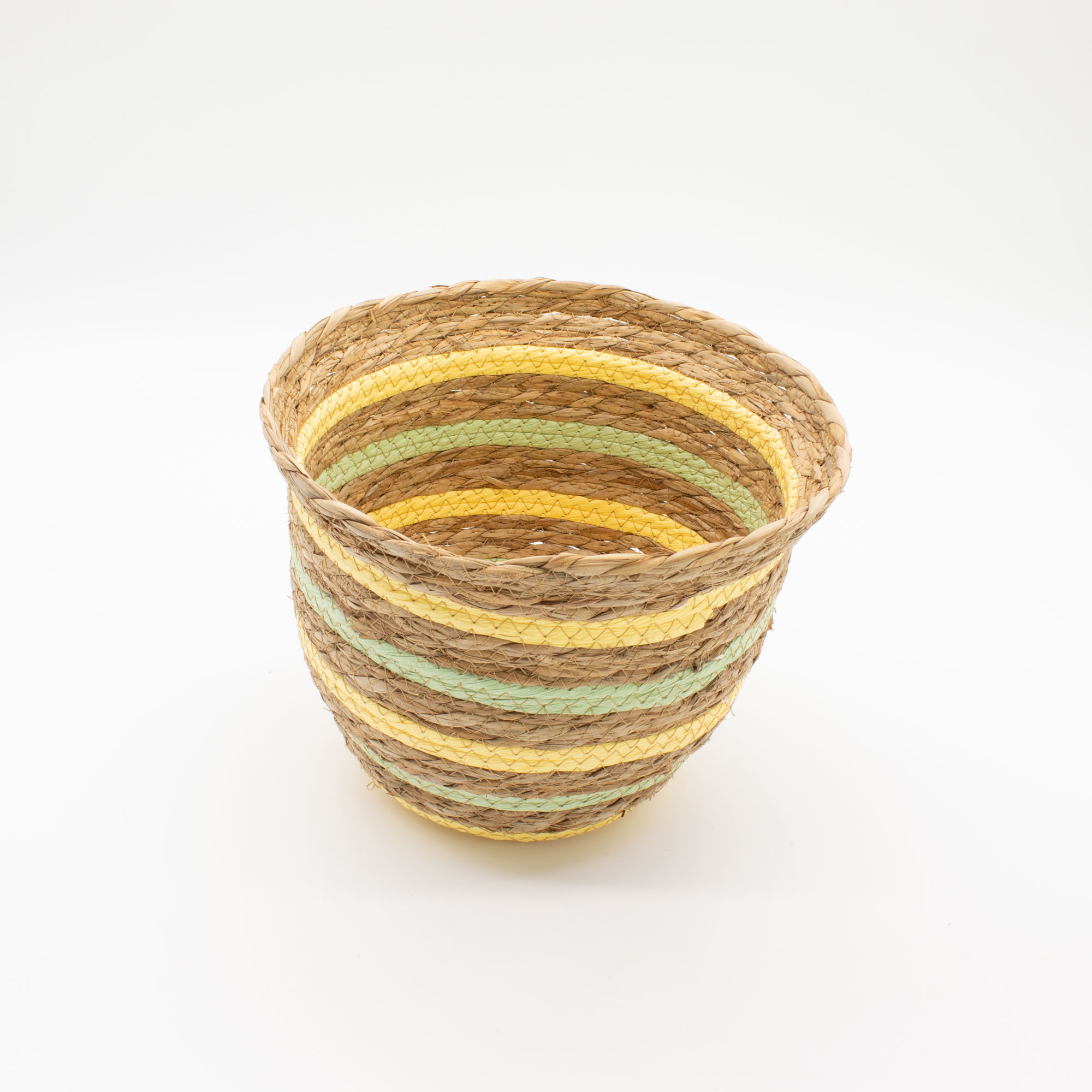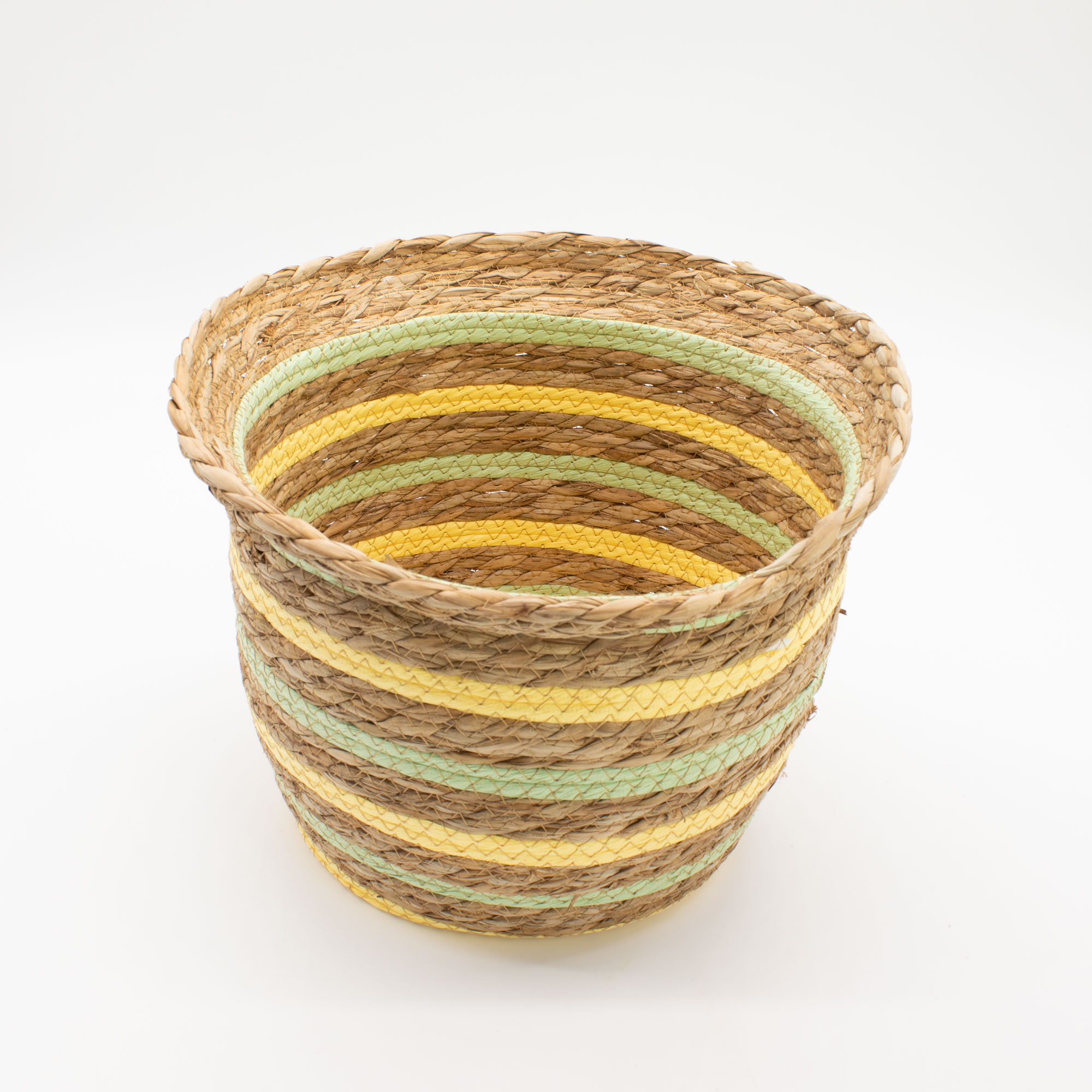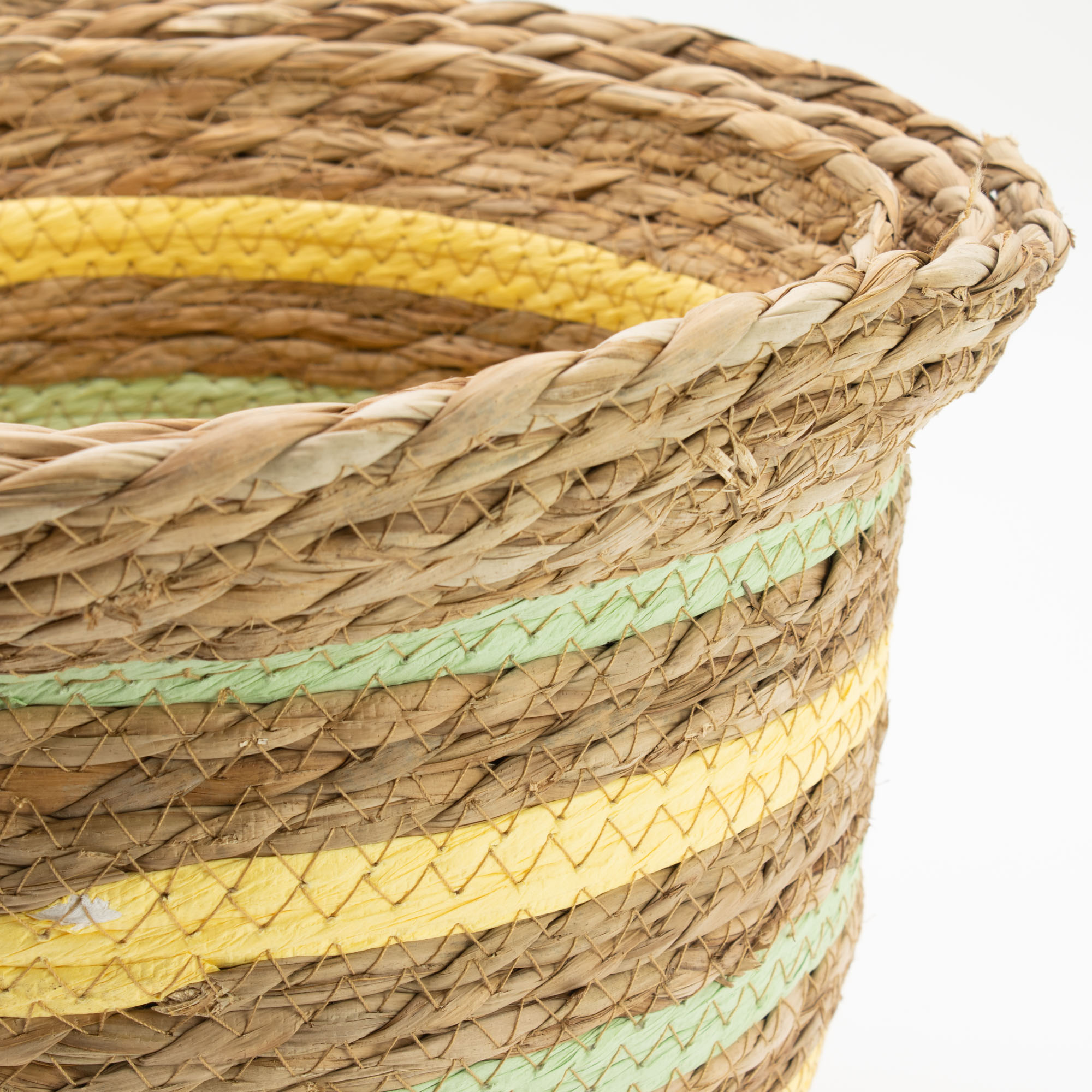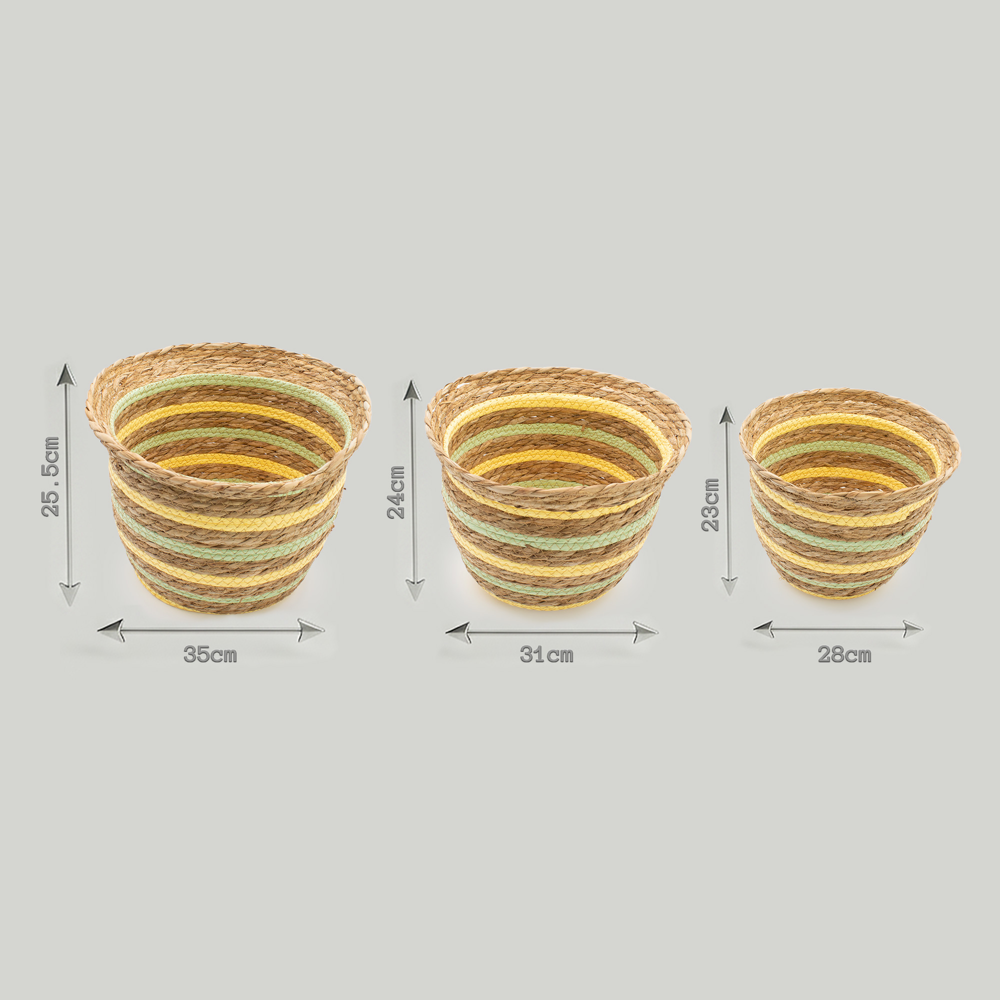 This set of vase-shaped storage baskets is crafted from tightly woven seagrass and straw fibres, formed using a traditional coiling method that creates a strong yet lightweight structure. The gently rounded silhouette combined with soft yellow and green stripe accents gives the baskets a warm, natural character while making them ideal for storing textiles, plant pots, accessories, or everyday household items.
