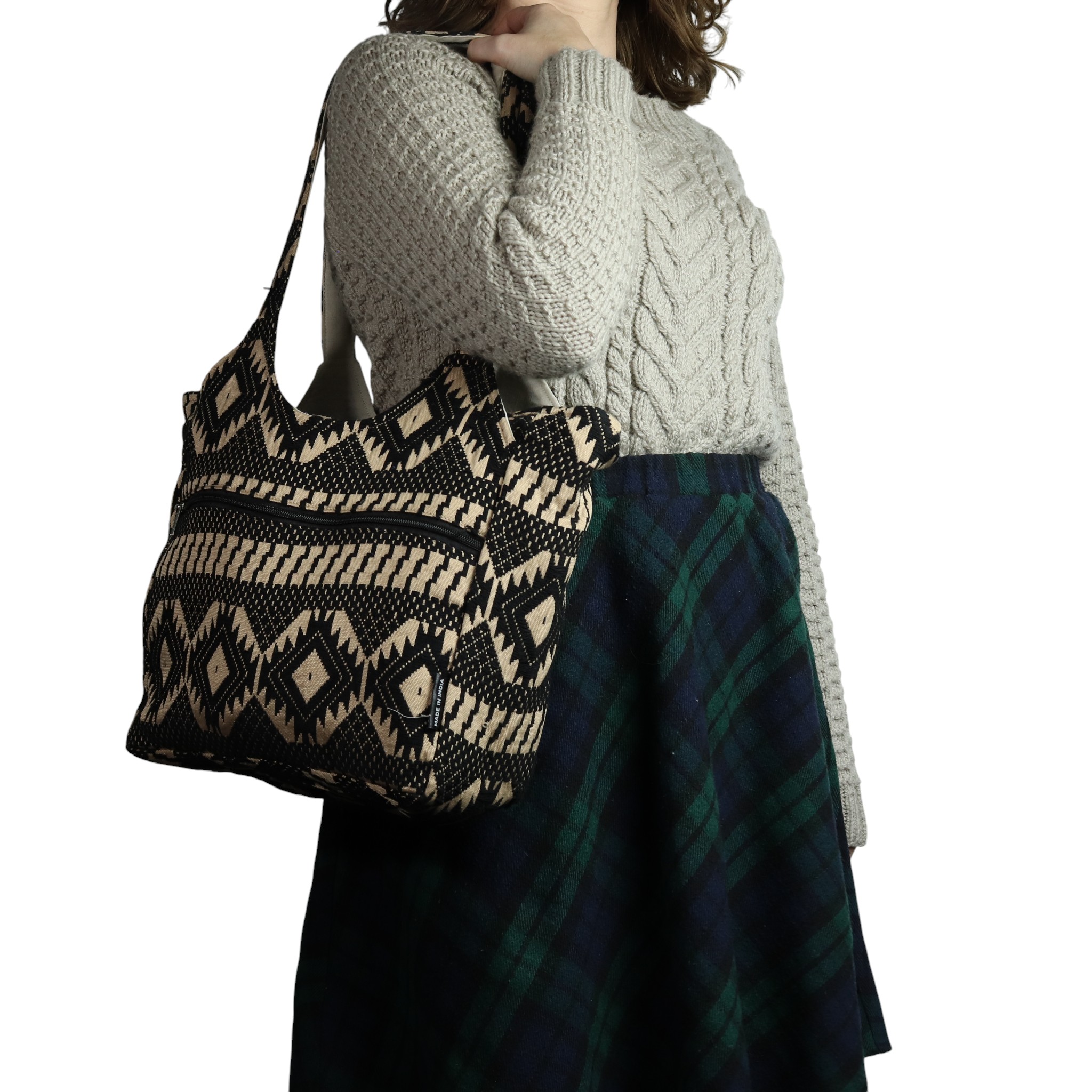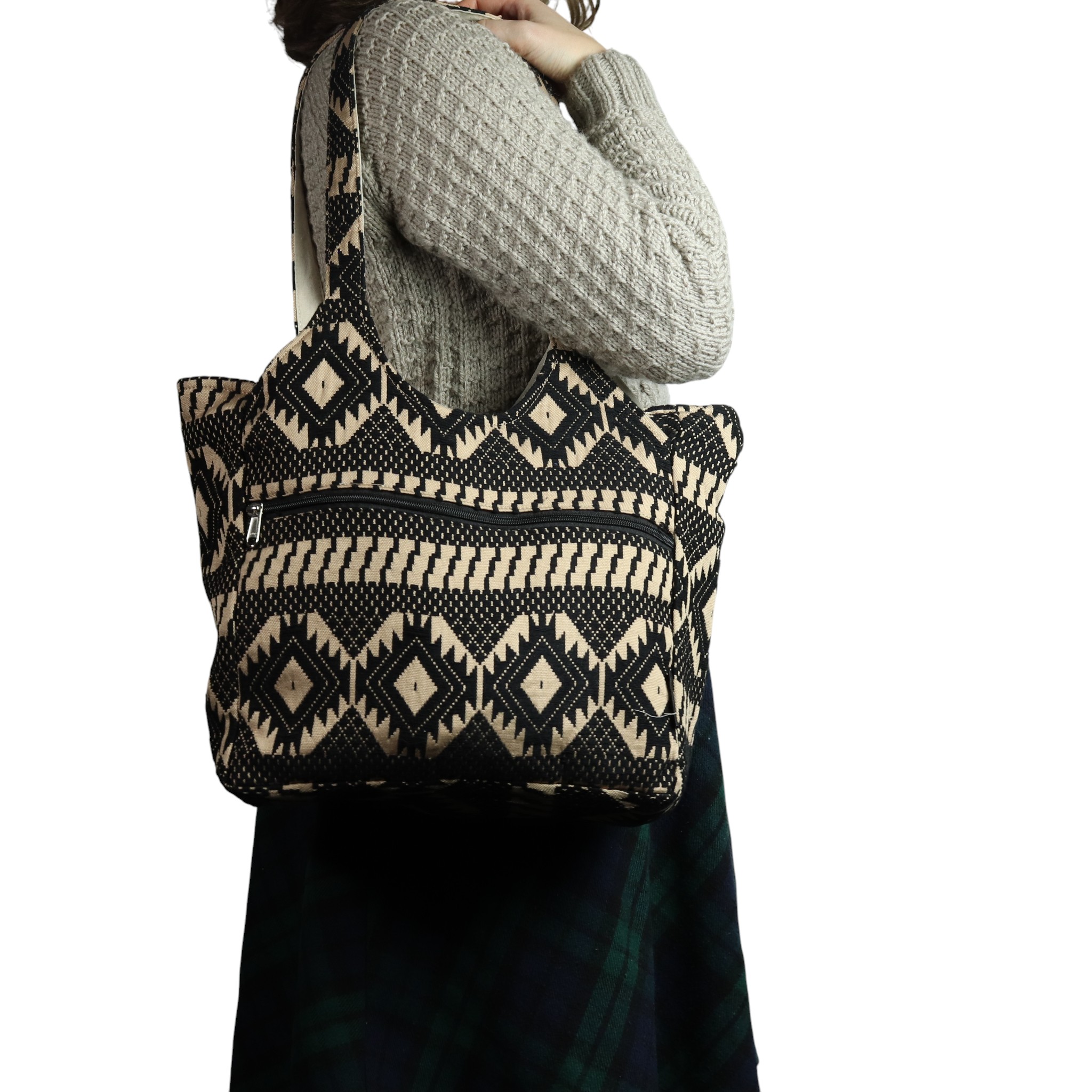 This bag has earthy tones and a bold tribal-inspired jacquard weave, creating a look that’s effortlessly stylish and practical. With its spacious structure and soft woven texture, it’s made for everyday adventures, from markets to weekend getaways.