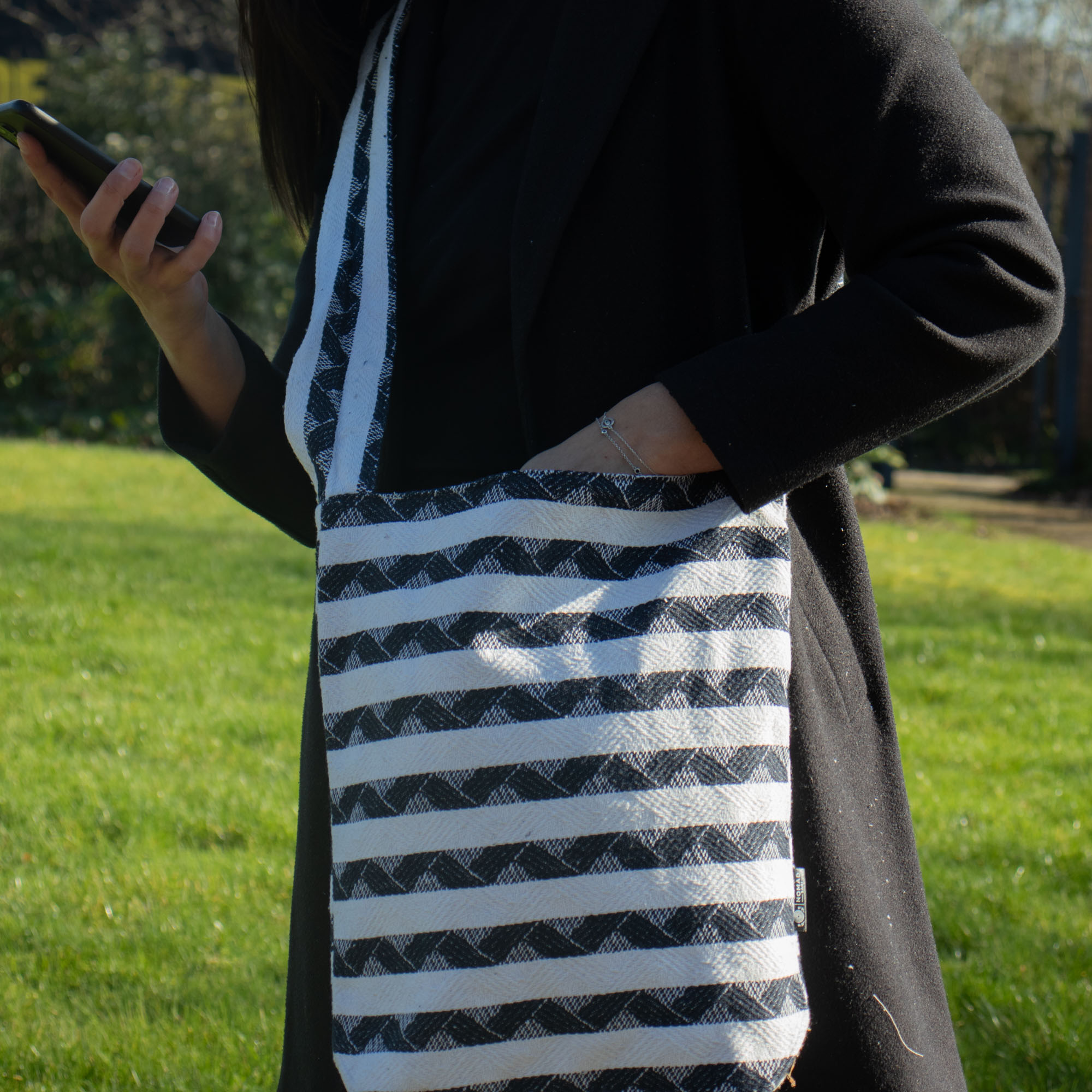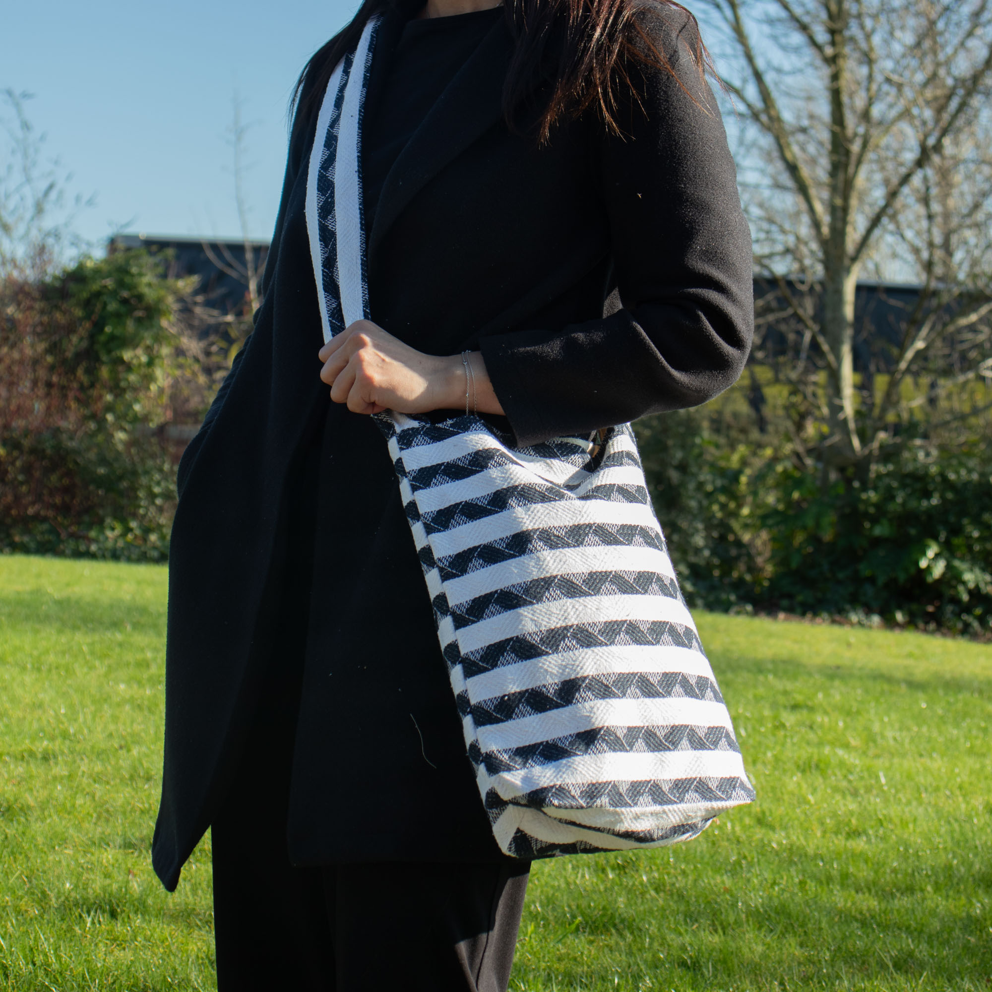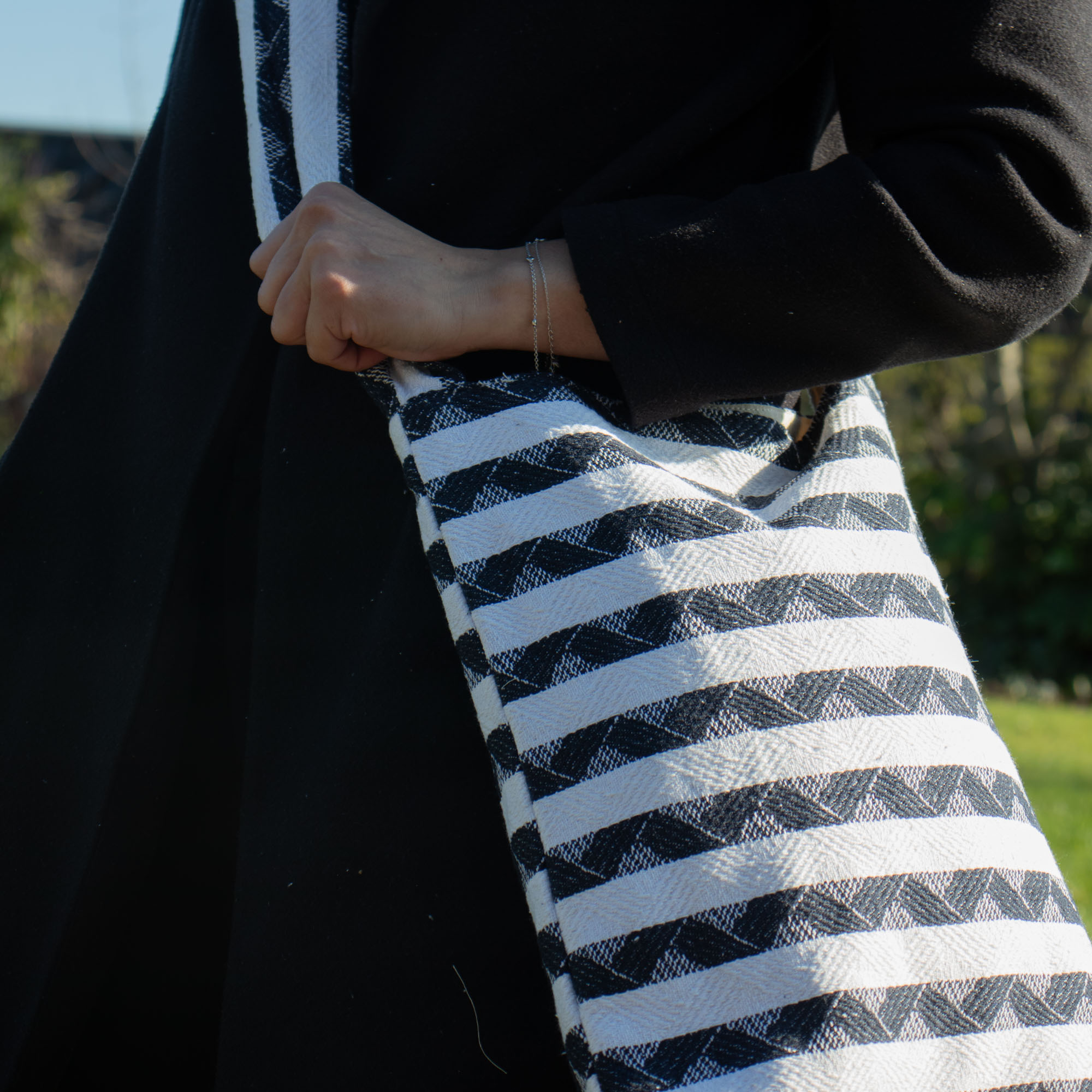 Simple, spacious, and effortlessly stylish — the Atlas Nomad Carryall is the go-to everyday bag. Featuring a classic black-and-white jacquard stripe pattern, it’s perfect for those who appreciate functional design with an artisan touch.