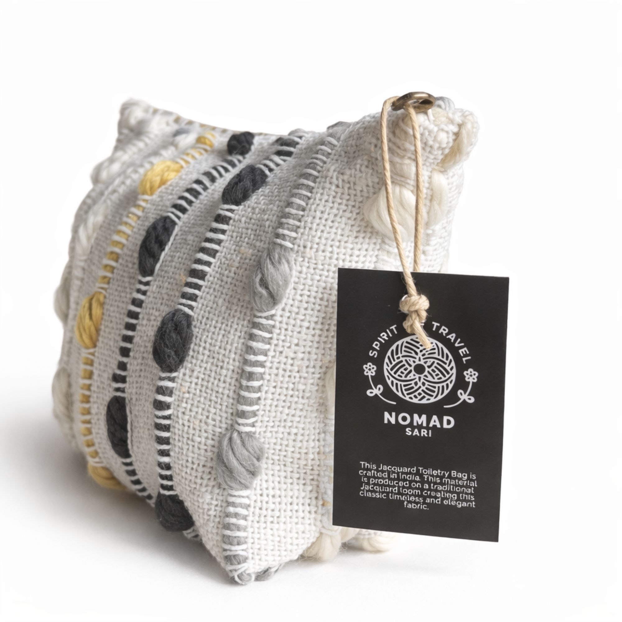 The Nomad Sari Indian Jacquard Toiletry Bag in Hippie Knot is one of those pieces that instantly brings a sense of personality and handcrafted charm to a retail shelf. Made in India from 100% cotton, it features a striking heavy-weave base decorated with vertical stripes and hand-tied knots in mustard, charcoal, and cream. This isn't just another printed pouch — the 3D texture and chunky feel make it a tactile experience that screams "artisanal quality" the moment a customer picks it up.