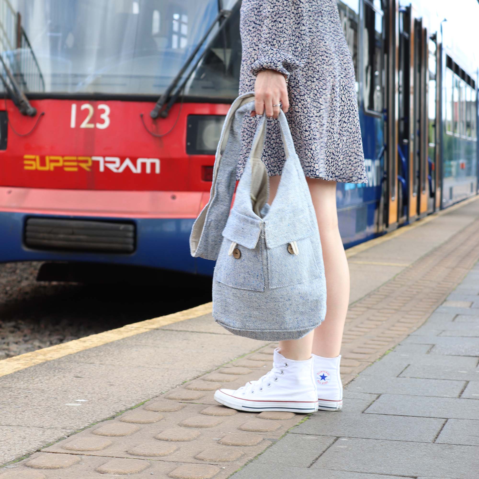 Two front pockets keep smaller essentials organized and easily accessible. The bag features long shoulder straps that allow for comfortable carrying over the shoulder or by hand.